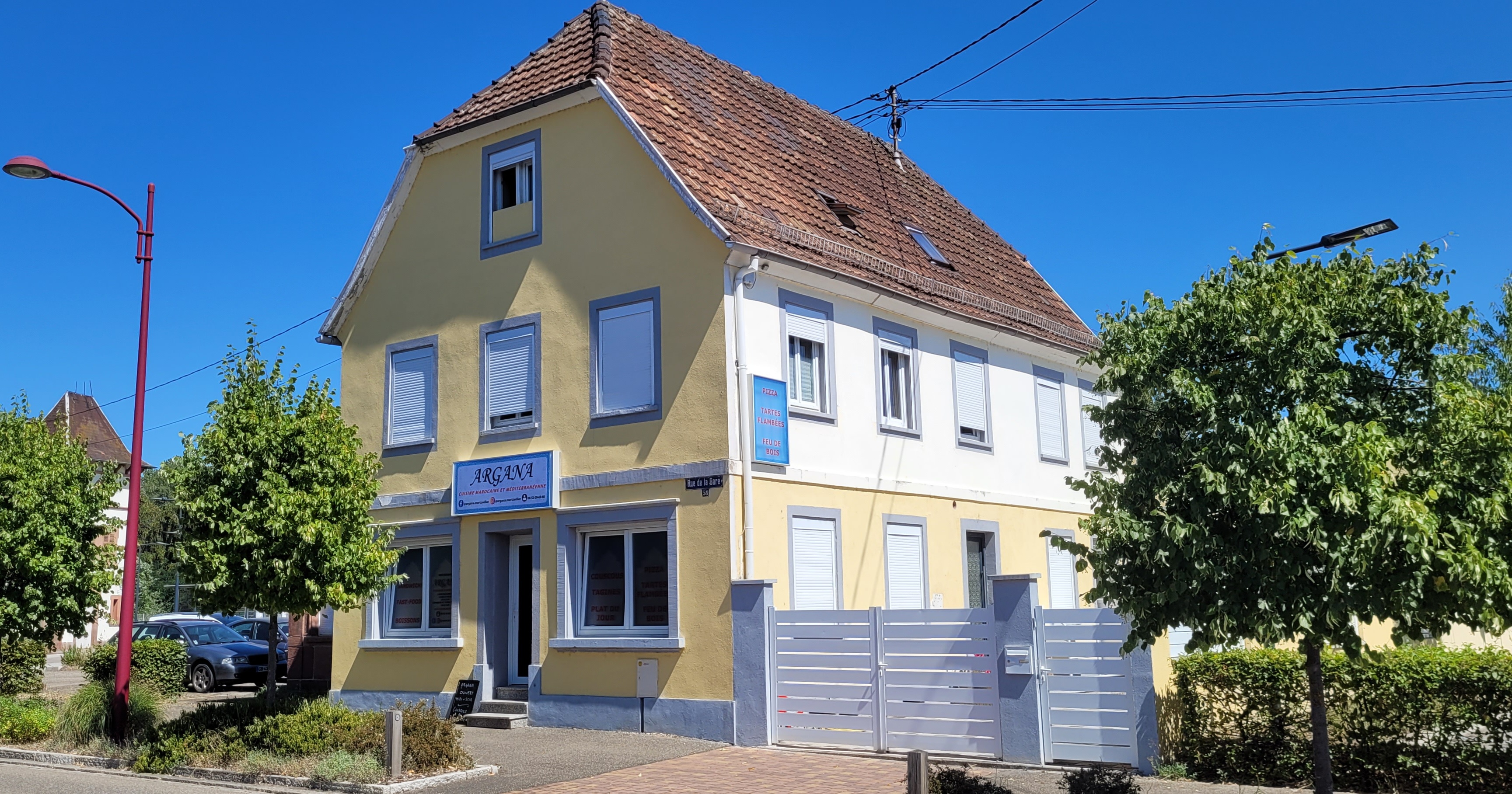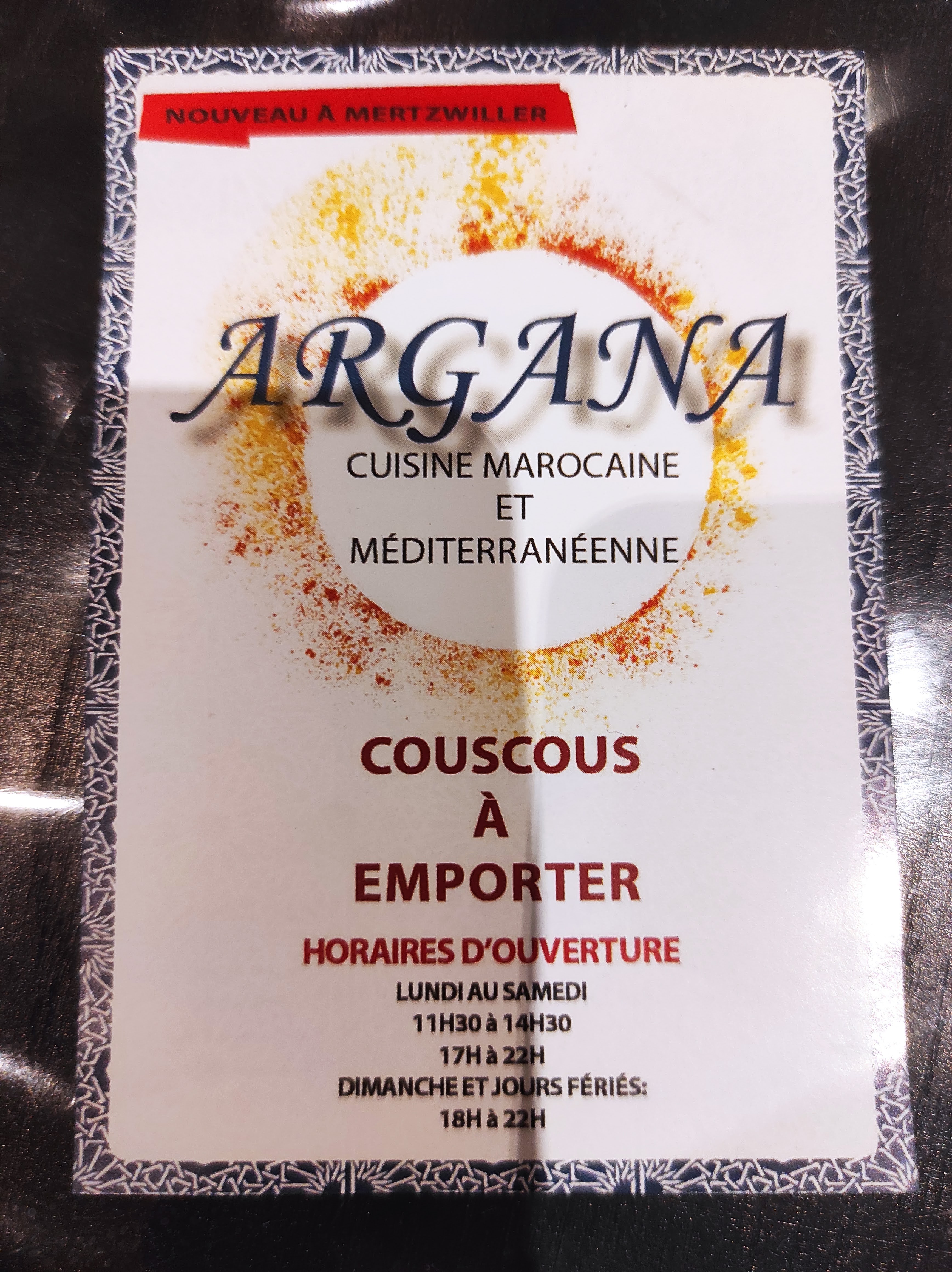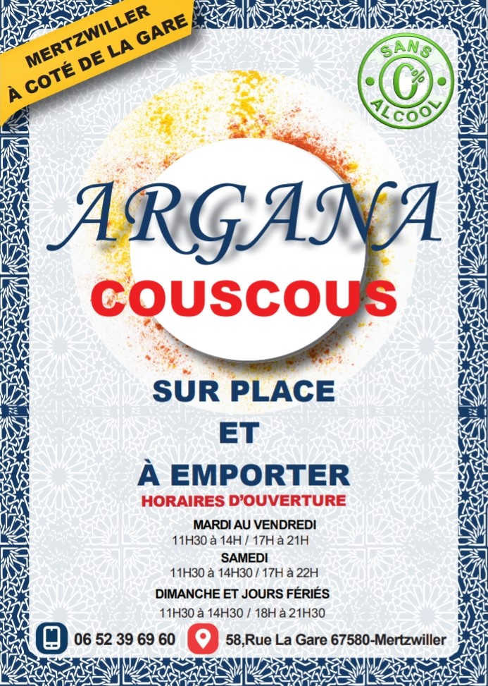 Une envie de vrai couscous « maison » amène à une très bonne adresse à découvrir dans la région : L’ARGANA à Mertzwiller. J’ai eu la chance avec ma femme d’y arriver avant l’heure de chercher nos couscous en ce samedi midi. Pourquoi une chance d’être en avance ? C’est que nous avons pu discuter avec les patrons qui tiennent cet établissement dans une ancienne maison historique de Mertzwiller (usine Vestra). Cette conversation a été un vrai plaisir, comme il y en a trop peu de nos jours. Nous ne pouvions pas rester plus longtemps car la dégustation de nos couscous urgeait pour nous tellement nos papilles étaient en émoi. Tout est fait « maison » avec des produits de belle qualité (semoule, légumes viandes) et la sauce est sublime. Le couscous royal à 16 € est d’un rapport qualité/prix/quantité inégalable. Nous n’avons pas pu finir en une fois, la quantité étant bien là. Ce n’est pas grave, nous aurons le plaisir d’en remanger. Cette enseigne permet de changer de toutes les offres qui se déploient tout autour. L’Argana est dédié au couscous (en attendant les tartes flambées et pizzas pour ceux qui n’aiment pas le couscous), et c’est un gage de sérieux pour un tel restaurant sans devoir aller jusqu’à Haguenau. Je précise que nous ne sommes pas de la famille des restaurateurs de l’Argana et que nous n’avons pas de parts financières dans l’affaire !!! Non, sans rire, testez-le, c’est un établissement qui mérite votre passage pour déguster le couscous et il est certain que vous y reviendrez comme nous.
