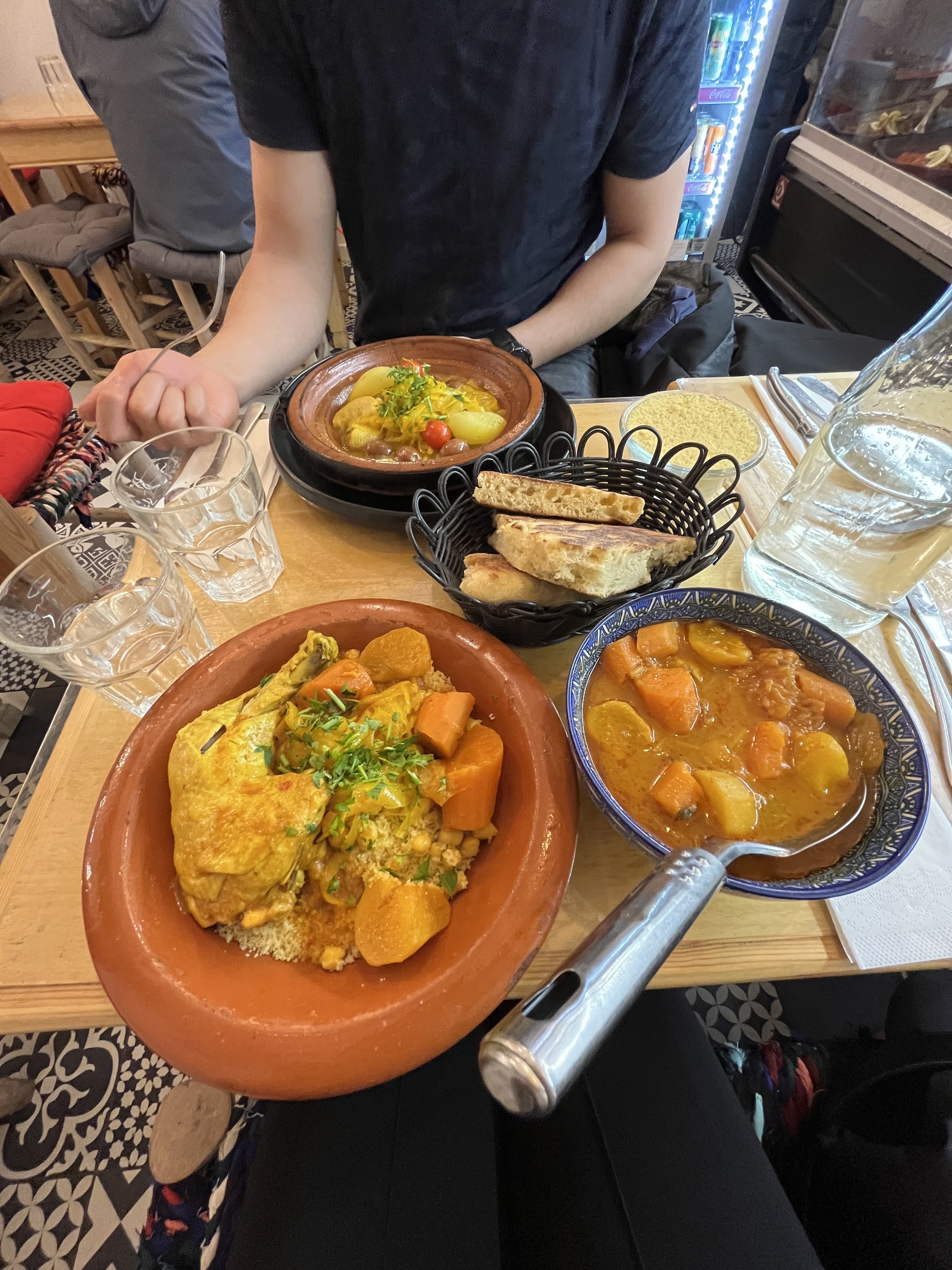 Endroit convial et très bien décoré ! Le seul bémol est pour la place et la taille des tables et des tabourets : typique parisiens, serrés l'un à l'autre et table pas assez grande pour poser aisément les plats. Très bon tajine et entrées, mon amie et moi avons moins apprécié le cous cous car la semoule était trop fine et la sauce légèrement fade, mais pour le reste c'était très bon et fidèle à la culture marocaine. Je recommande !