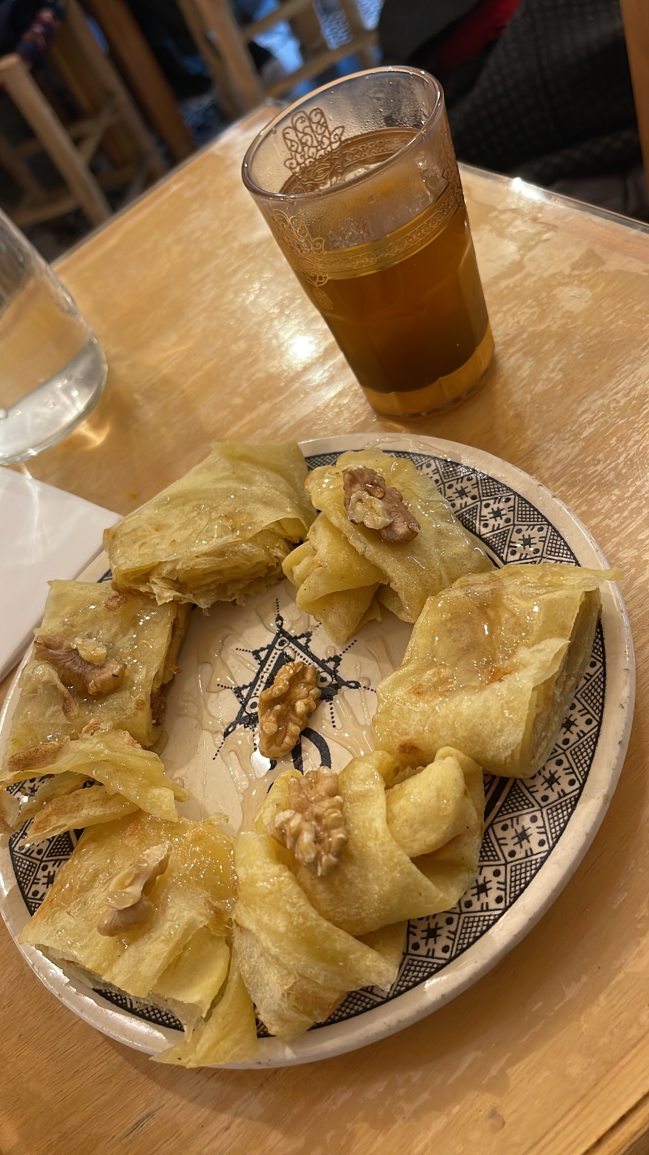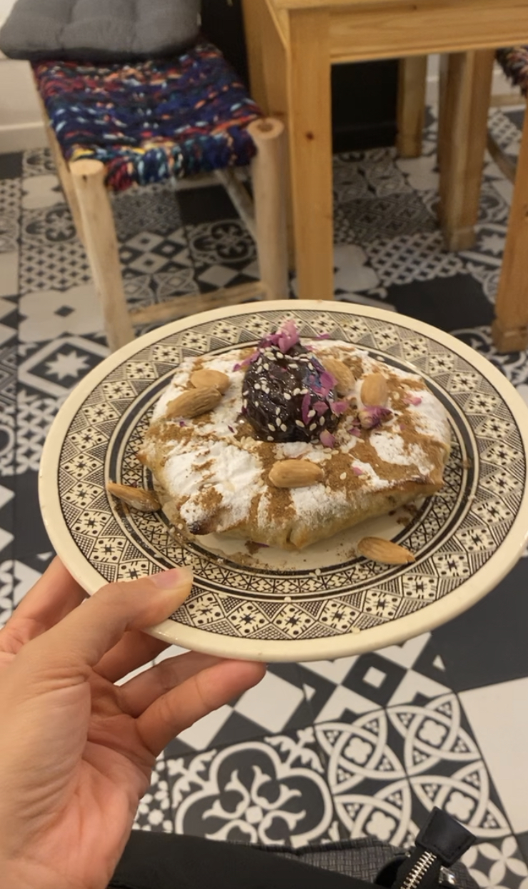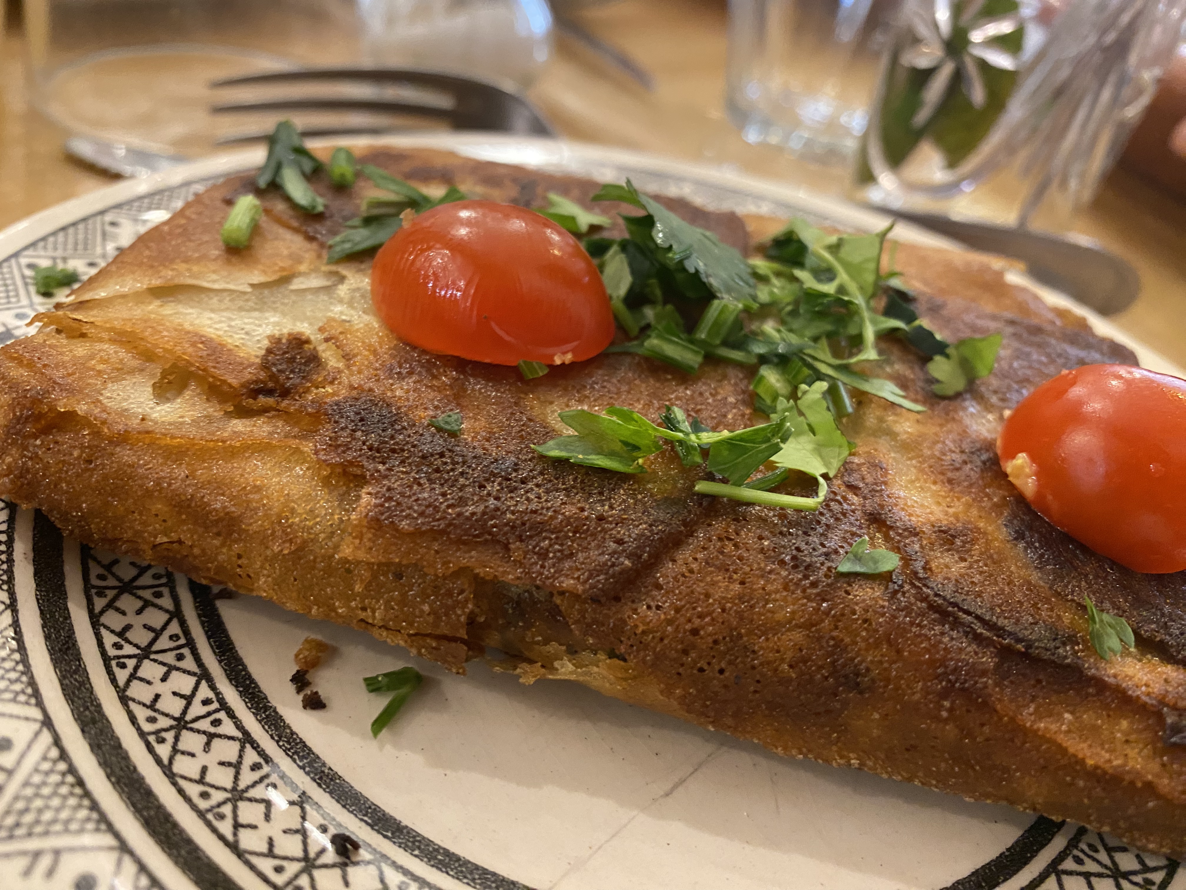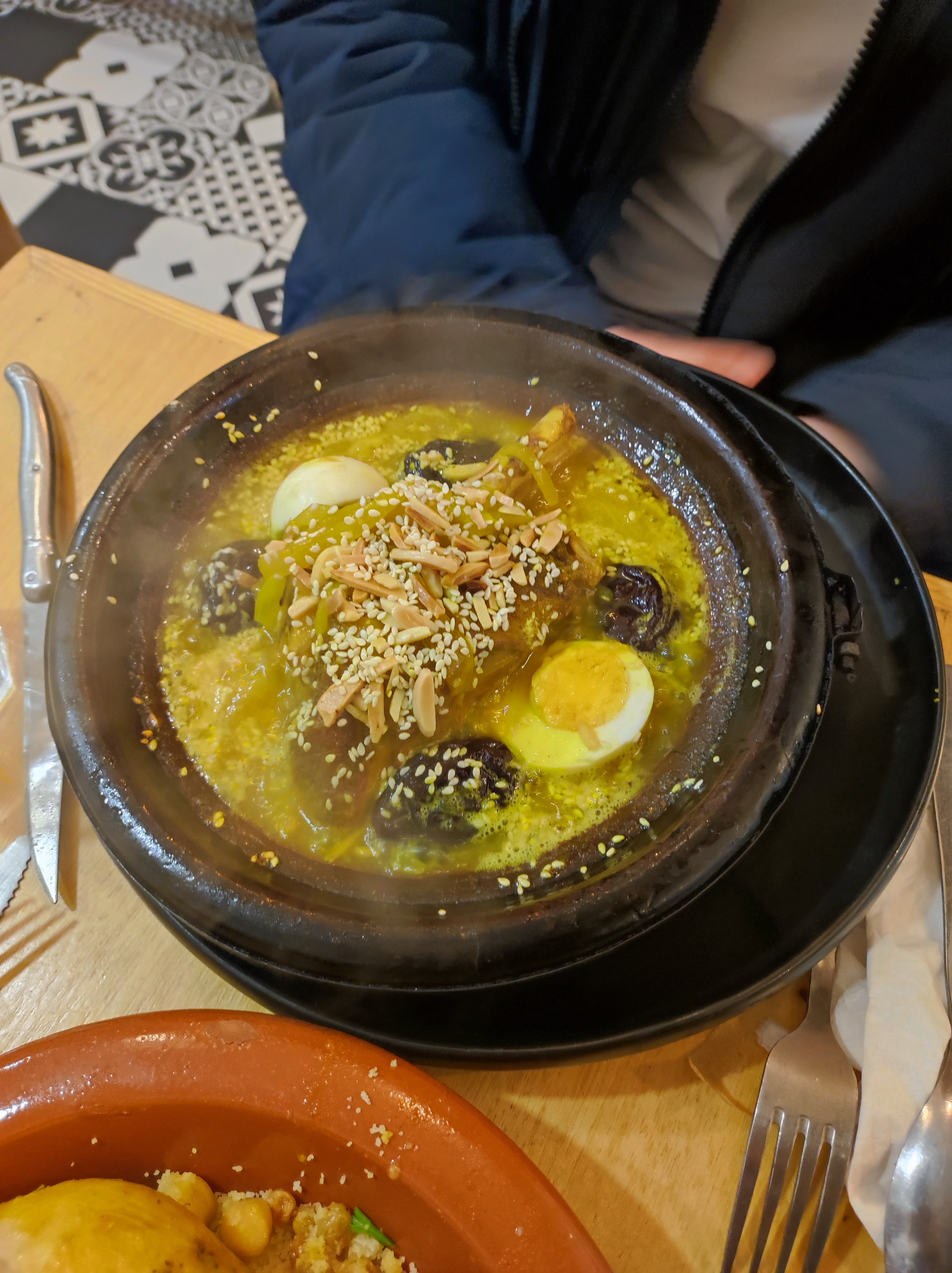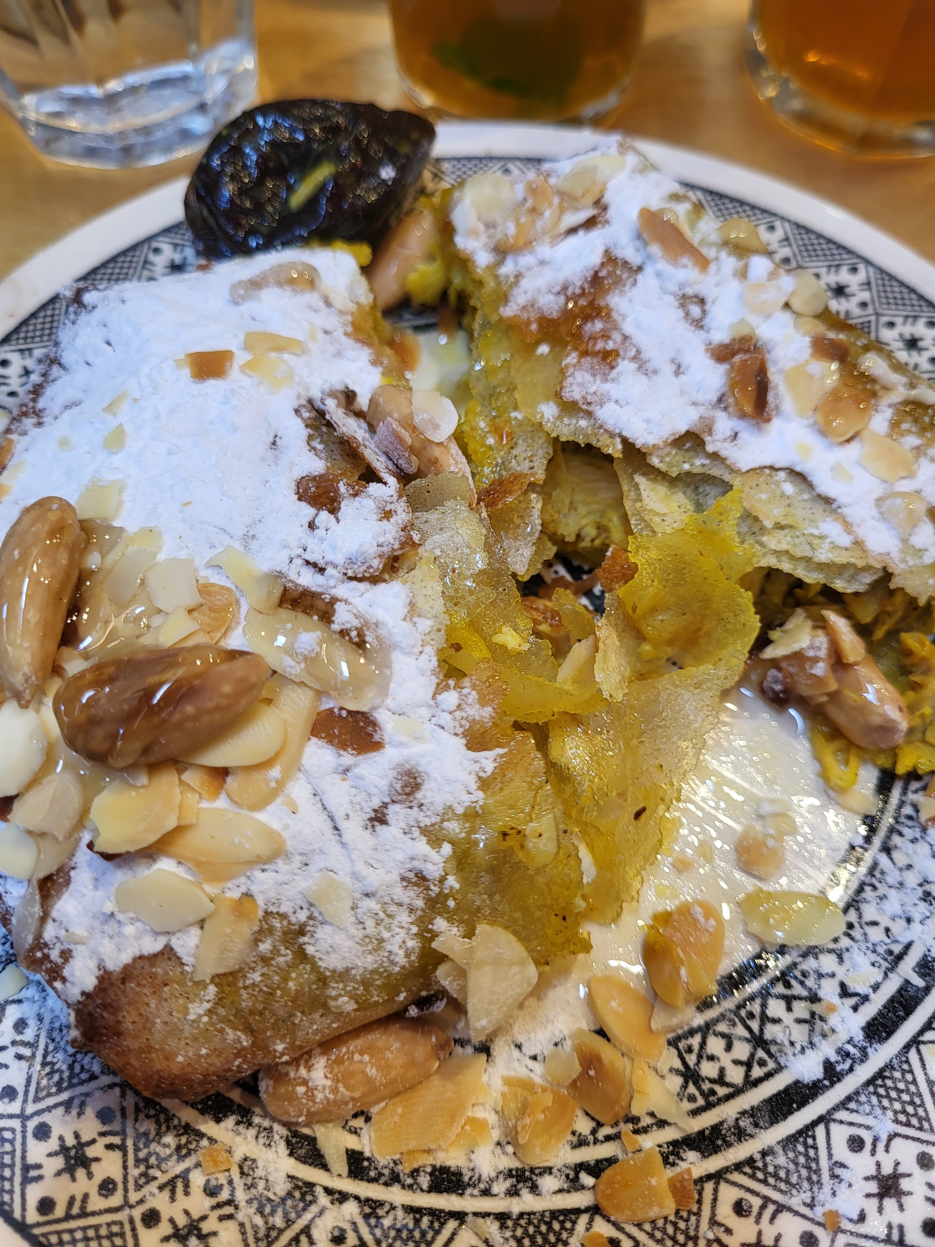 La pastilla poulet était excellente, l'equilibre sucré/salé très bien maîtrisé. La brick au poulet aussi était vraiment très bonne. En plat on a pris une rfissa et un tajine au poulet. Un sans faut pour ce resto. On nous a même offert un bol de bessara (soupe de pois cassés). Pour finir sur une petite note sucrée on a fini avec une théière.
