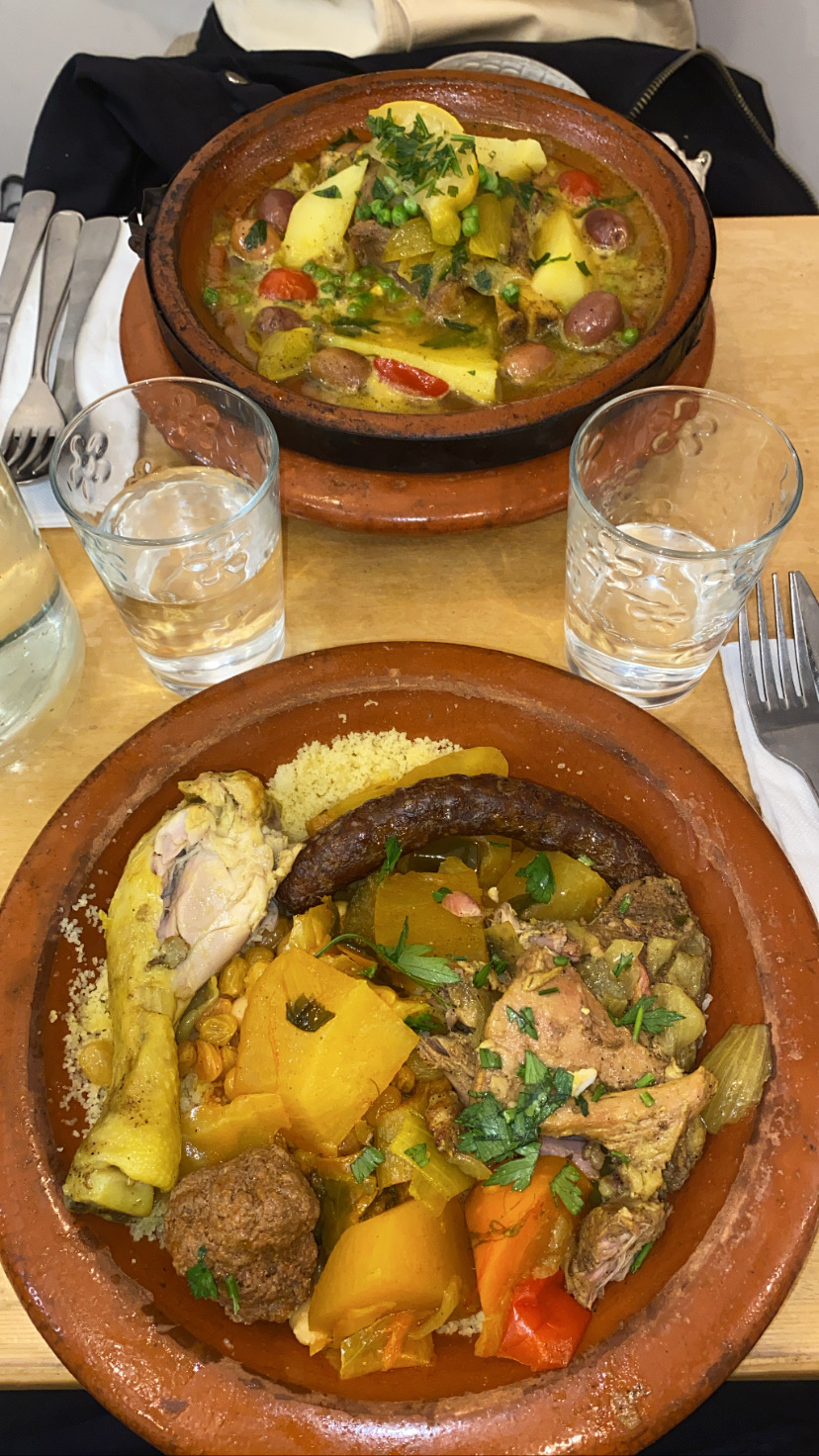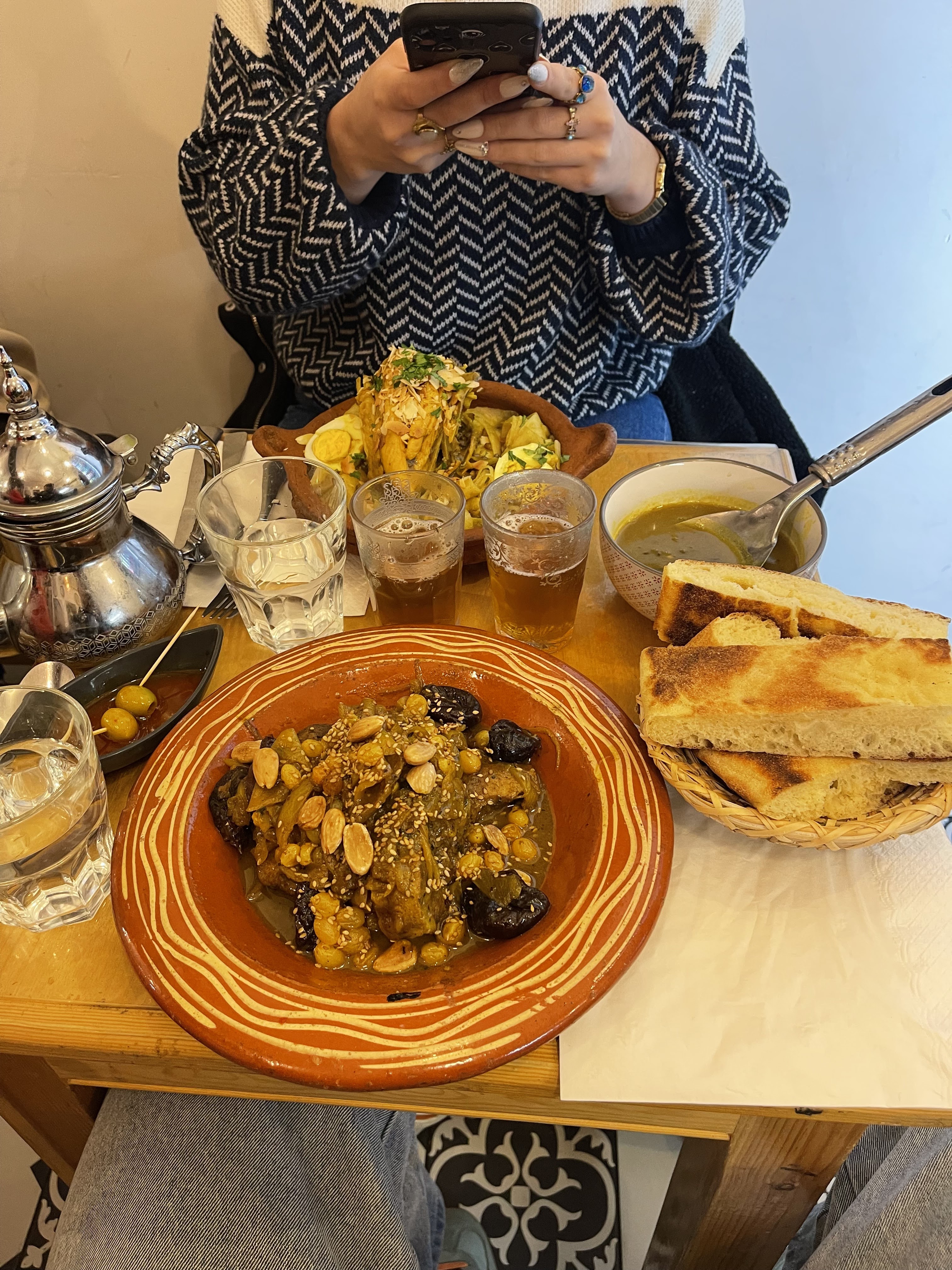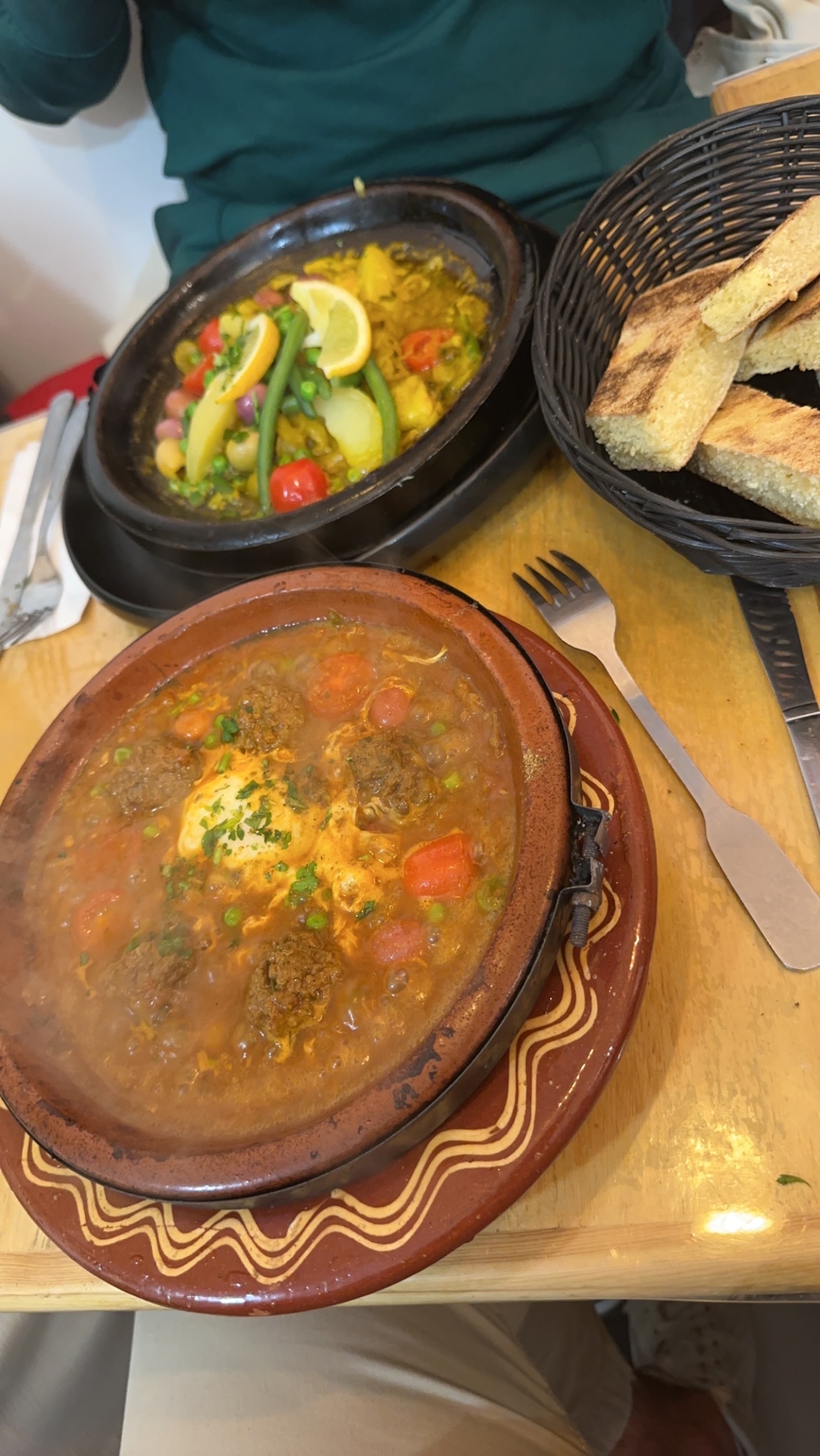 On voulait tester les plats incontournables de la maison, et donc une tanjia et la Mrouzia, Tanjia était bonne, le goût est là. Mais, la qualité de la viande n'est pas au rdv! Un morceau de bœuf sec, pas fondant! Pour la Mrouzia, très très très sucrée! (Je suis Marocaine, et sorry cela ne ressemble pas du tout à une Mrouzia). NE LA TESTEZ SURTOUT PAS. On a dû faire la file pour une bonne 20 mins, puis attendre presque une heure pour qu'on soit servis! Les serveurs font de leur mieux! Bref, c'est un resto HUGELY OVERRATED 🙃