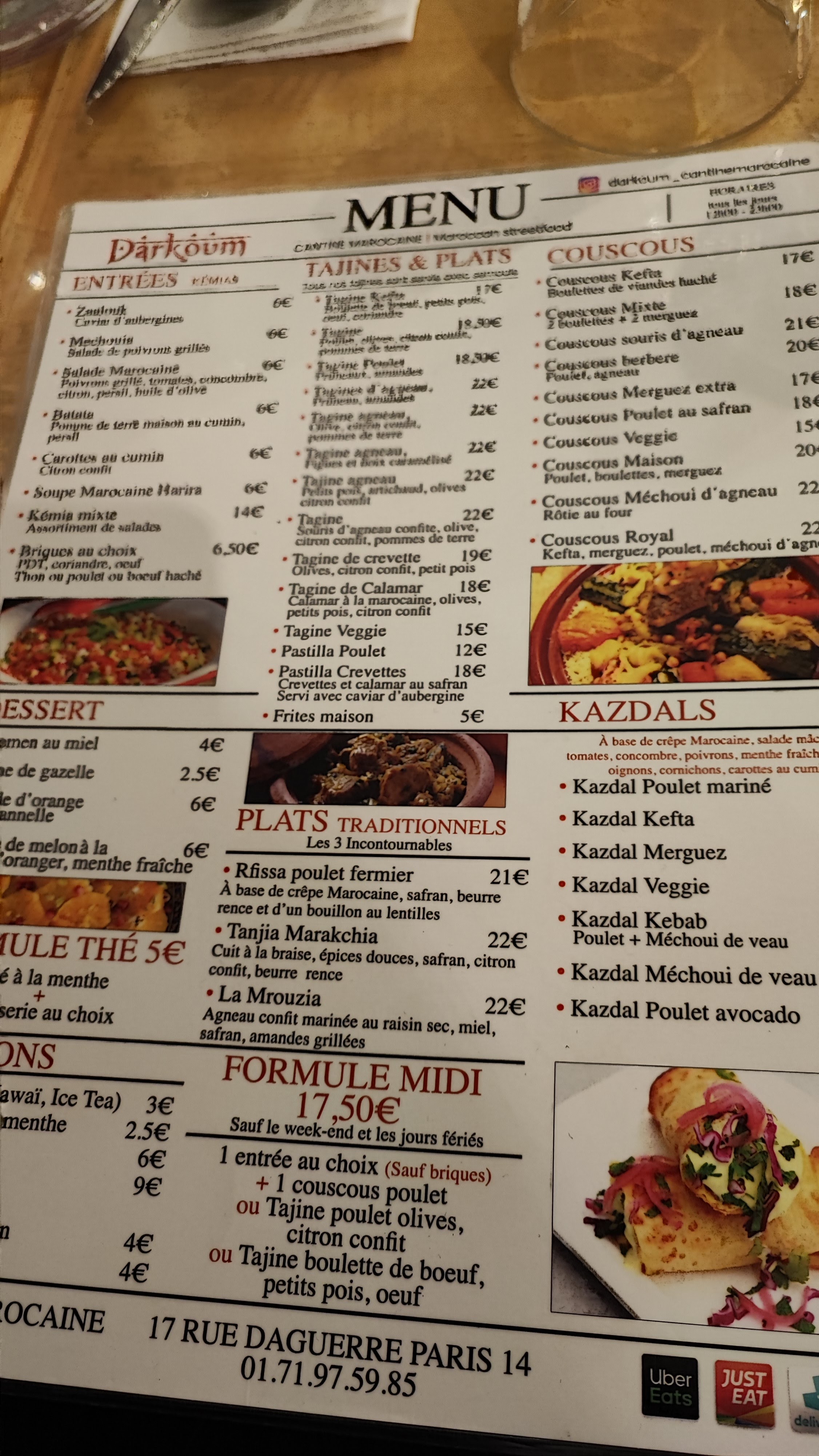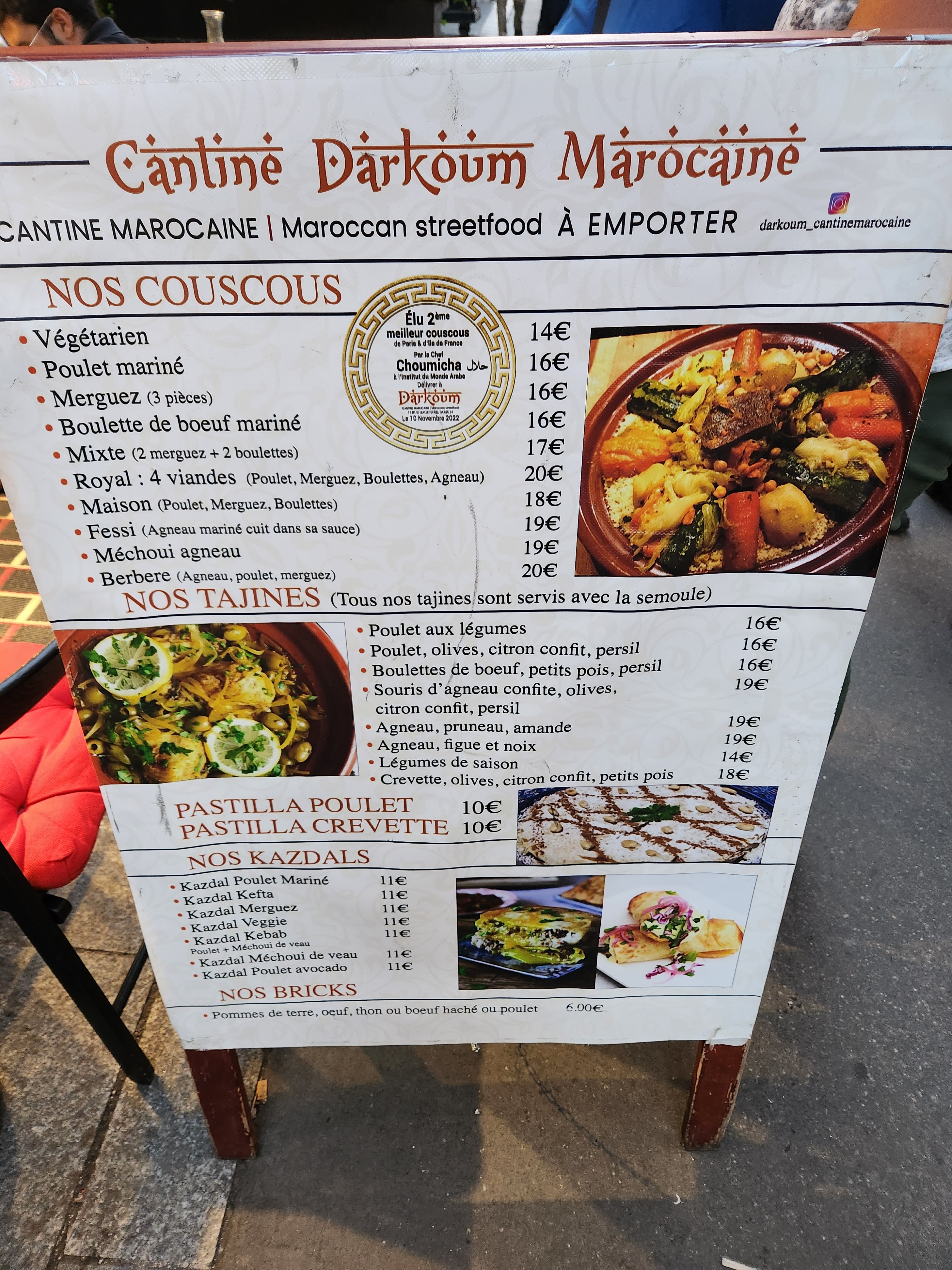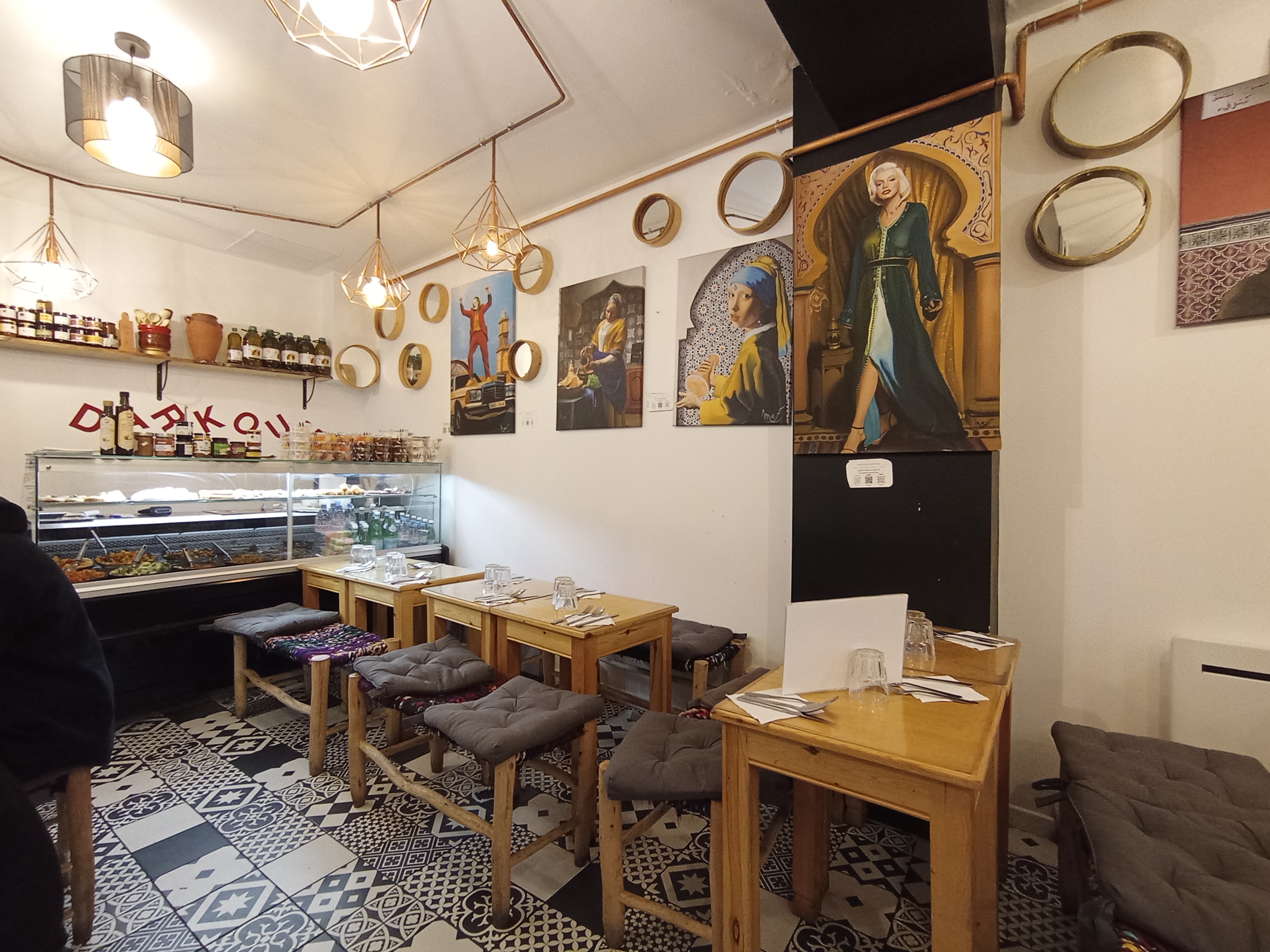 Me baladant dans le quartier, je tombe par hasard sur ce restaurant, Darkoum dont j’ai entendu parler sur les réseaux sociaux. Mon scepticisme de native et ancienne habitante du Maroc me fait hésiter sur la qualité et hautenticité et que rien ne vaut les plats maison. Je commande tout de même un couscous royal à emporter pour tester et j’ai été très agréablement surprise, la semoule est fine, savoureuse est cuite dans la tradition, légumes fondants, l‘agneau poulet tendres cuit à la perfection, les portions généreuses pour une personne ( il en reste pour ce midi ). Petit bémol sur la salle de restaurant exiguë et bondée qui ne donne pas envie de déguster sur place. Prix correct pour la qualité.