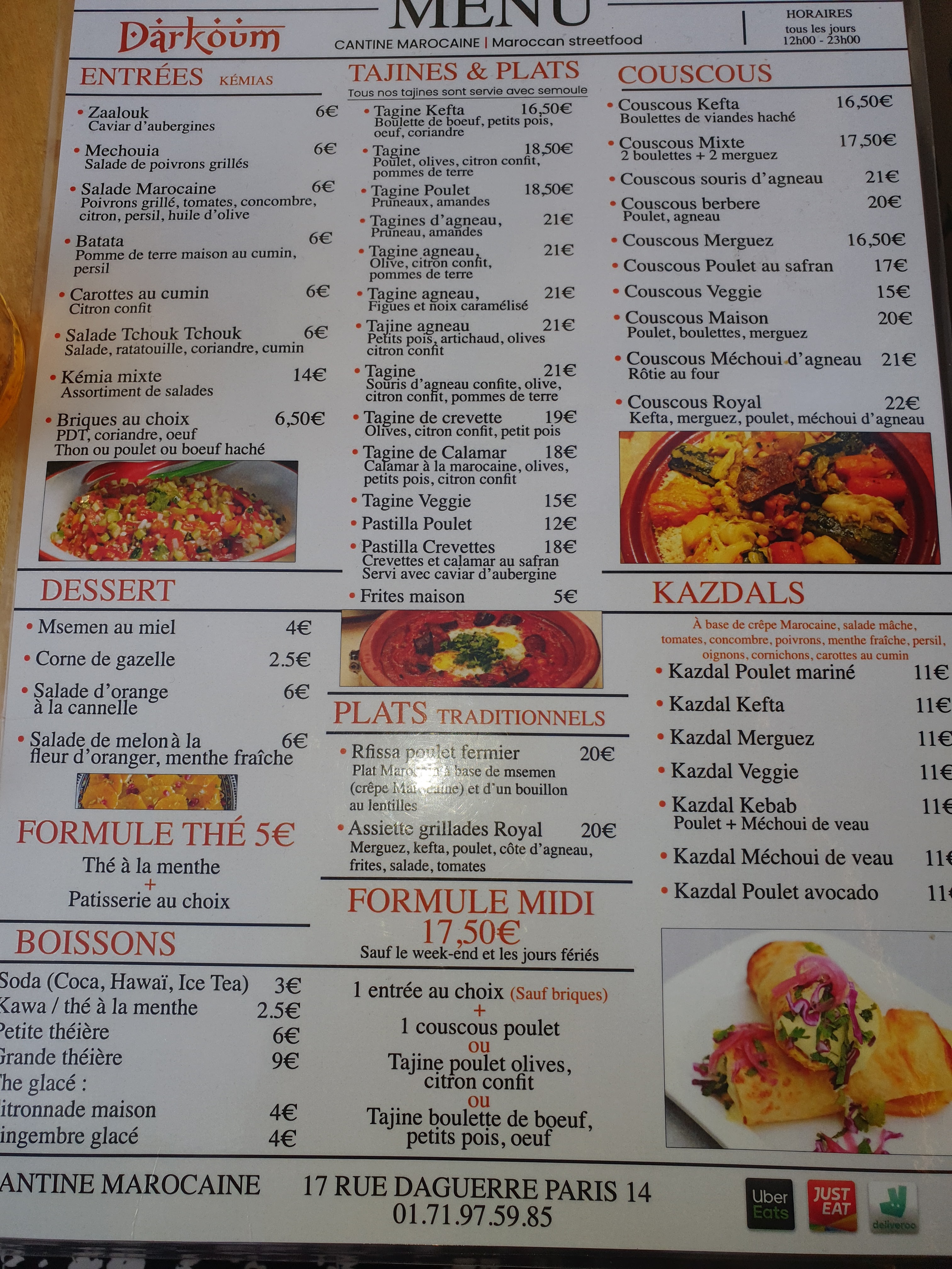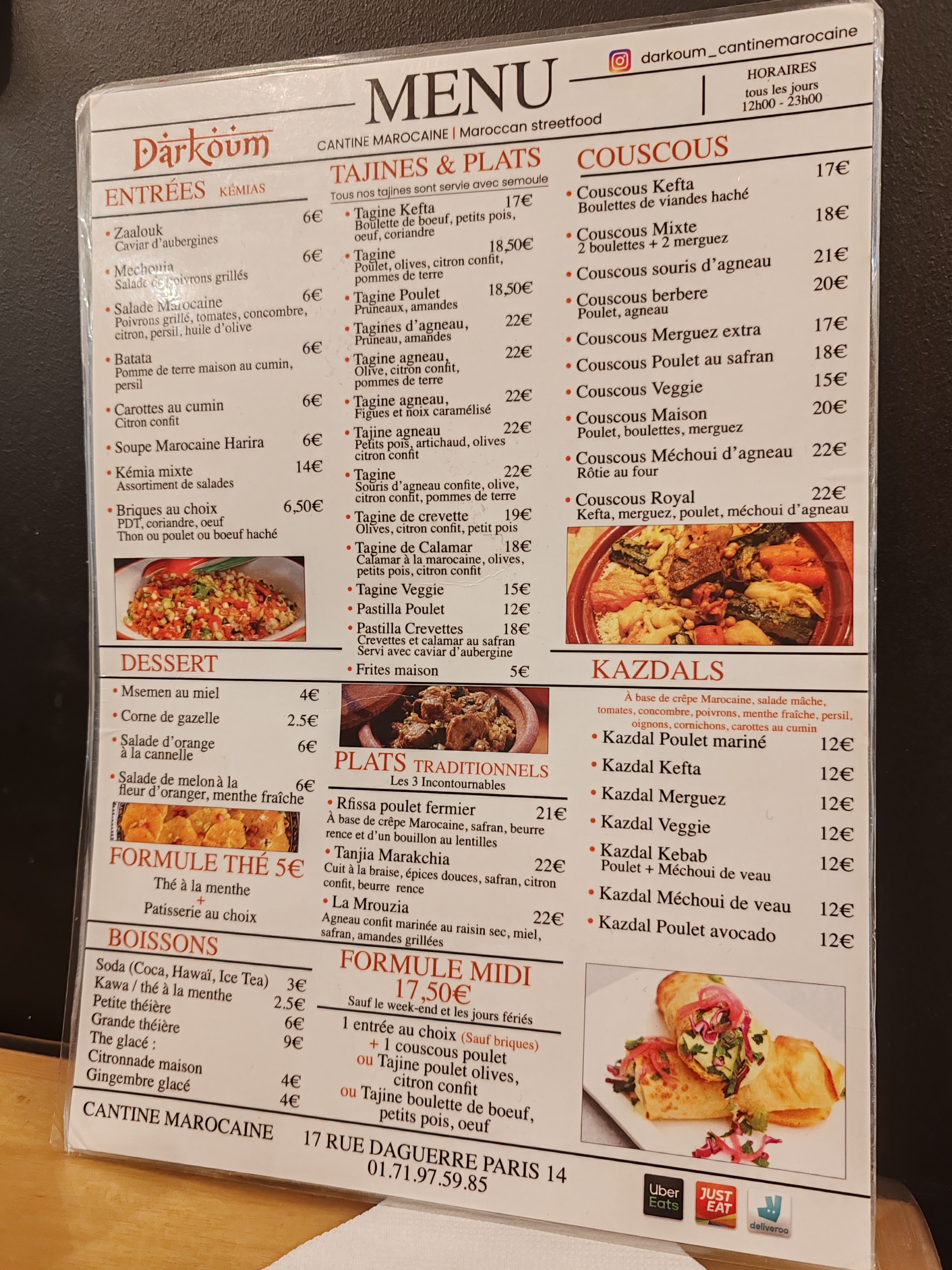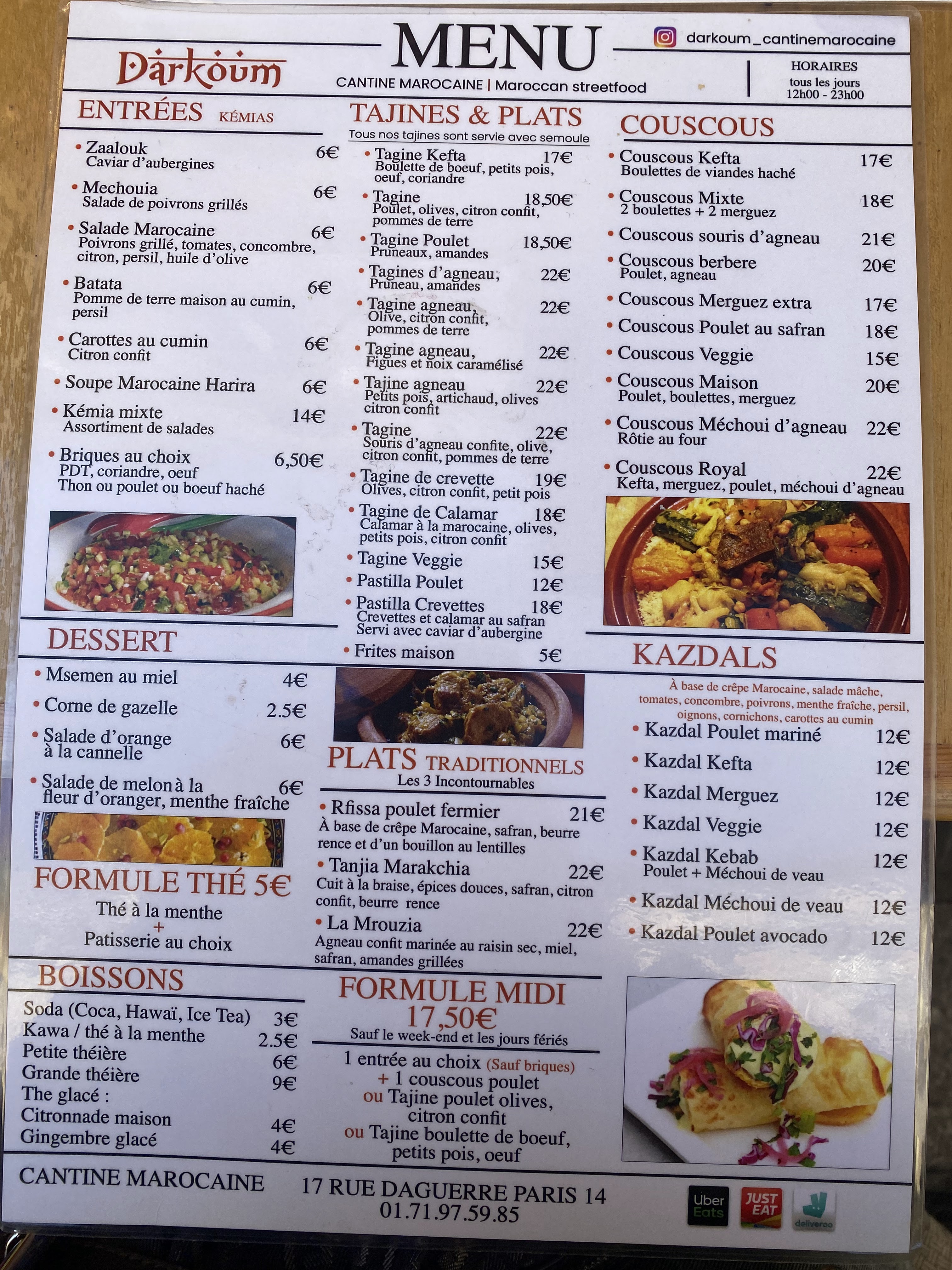 Me baladant dans le quartier, je tombe par hasard sur ce restaurant, Darkoum dont j’ai entendu parler sur les réseaux sociaux. Mon scepticisme de native et ancienne habitante du Maroc me fait hésiter sur la qualité et hautenticité et que rien ne vaut les plats maison. Je commande tout de même un couscous royal à emporter pour tester et j’ai été très agréablement surprise, la semoule est fine, savoureuse est cuite dans la tradition, légumes fondants, l‘agneau poulet tendres cuit à la perfection, les portions généreuses pour une personne ( il en reste pour ce midi ). Petit bémol sur la salle de restaurant exiguë et bondée qui ne donne pas envie de déguster sur place. Prix correct pour la qualité.