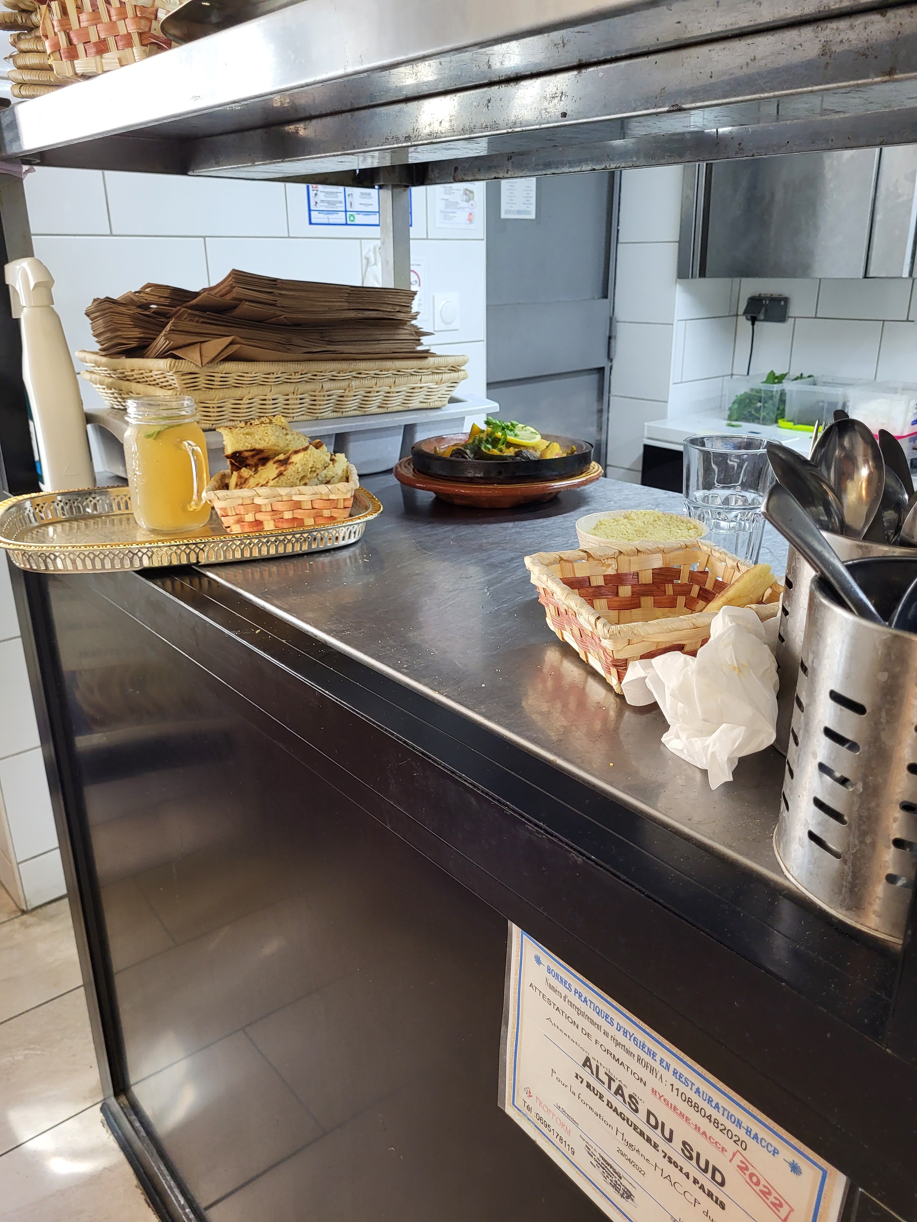 J’ai pris une formule midi un tajine au poulet et une salade de poivrons méchoui ainsi qu’un thé à la menthe. Dommage de servir du pain pas frais et rassis même réchauffé il était sec ça gâche totalement le plaisir de manger. Je ne recommande pas.