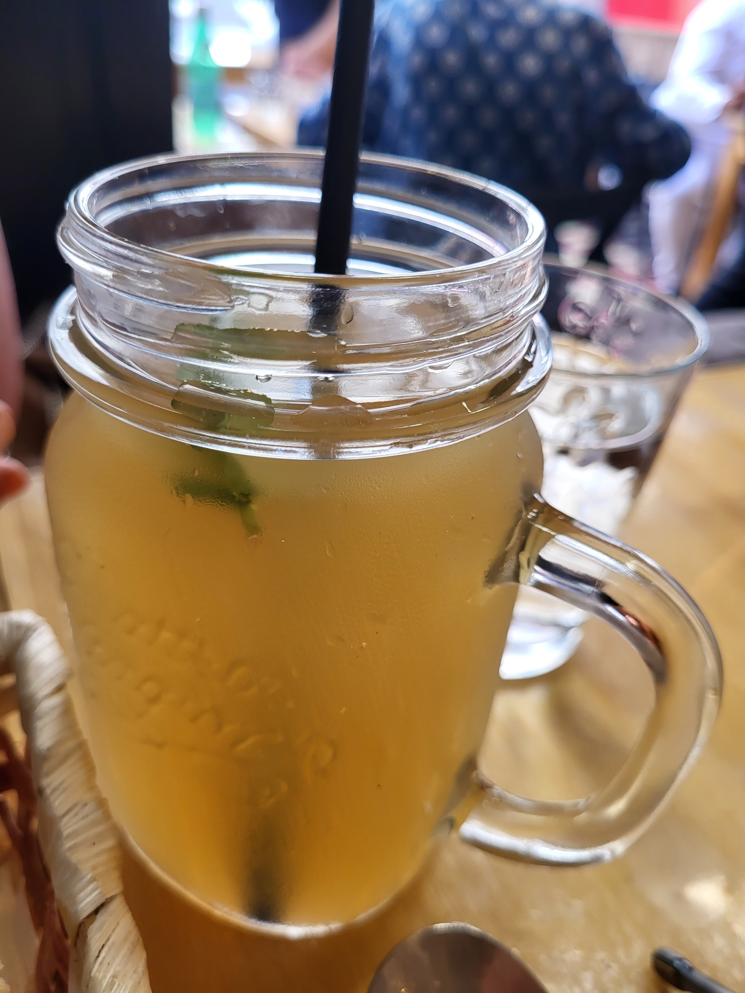 Couscous un peu sec (pas assez de soupe - sur la photo c’est un bol pour 2 personnes) et le goût n’est pas assez prononcé pour moi… Par ailleurs, le service est nonchalant et pas très chaleureux. Le monsieur ne dit pas un mot, ni merci ni svp ni au revoir, seulement des hochements de la tête. La salle n’est pas climatisée (mais il y a un ventilateur) - Couscous mixte (boulette & merguez) : 18€ - Limonade maison : 4€