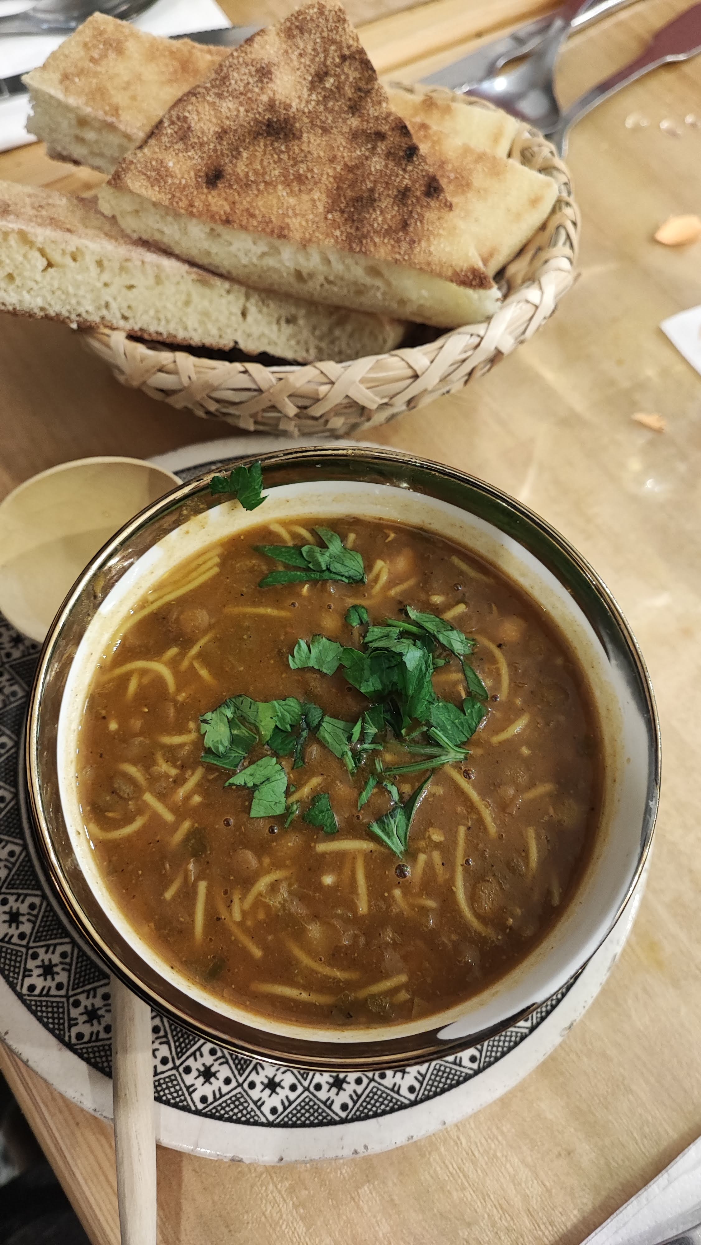 Pour les vrais connaisseurs de la soupe Harira, à éviter, c'est du concentré de tomate et 3 poids chiche rien d'autre. ( mais ça joue sur le visuel mdrrr bravo ) il manque beaucoup d'ingrédients et le goût est inexistant.et en plus de ça on paie 6.5€ pour cette soupe de tomate avec des bout de spaghetti casser dedant ... serieux.vous pouvez mentir sur les plats pour les gens qui découvrent mais en tant que marocain vous êtes loin d'être une référence de la vrai bouffe marocaine. Plus jamais..
