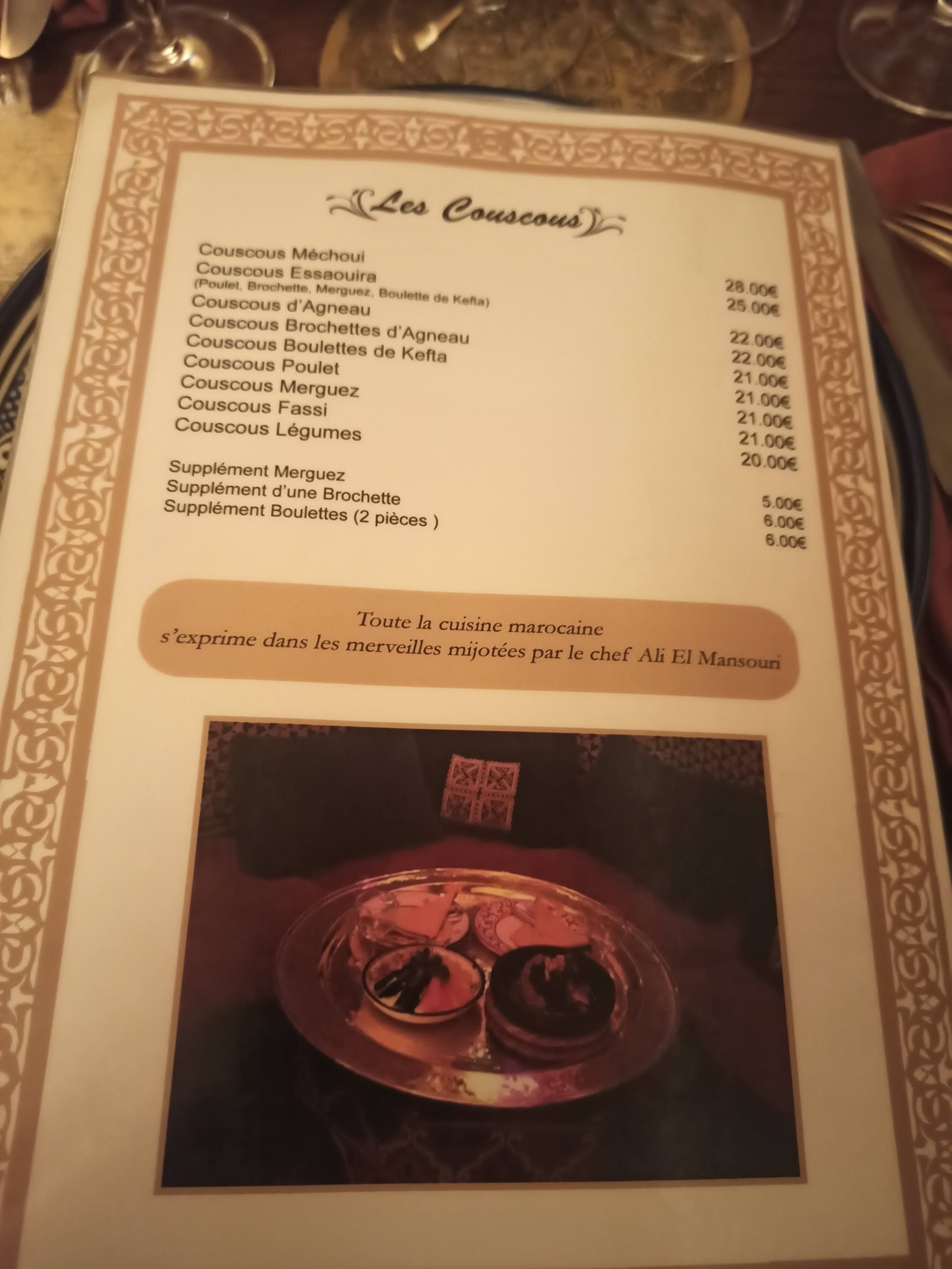 Restaurant excellent, la déco avec l’architecture marocaine m’a fais sentir chez moi au maroc, le couscous a été très bon et copieux, les entrées aussi on été délicieuses, le personnel a été au petits soins et en particulier Adil qui a été très aimable et nous a aussi offert un thé à la fin du repas, je recommande vivement cet endroit pour un voyage culinaire aux saveurs marocaines