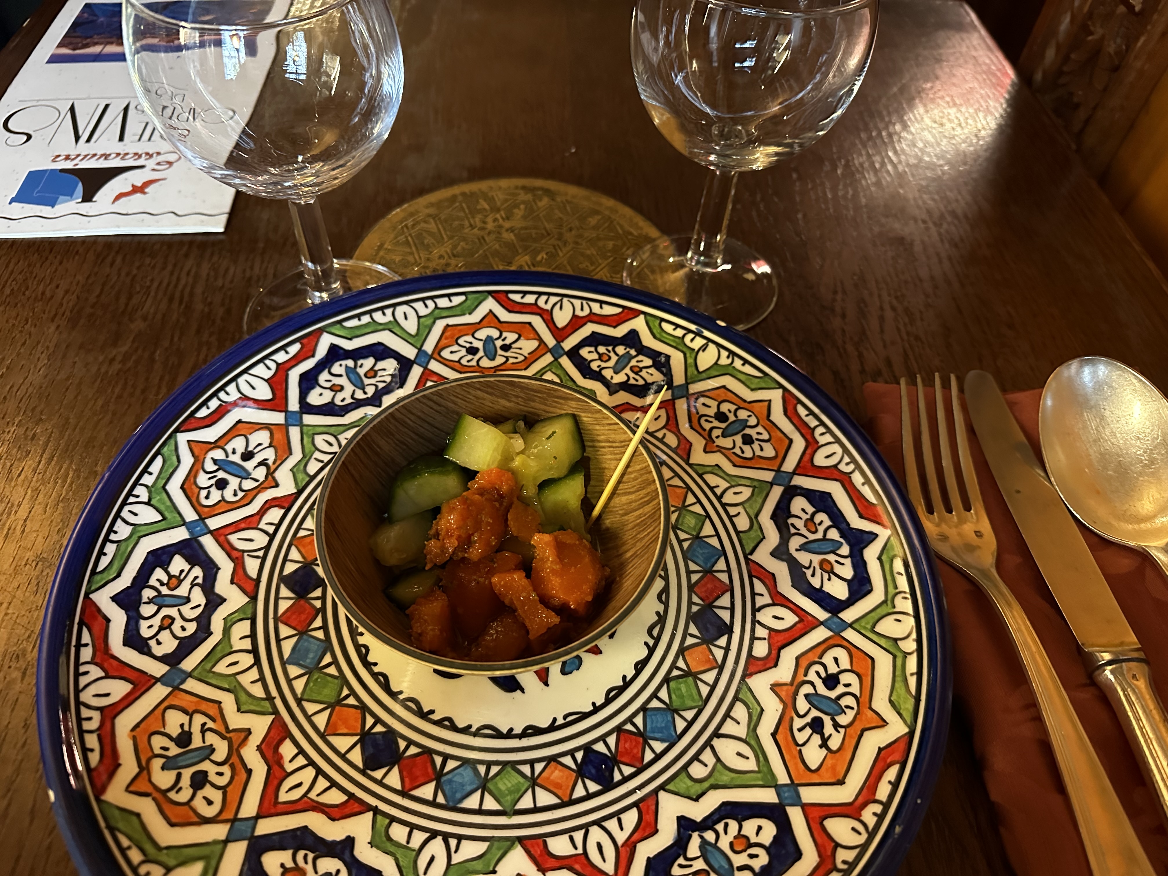 Ce soir un petit écrin nommé Essaouira....en plein Paris .... L'homme vous accueille avec sourire énigmatiquement charmant. Il porte la passion de sa culture.... Les murs chargés de leurs mosaïques dansent autour de nous... l'invitation est belle et bien là.... Un délices pour nos papilles, orgasmique....j'en perds mon latin....un dépaysement pour nos yeux, .... Je retrouve toutes les saveurs d'antan, celles qui m'ont fait tomber amoureuse de ce pays... j'adoooooorrre.....