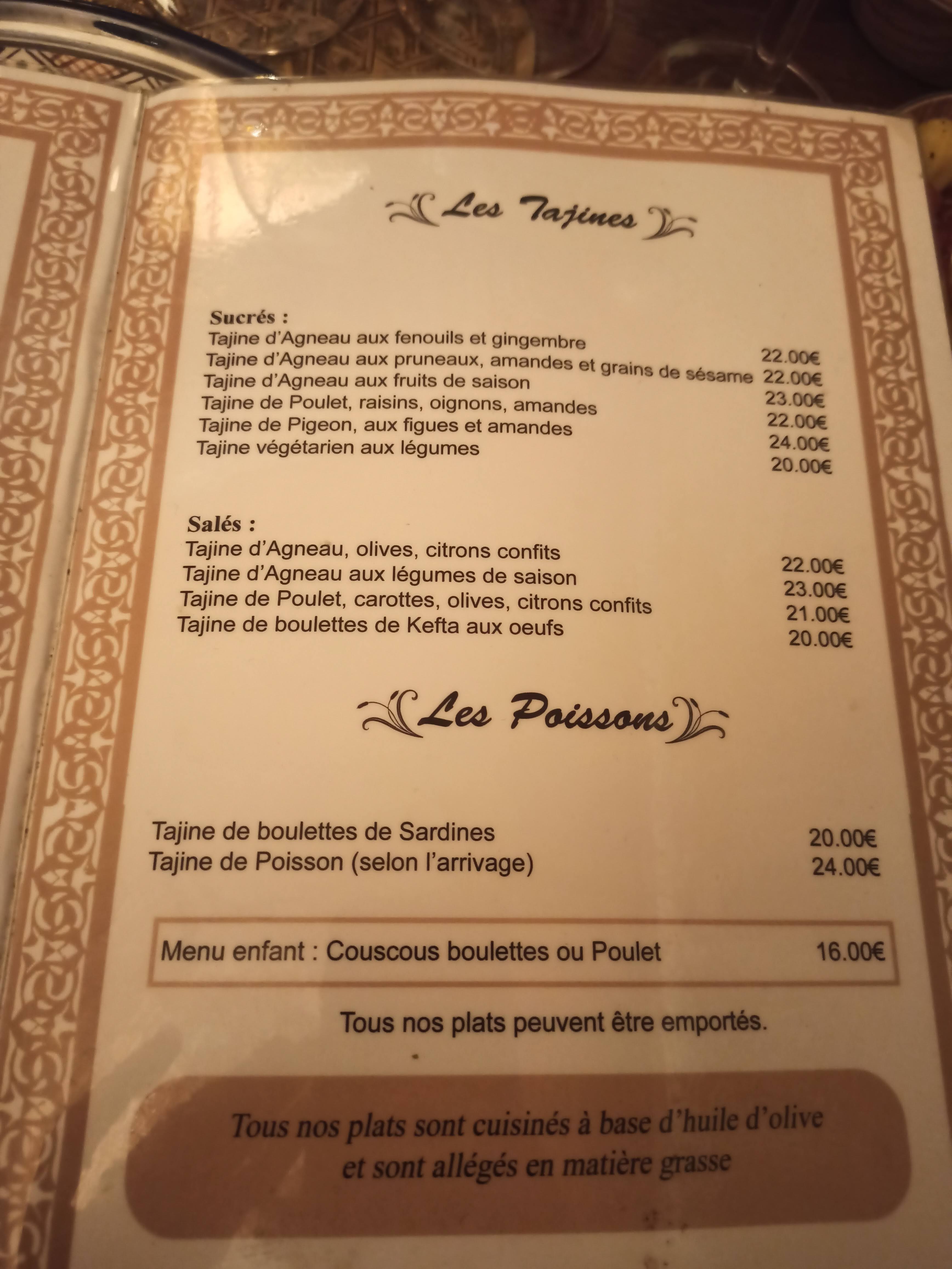 J'ai passé une excellente soirée dans ce restaurant avec des amis ! J'ai pris le tajine d'agneau aux pruneaux et amandes, et c'était tout simplement parfait.La viande était tendre et la portion généreuse. Le personnel est adorable, très attentionné et aux petits soins tout au long du repas. Service impeccable et ambiance chaleureuse. Je recommande vivement !