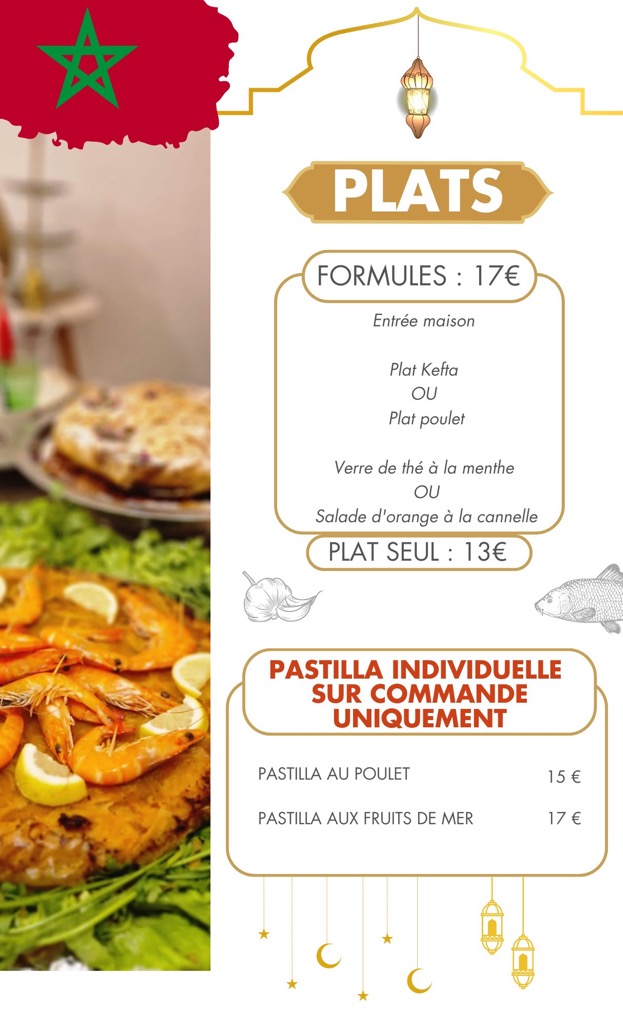 Bravo pour les parfums, la qualité et finesse des mets et les desserts, (cornes de gazelle Mention Trés bien) un régal pour les papilles et un accueil chaleureux, pensez à amener vos plats pour emporter votre couscous pour les familles...et découvrez les petits éléments de déco...Plats individuels copieux et délicieux à emporter ou sur place...Formule à 14 € un régal !