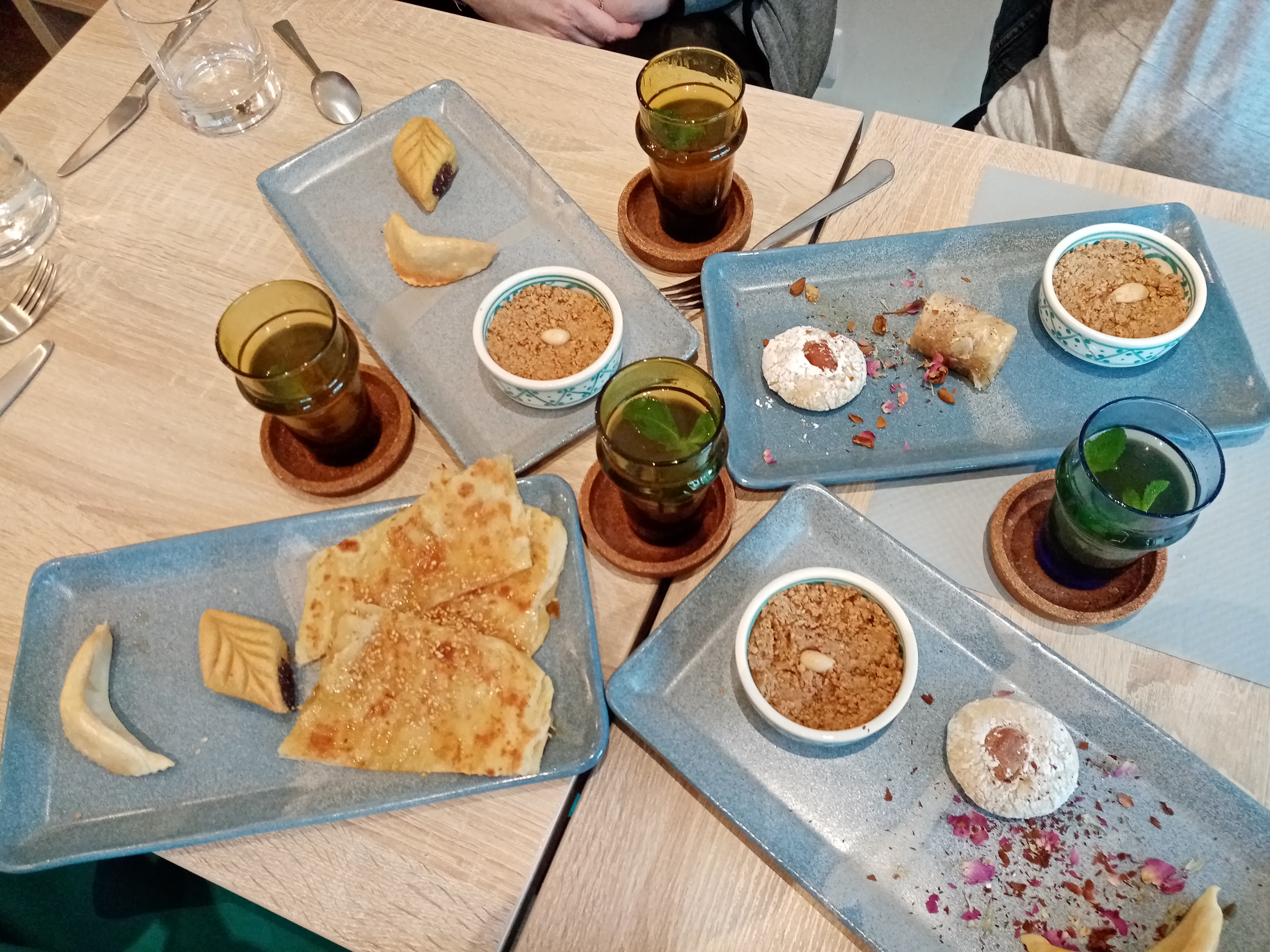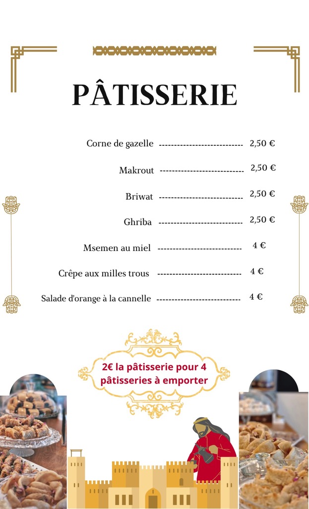 J'aime m'y rendre le mercredi après-midi pour boire un thé à la menthe et manger quelques pâtisseries telles que la corne de gazelle, le beignet et/ou la grande crêpe. J'ai aussi déjà mangé leur couscous qui est très bon ! L'accueil est très bien, des gens très gentils et chaleureux.
