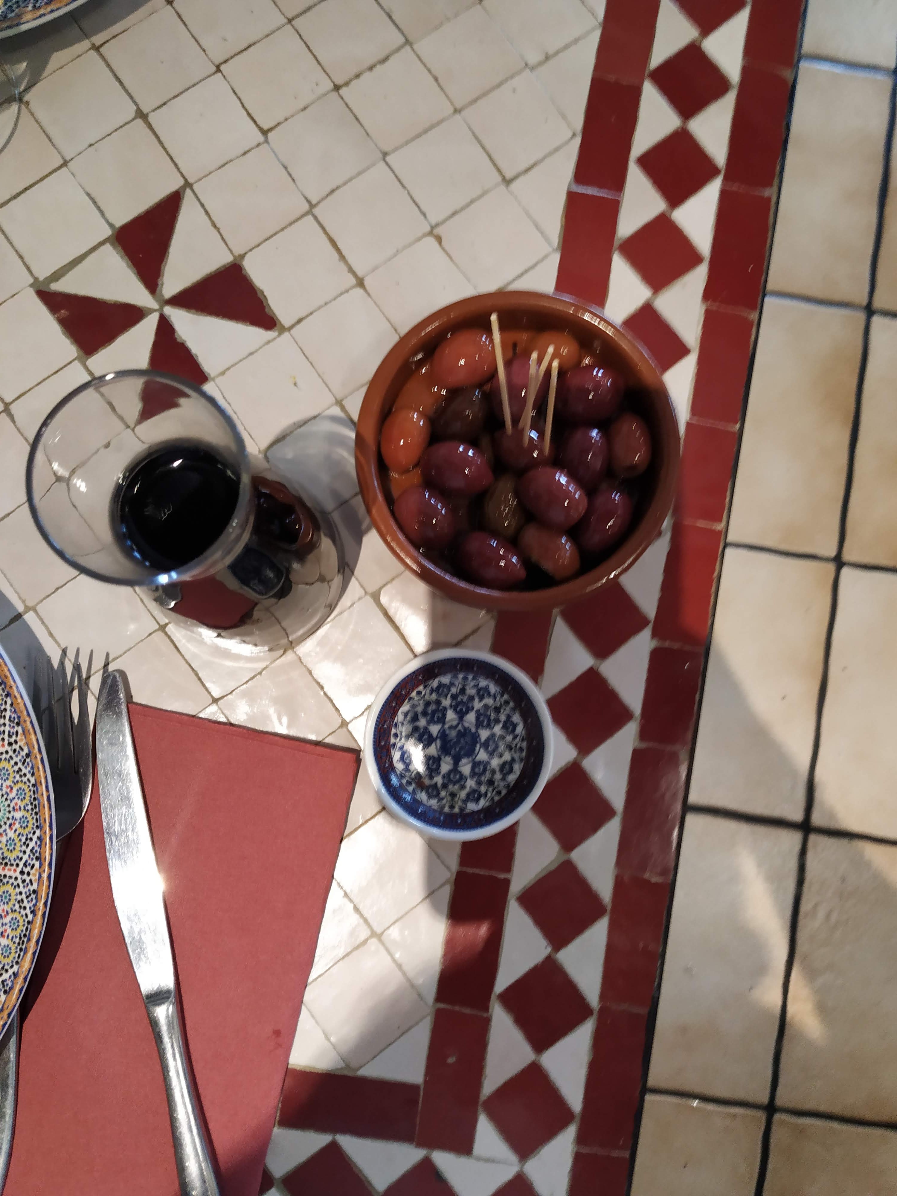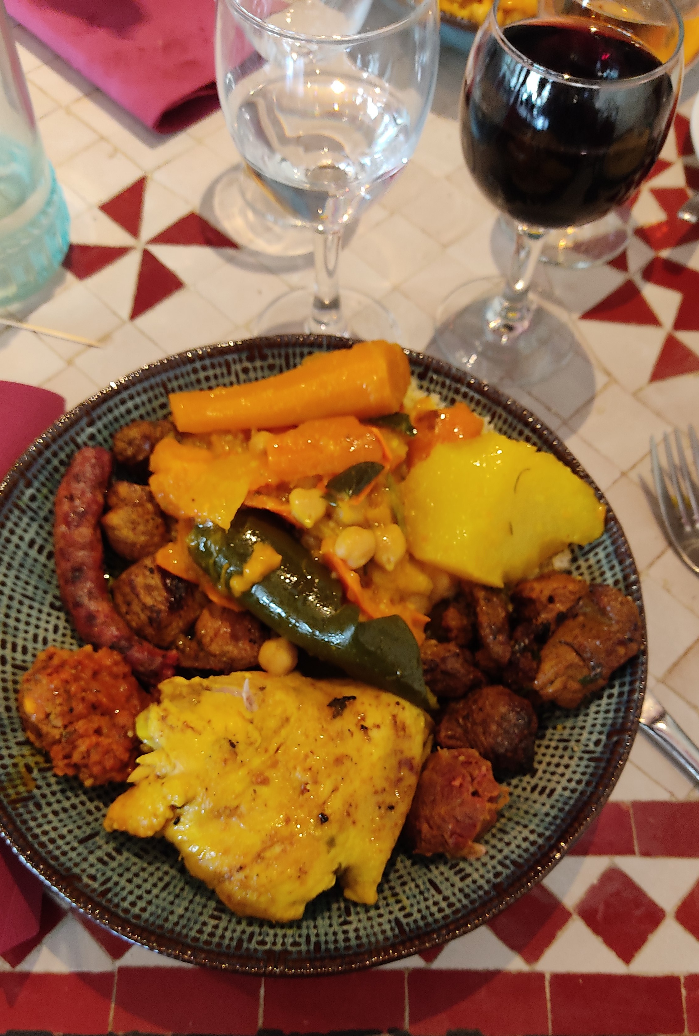 Oui on a choisi des plats traditionnels !!!! Couscous et Tajine Royaux s'il vous plaît. Un pur régal !!!! Sans oublier le verre de Sidy Brahim rouge, qui tape un peu (il est plein de soleil ☀). Il ne manquait rien. Recommandé + que +, c'est à dire: +++++++++++++++++++++++......