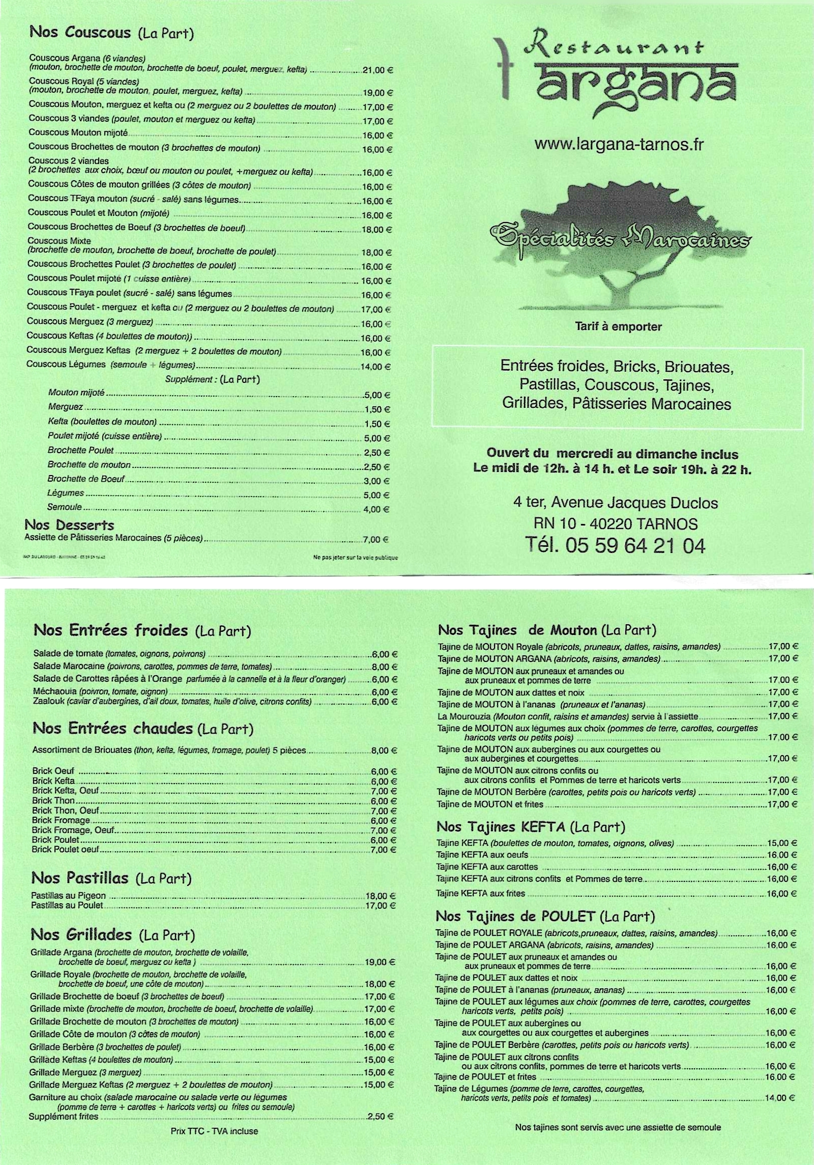 nous connaissons bien L'Argana depuis plusieurs années , nous habitions Tarnos .Revenu a la Rochelle depuis 2013, le 24 fevrier 2018 nous avions commandés a Pascal et Fathia , un couscous a emporter pour 15 personnes et le fils habitant hasparren est passé le prendre pour que nous le mangions le dimanche avec toute la famille . ce fût un vrai régal, copieux , bon pas cher et avec un ptit Boulaouane rosé ....une tuerie .Merci a vous deux Pascal et Fathia pour ce merveilleux repas que nous avons partagés avec la famille grace a vous deux
