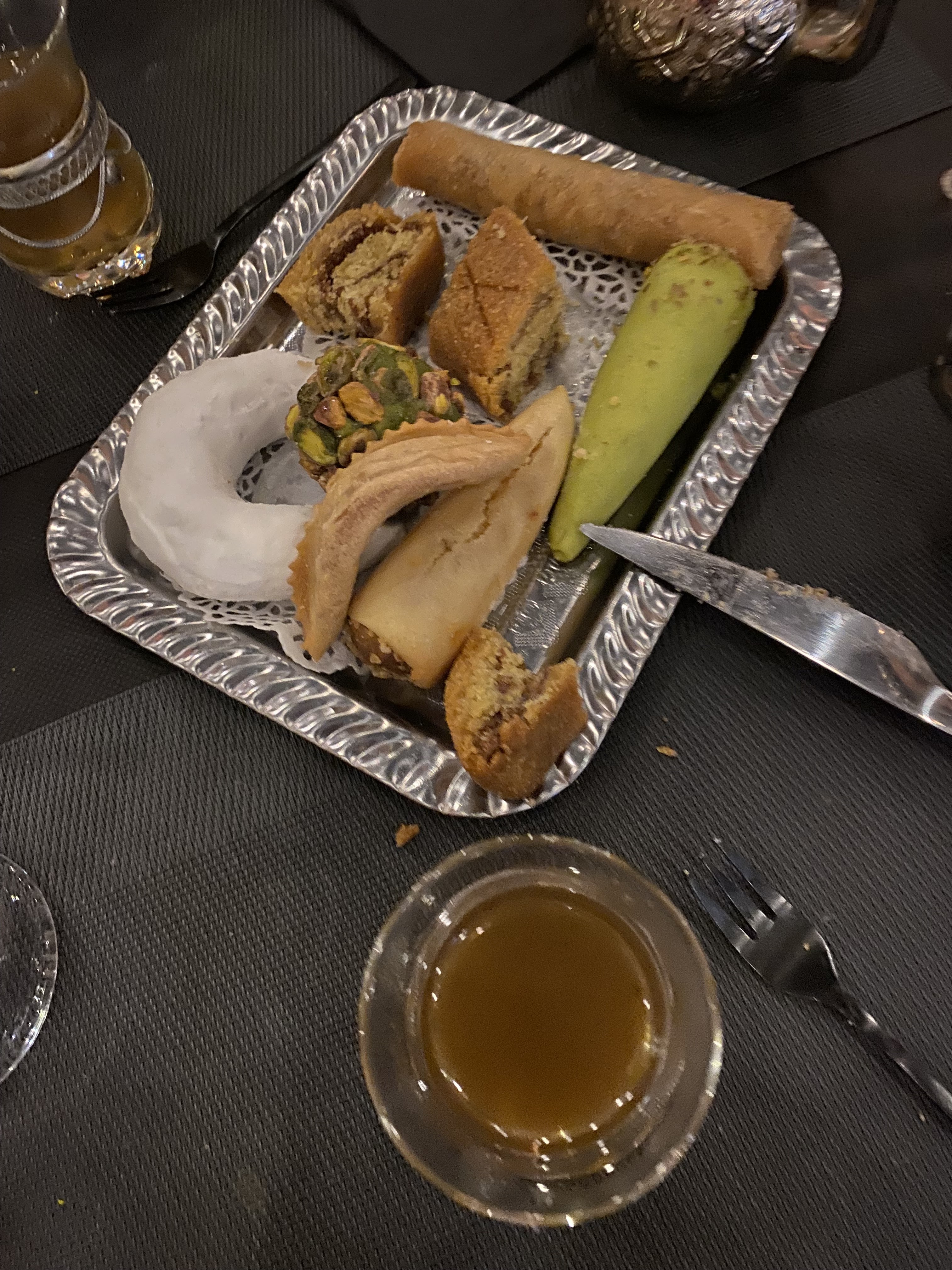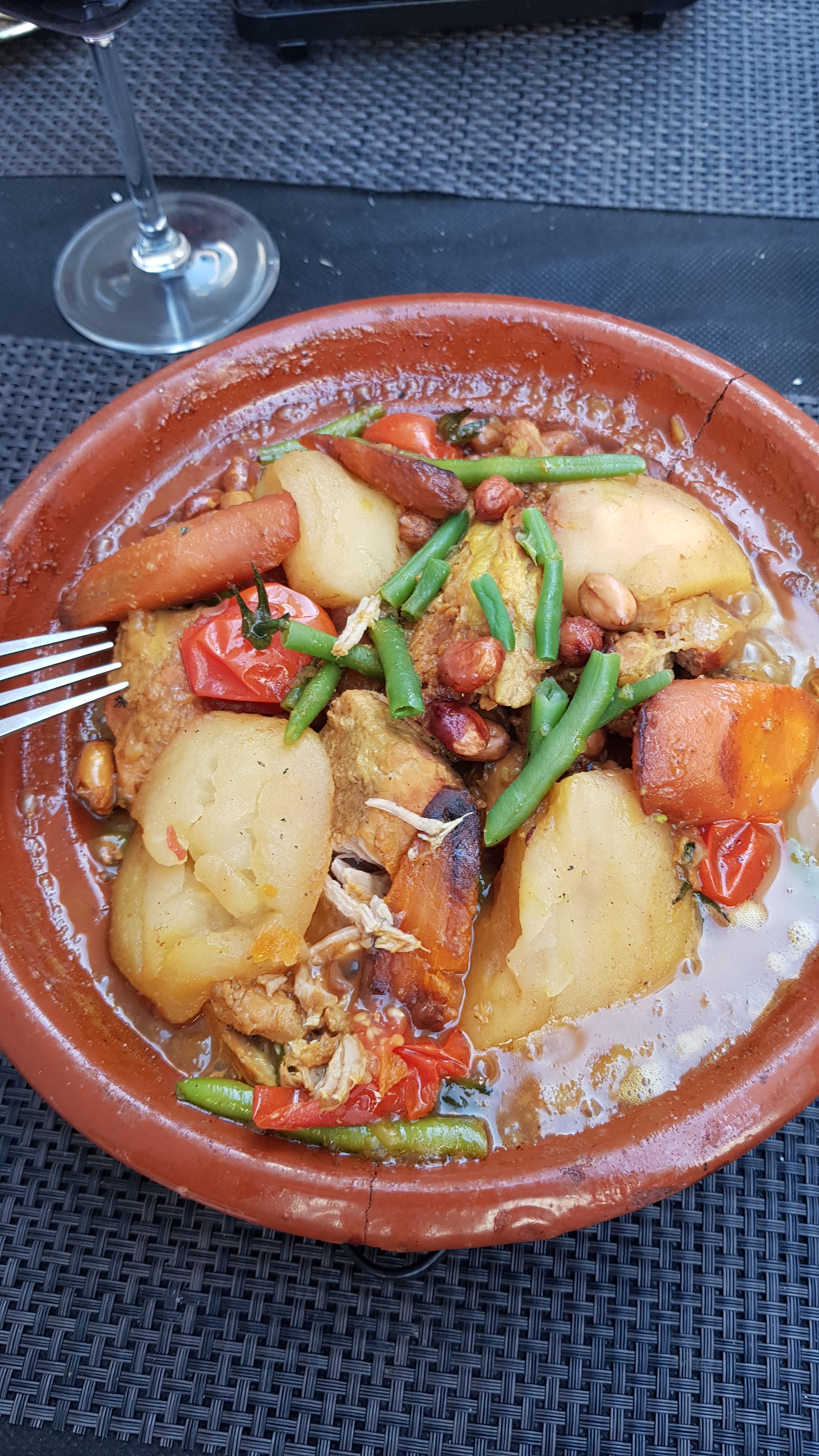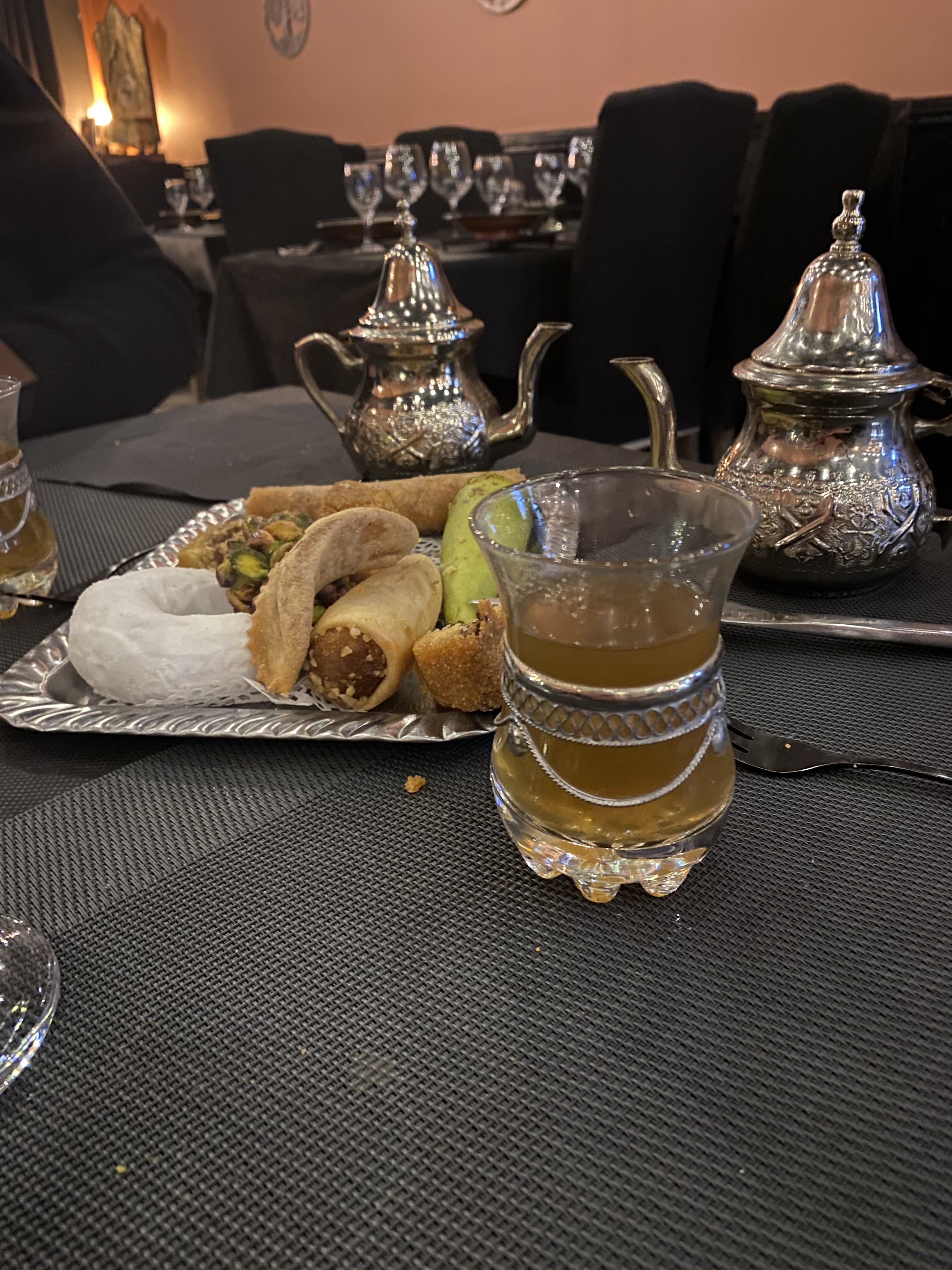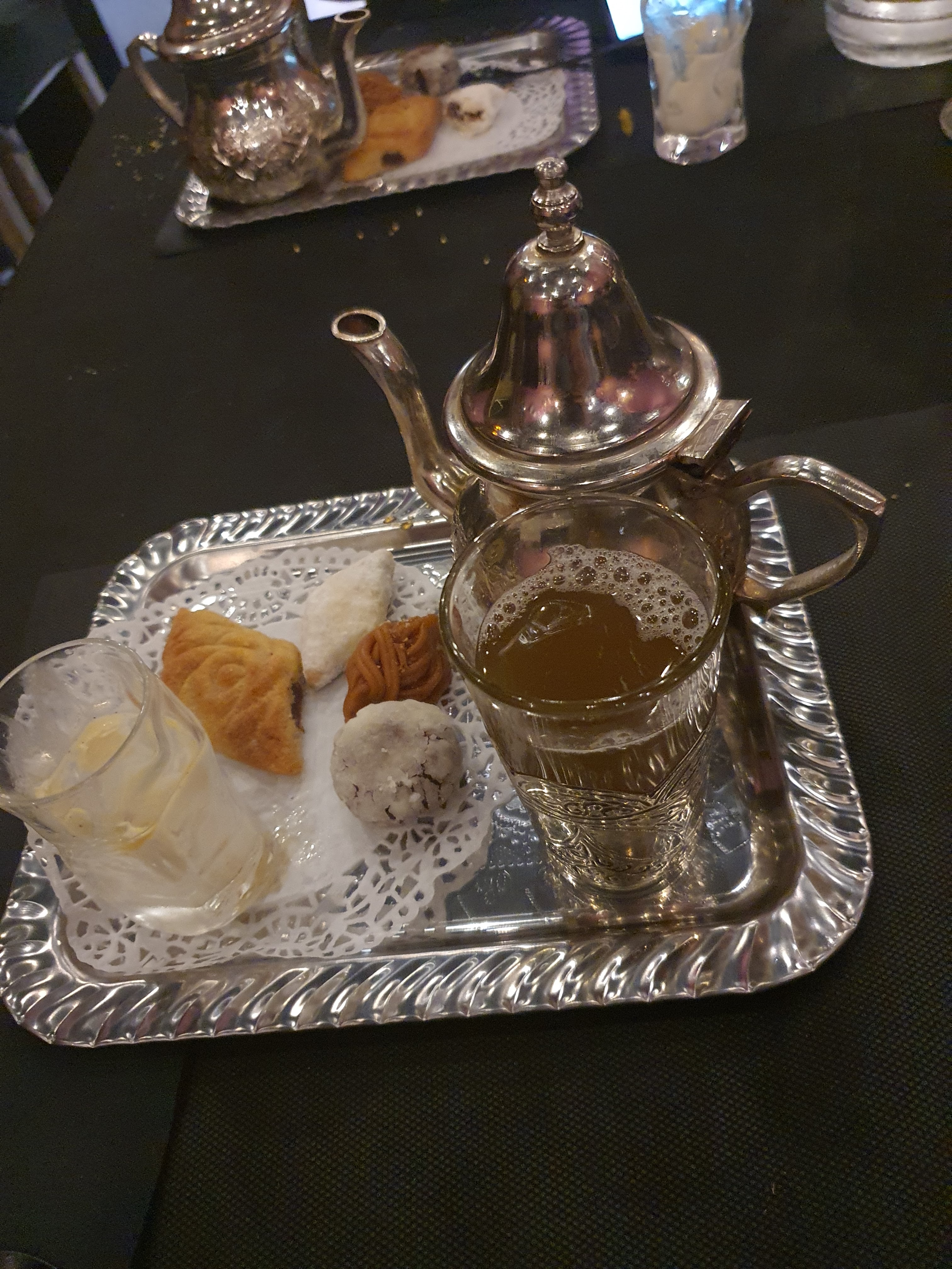 Les plats mangés (pastilla et tajine) en plus de la déco, nous a fait voyager au Maroc. Vraiment délicieux. Le thé a la menthe: un vrai bonheur en fin de repas. Je recommande.
