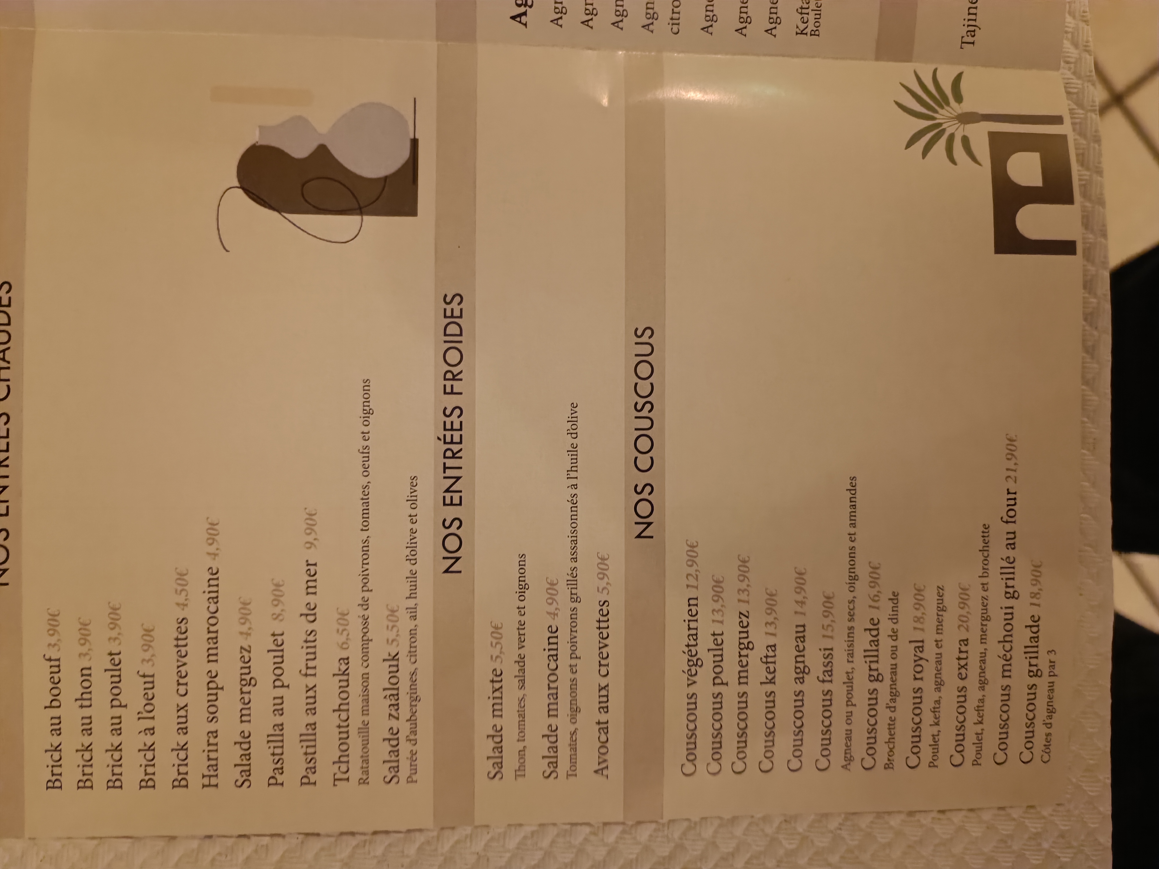 Excellent !! J’ai pris un tajine d’agneau aux pruneaux, ma mère et ma soeur ont pris un tajine agneau artichaut petits pois, on s’est régalés ! Rapport qualité prix très bien et le restaurateur est très aimable. Je recommande vivement