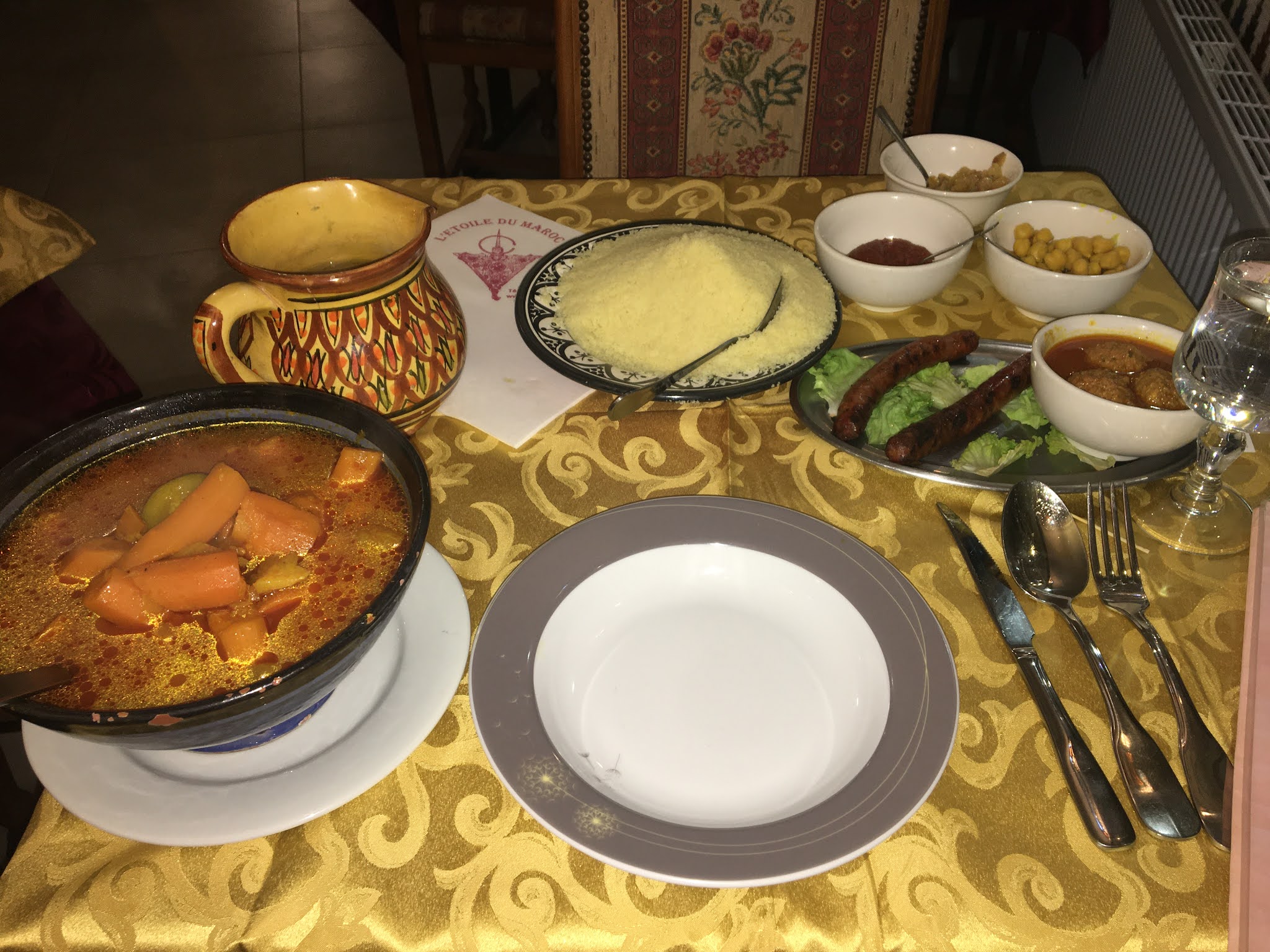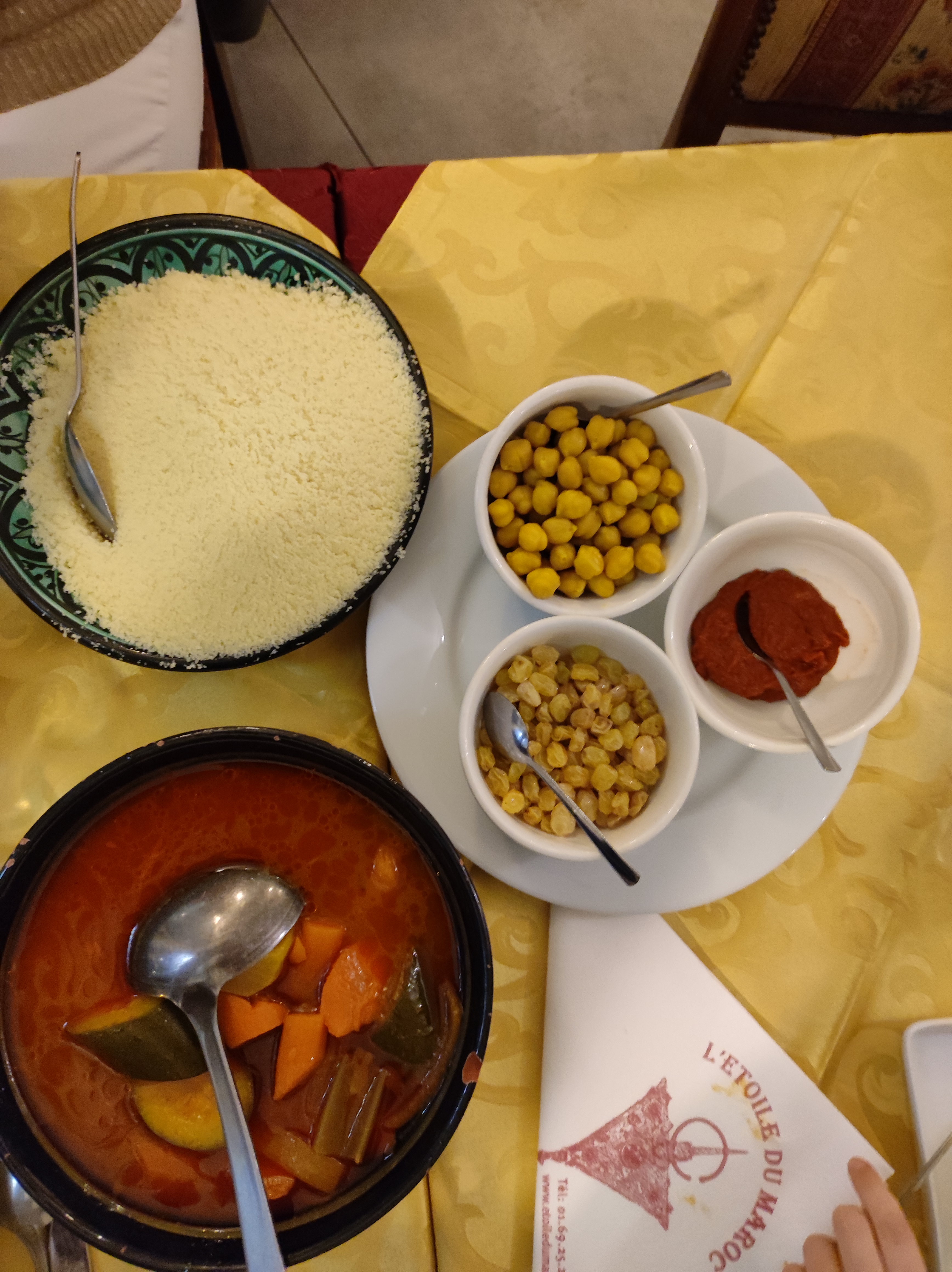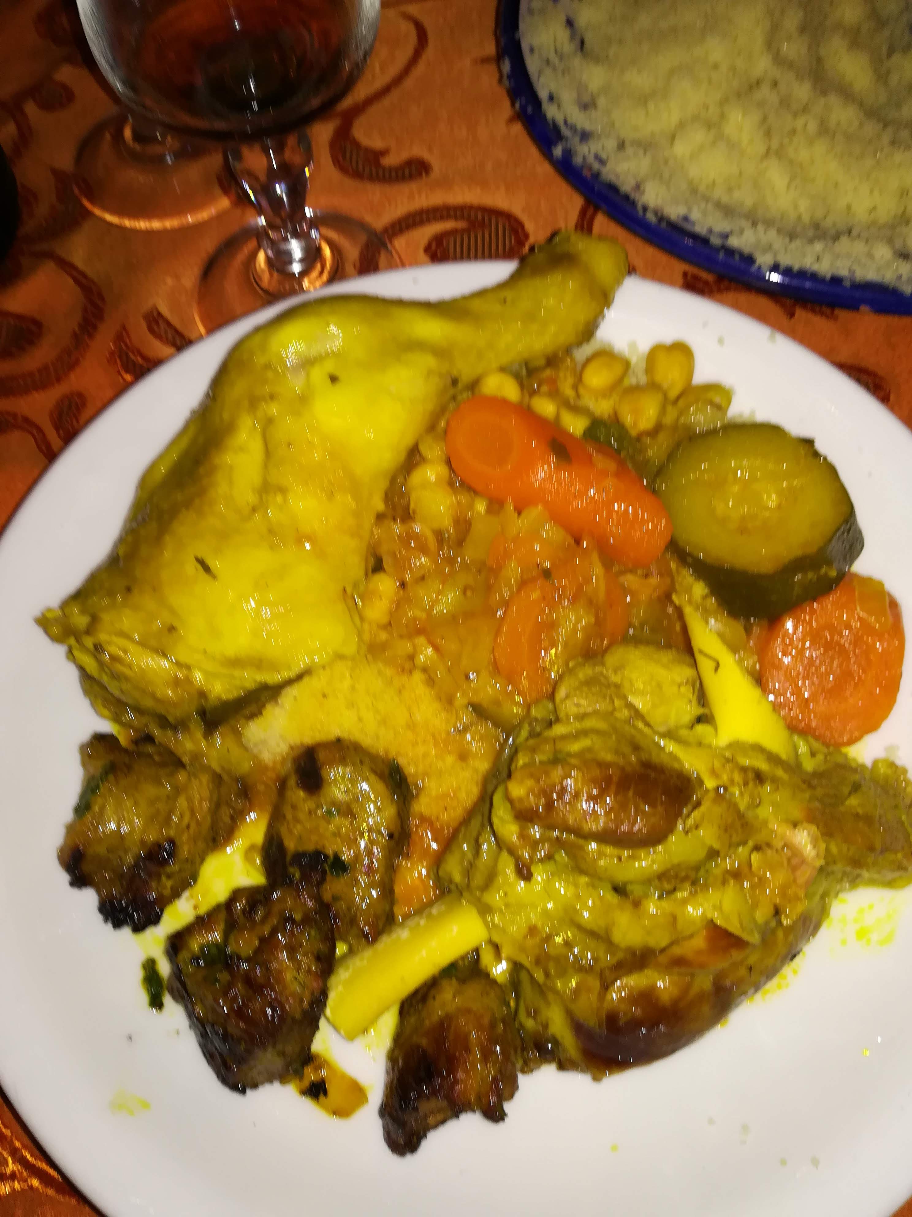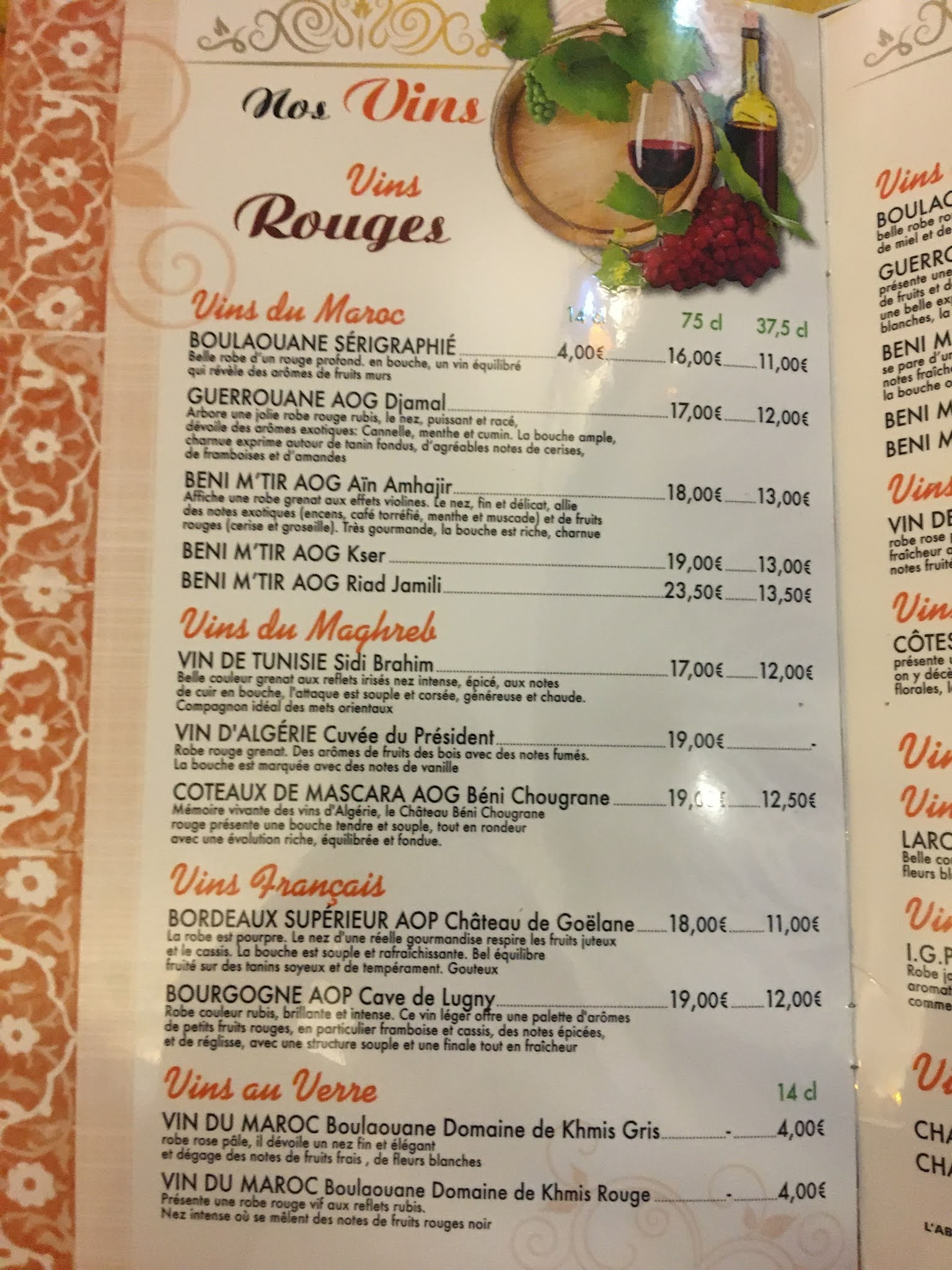 Couscous royal pas à la hauteur d un restaurant: pas de pois-chiches, ni même de raisins et une petite merguez : 19 euros. Pas mieux que dans une cantine ! Tajine : poulet de mauvaise qualité Je ne recommande pas.