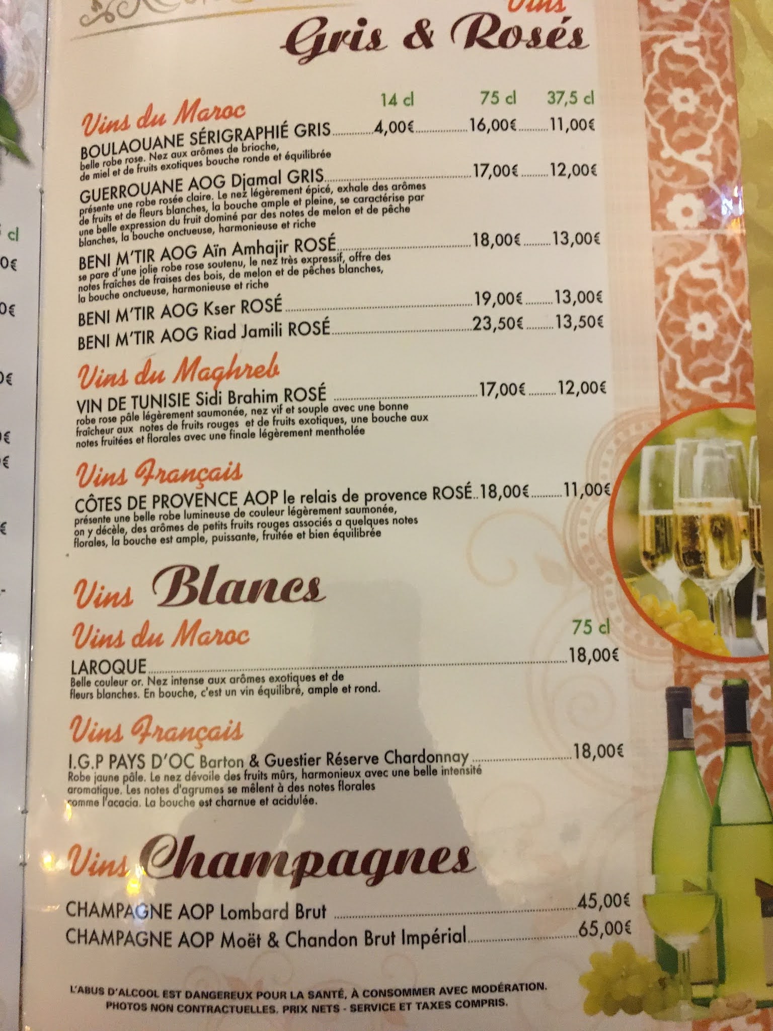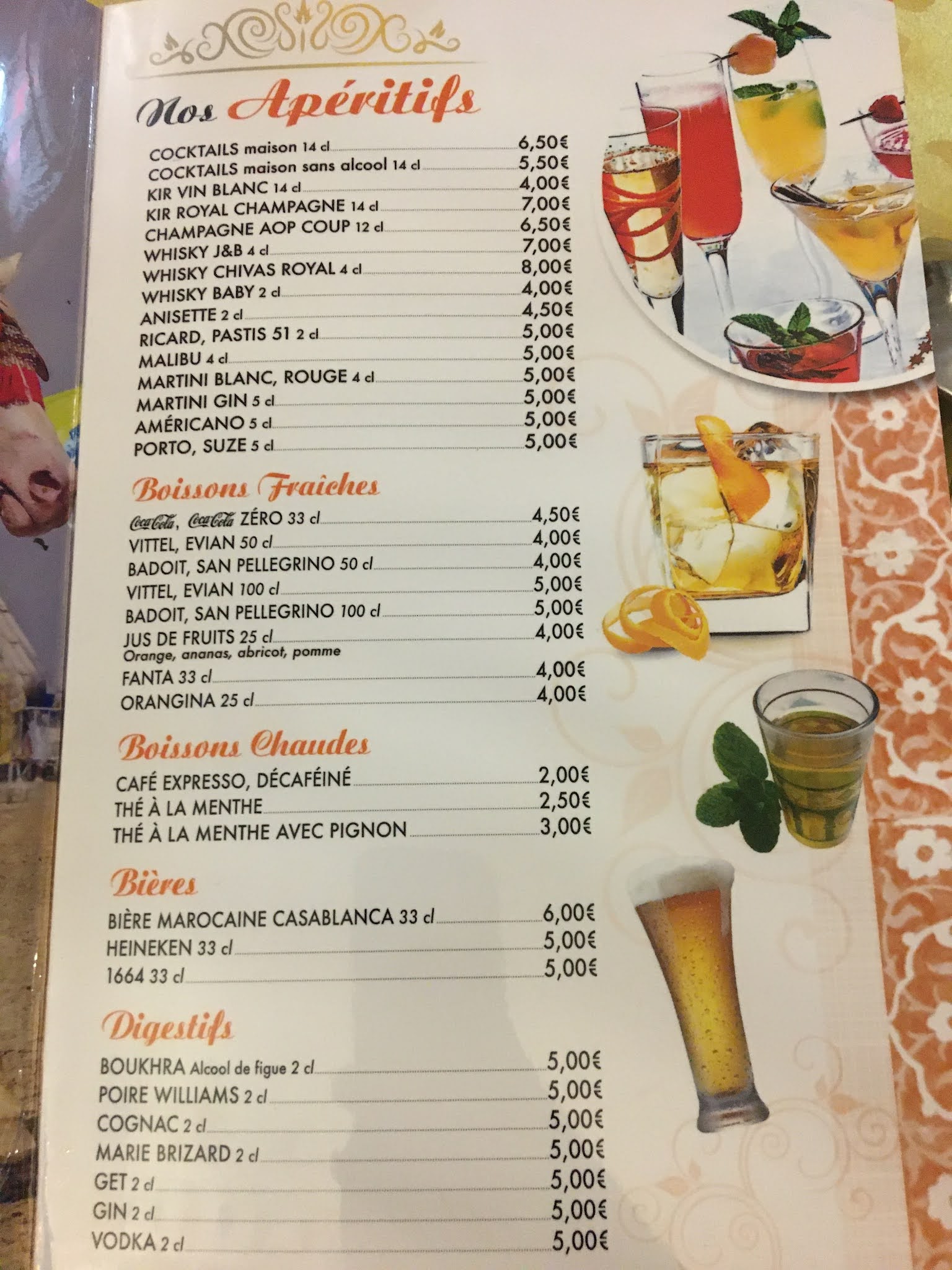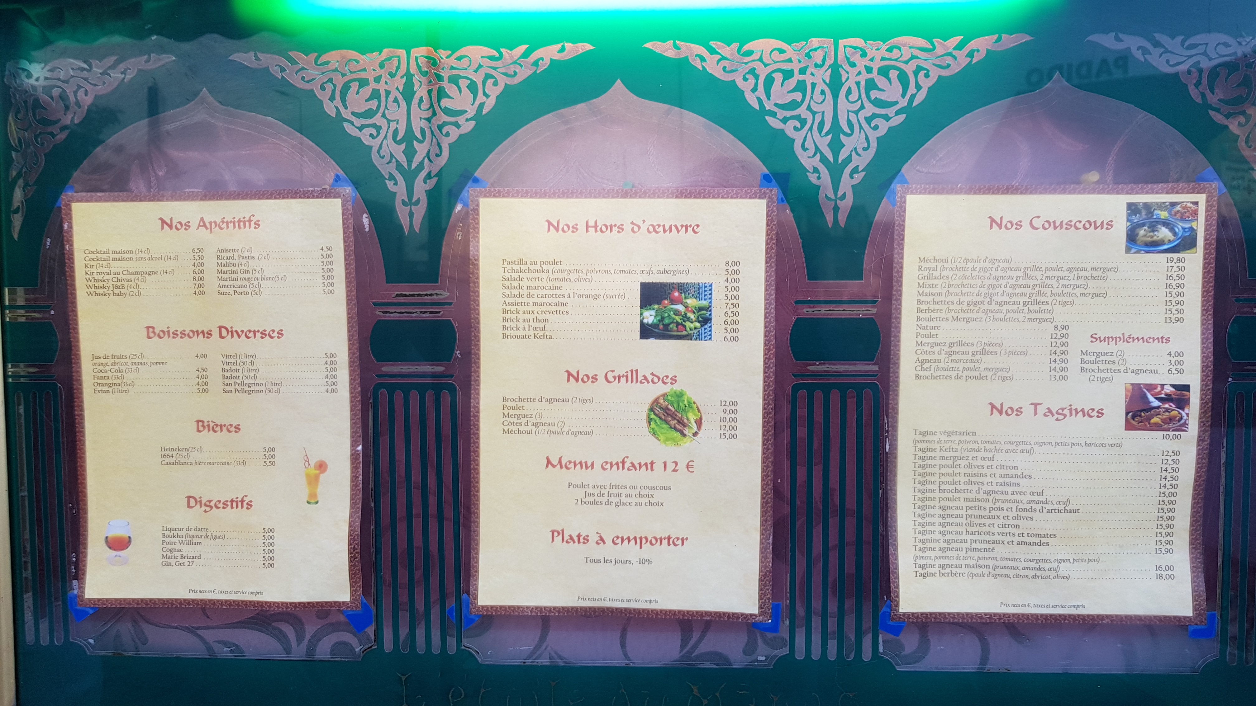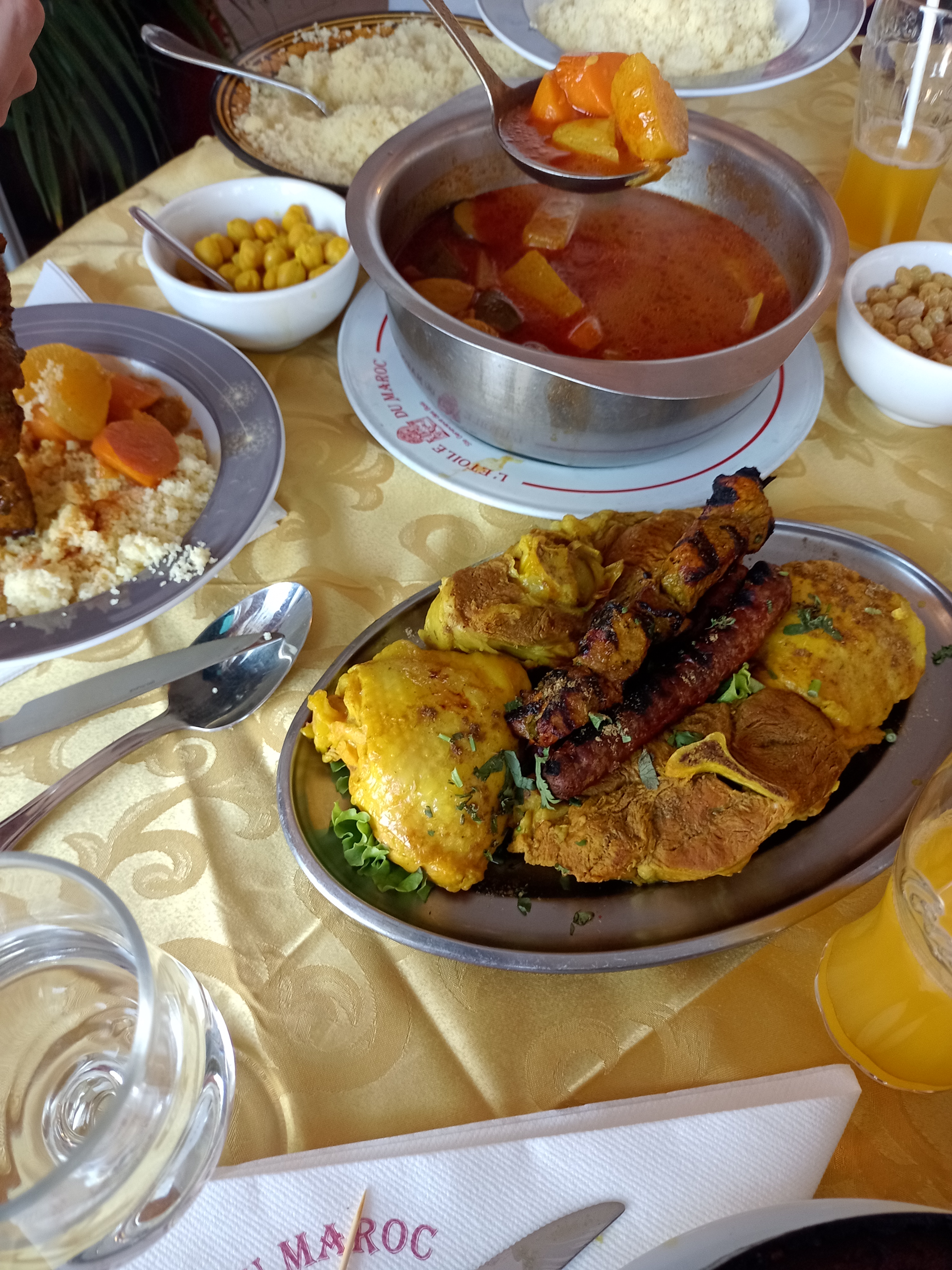 Couscous royal pas à la hauteur d un restaurant: pas de pois-chiches, ni même de raisins et une petite merguez : 19 euros. Pas mieux que dans une cantine ! Tajine : poulet de mauvaise qualité Je ne recommande pas.