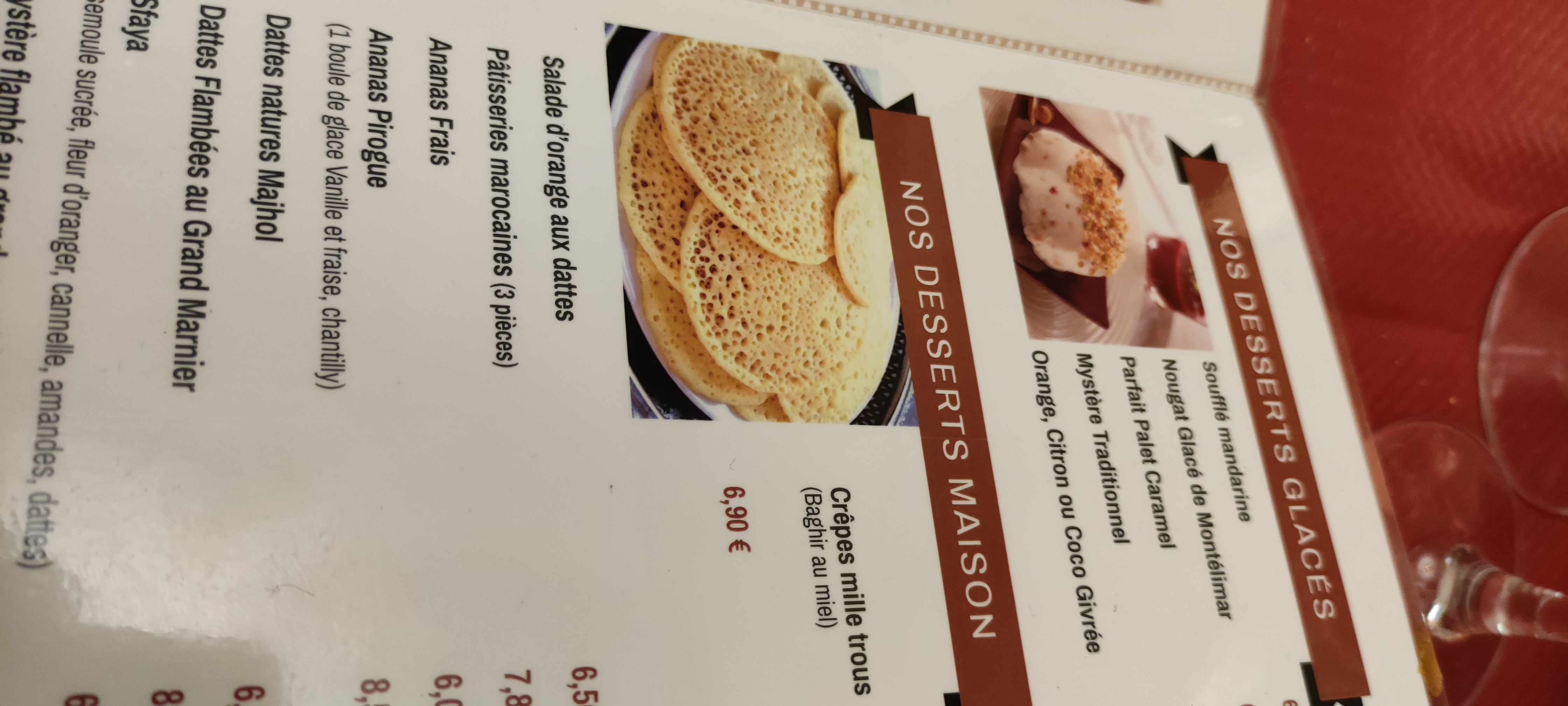 Pastilla succulente. Le couscous est très bon. Perso je n aime pas trop être servi pour la semoule mais bon...Plus de crèpes mille trous!!! trop déçu !!!...on a du se rabattre sur la semoule sucrée trop bonne et parfumée à la fleur d oranger et les pâtisseries qui sont excellentes. Bref très bon ce resto. Je reviendrai...par contre évitez les pénuries de crèpes mille trous...Merci d avance.