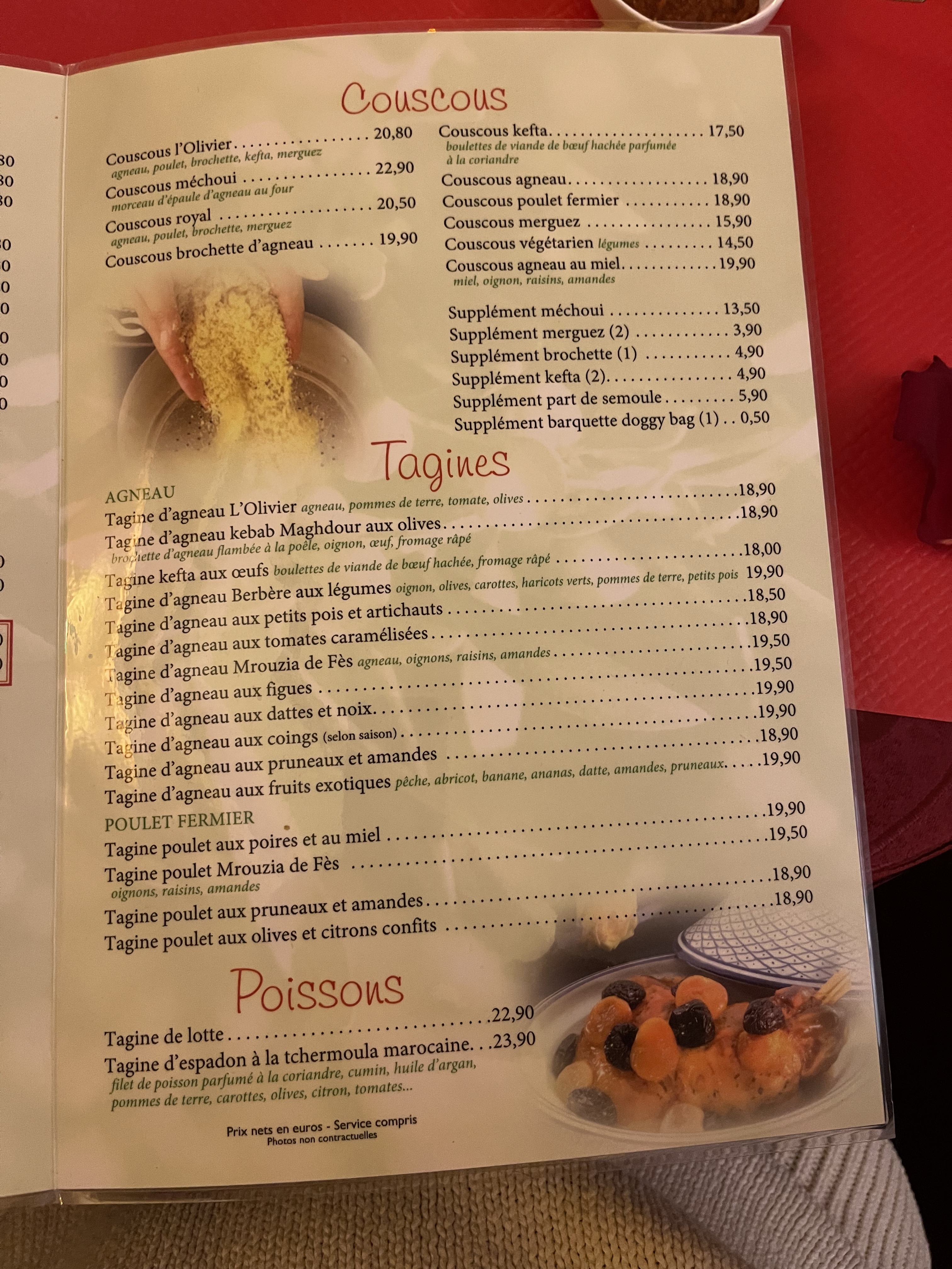 Notre choix s est porté sur le couscous, viandes délicieuses, semoule légère, et les desserts parfois, nous reviendrons avec plaisir, servi rapidement, personnel très aimable