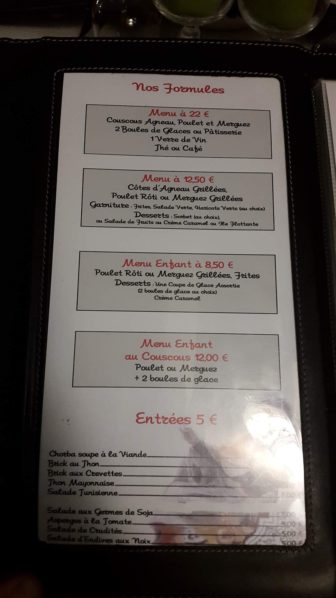 Excellent ! Très bon accueil, salle de restaurant agréable, très propre, bien décorée, petite musique d ' ambiance appropriée, un couscous délicieux, on y a passé un très bon moment, je recommande !