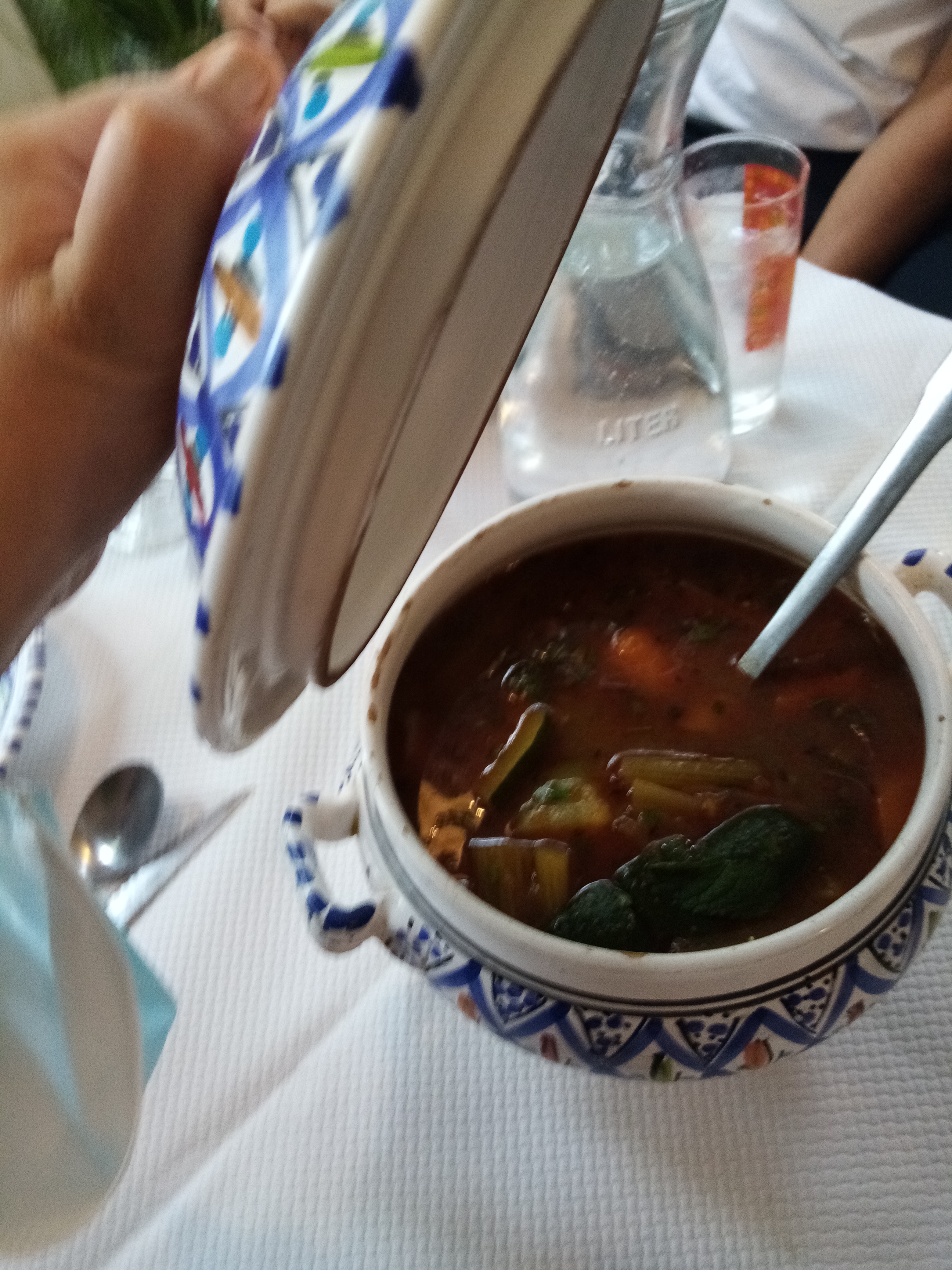 Je suis mitigée : de l' extérieur, un restaurant qui donne envie d' y entrer ! Dépaysement total vu de l' extérieur, une invitation à l' exotisme, à la chaleur, à la fête, à l' ambiance chaleureuse et somnolente du sud... Agréable, donc!! En revanche à l' intérieur on ne sait plus où l'on se trouve : dans un hôpital aseptisé, dans une garderie, dans une piscine tant les murs sont blanc recouvert de mosaïque bleu avec de vagues arabesque comme on pourrait en trouver dans tous les endroits déjà cités ! Et que dire de la nourriture : on dirait que l'on a sorti une boîte de légumes pour la faire réchauffer, à peine assez de semoule pour deux services (pourtant nous étions 4 à table) ! En revanche la viande correctement servi pour être assez copieux pour une personne dans chaque plats! Mais trop cuit et sans saveur tandis que la langue est brûlé par les épices !! Et le service.... N' en parlons même pas !! Bref, une restaurant qui avait l'air bon sans en avoir la chanson!!😪 Mais c'est seulement mon avis, d' autres personnes peut-être (pas les 3 autres de mon groupe qui pensait comme moi!) le trouveront bon... À cela il faut ajouter assiette ébréchée et verre ébréché aussi... J' aurai honte de présenter ça à des invités, alors dans un restaurant...😠😡