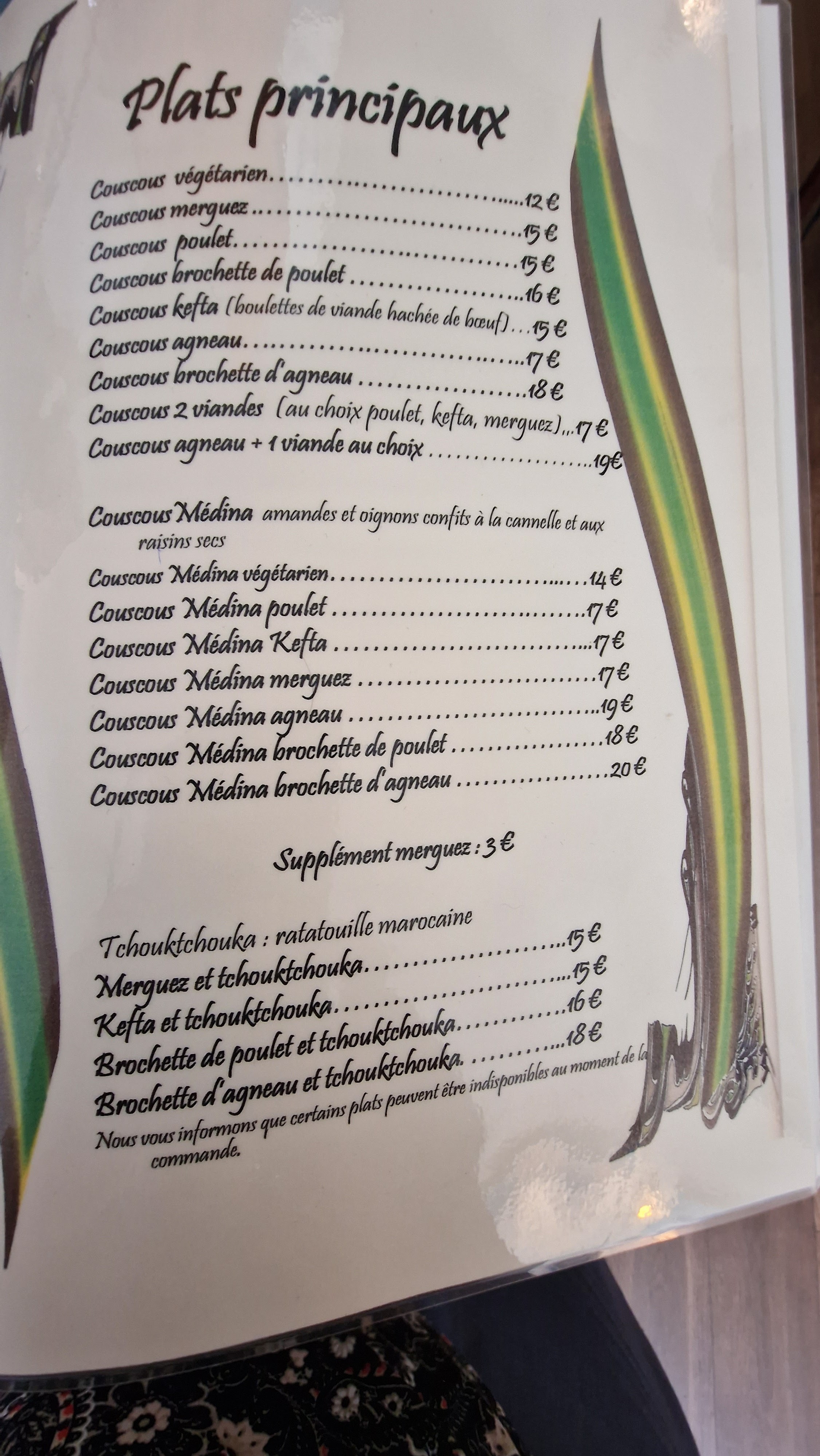 Couscous excellent je conseille le Médina ! L'accueil est très chaleureux et le patron adorable ! A chaque fois, je me dis que je devrais y venir plus souvent, n'hésitez en tout cas surtout pas à y aller si vous appréciez les spécialités orientales !
