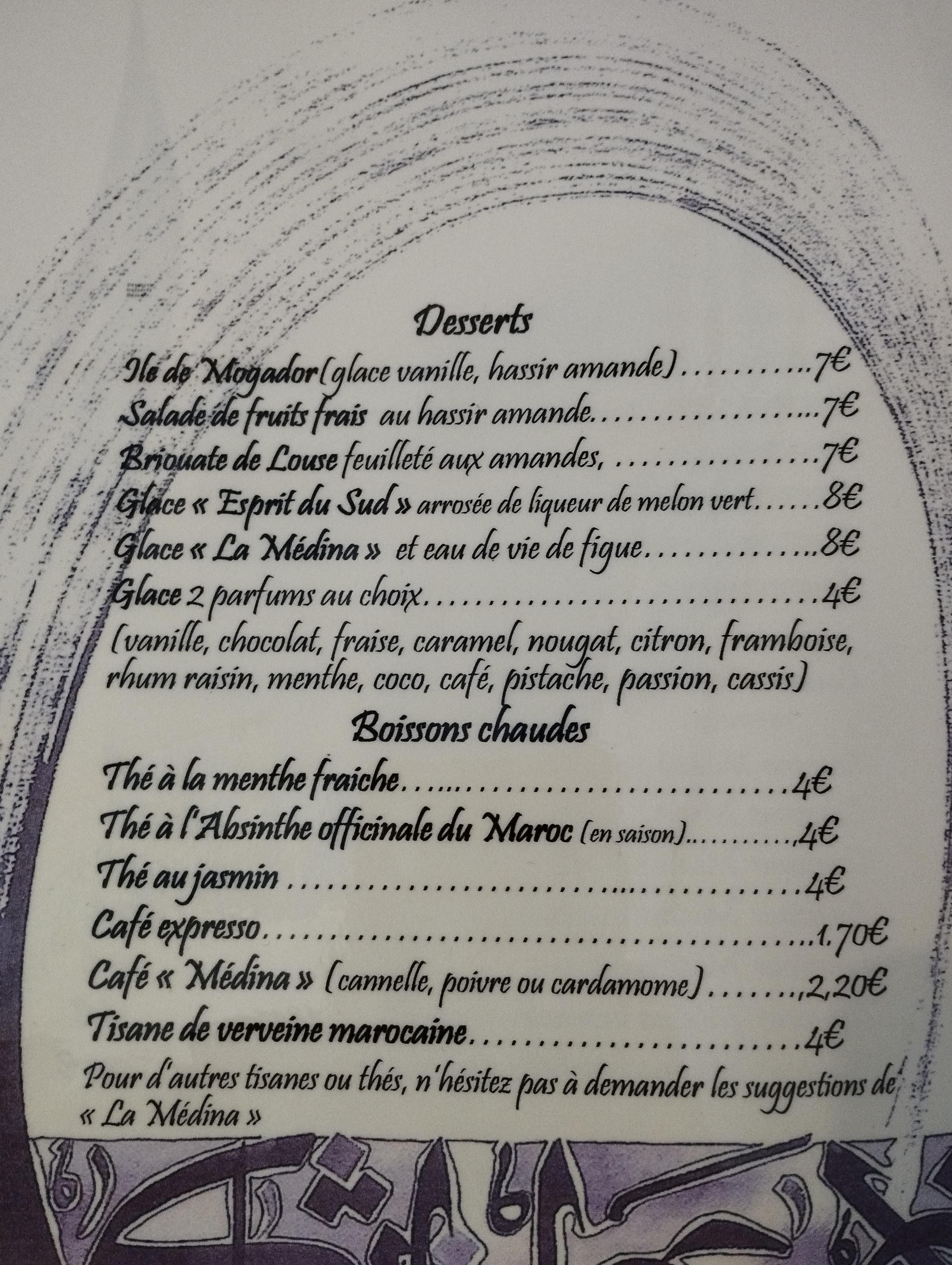 Du tajine en passant par le couscous, la Médina vous propose un menu succinct mais savoureux de spécialités. Une cuisine délicate et excellente.