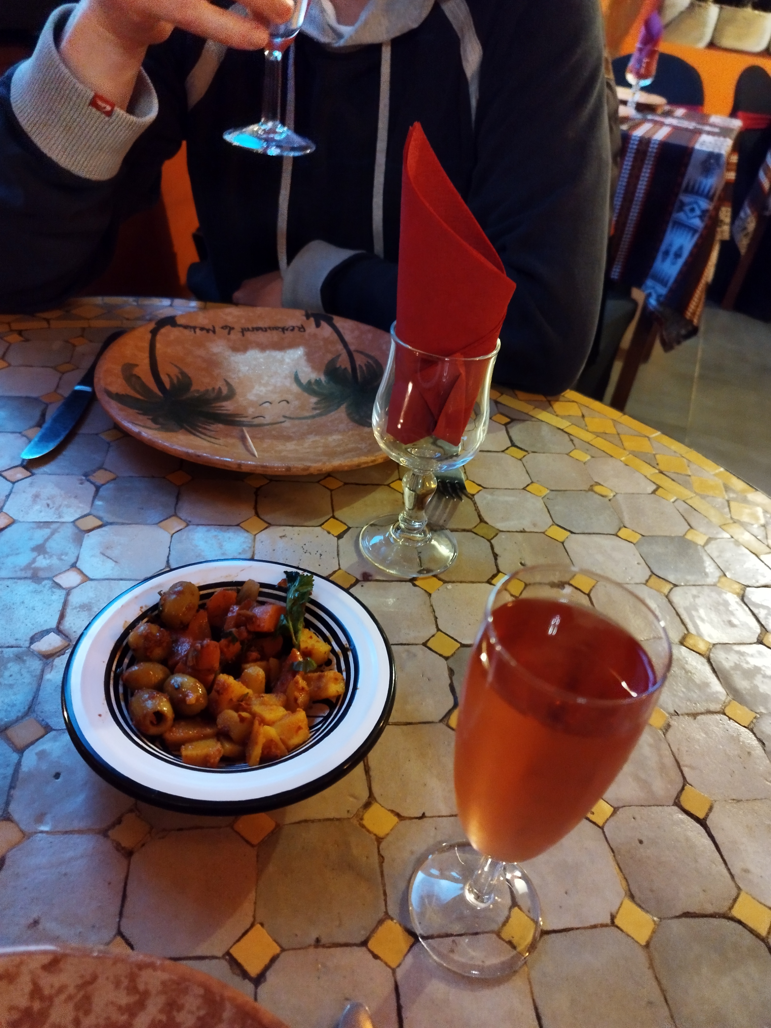 Aperitifs pas chers et dégoûtants : une sorte de patates cuites à l'harissa, sans aucun intérêt. Le pire tajine aux olives que j'ai jamais mangé. Service tout simplement stupide : l'on nous a emmené la carte après une demi-heure puis, 30 secondes après, une serveuse - qui ne comprenait pas bien le français - est venue prendre la commande. Ambiance de morgue, avec une musique en sourdine qui fait flipper. Plus jamais.