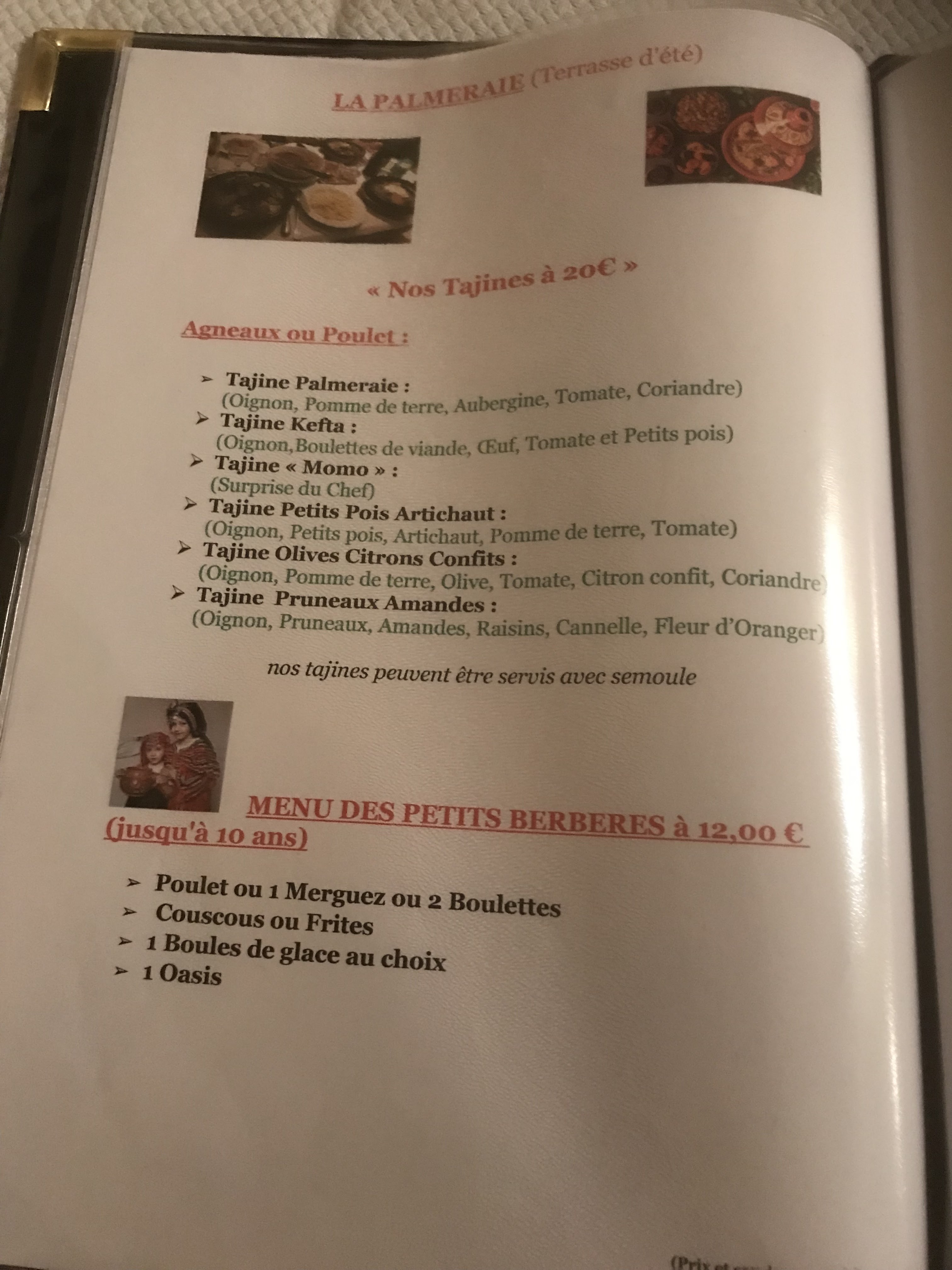 J'hésitais entre le Couscous et le tajine La Palmeraie Le chef m'a proposé de me préparer un tajine surprise du chef et je n'ai pas été déçue ! C'était délicieux !