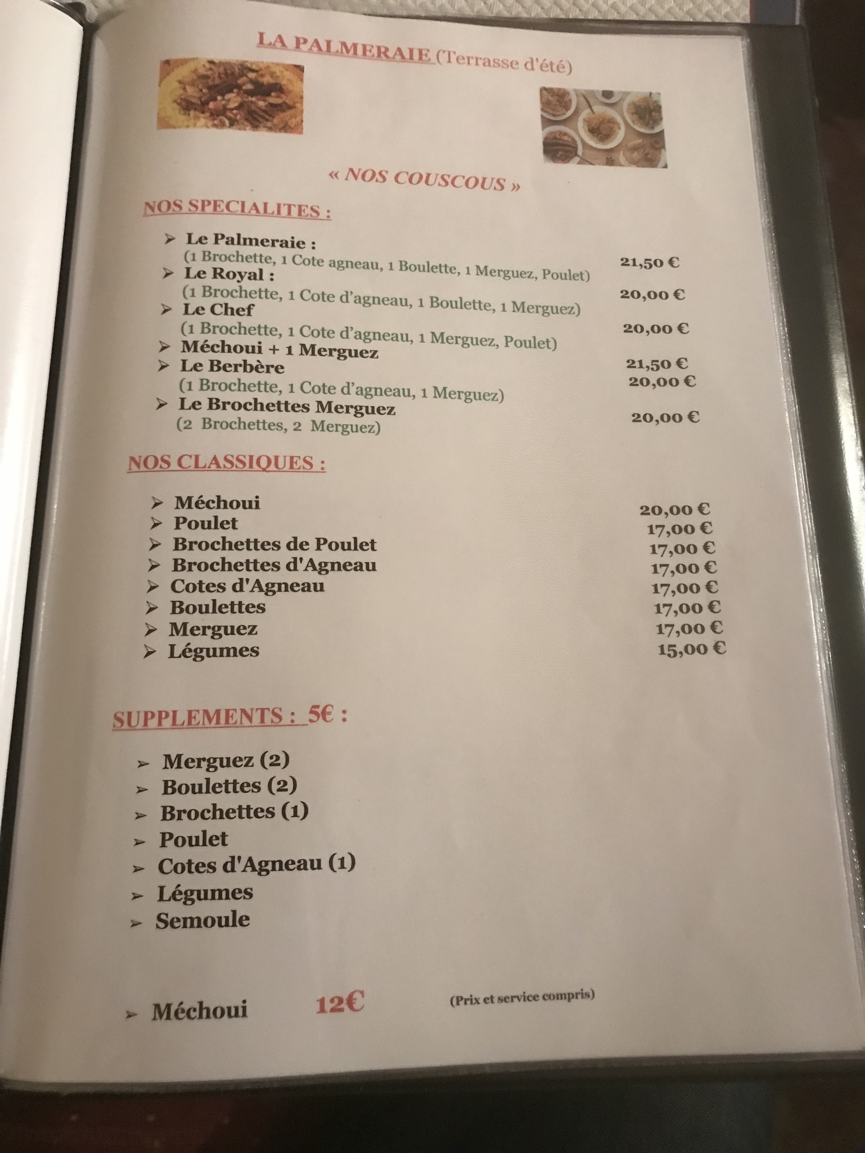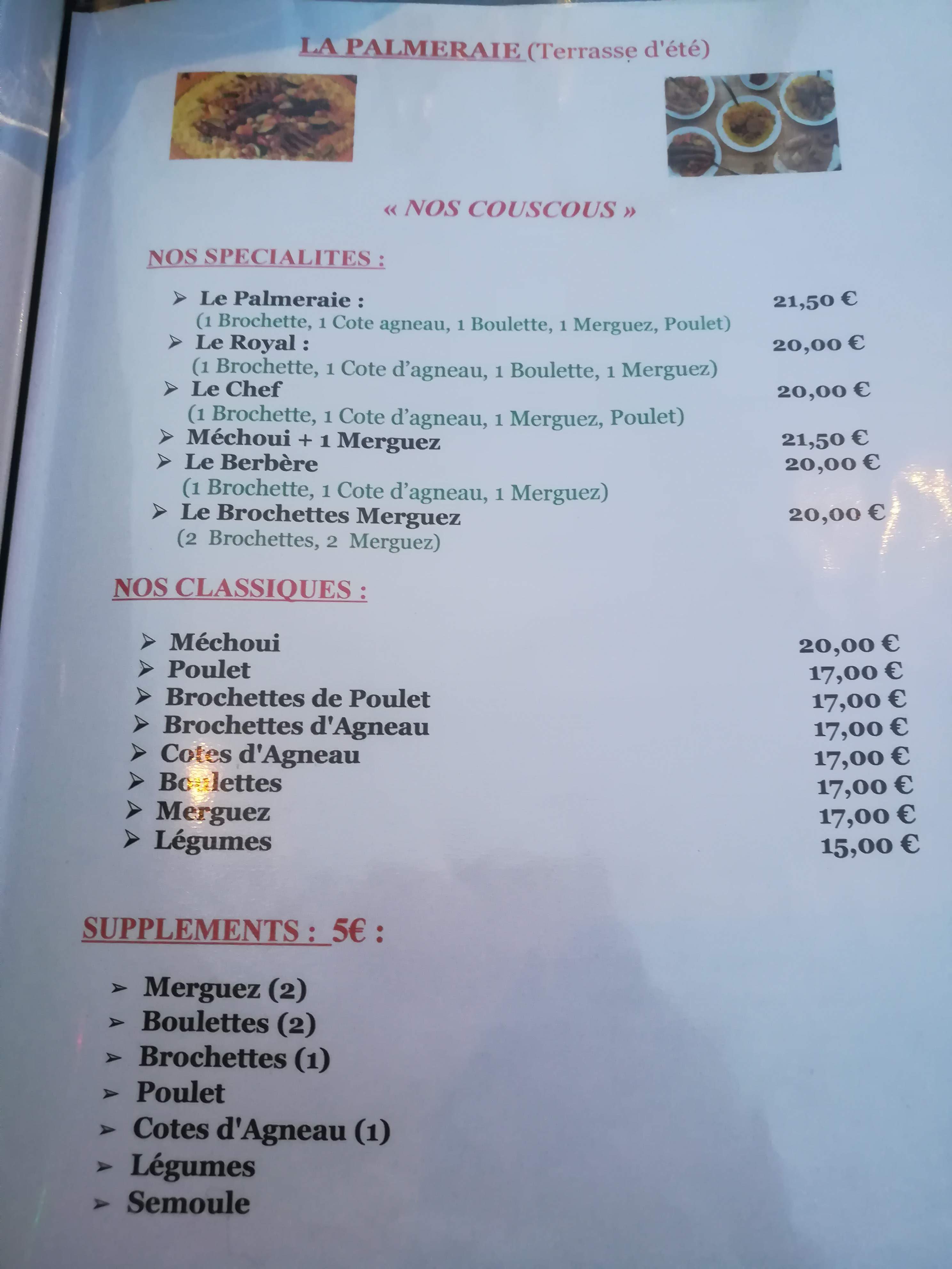 Nous avons déjeuné à la palmeraie et avons été très déçus. Nous avions pris un couscous merguez ainsi qu'un couscous aux légumes. Le gérant vient vous servir en semoule puis repart avec le plat, tant pis pour vous si vous avez dit stop trop tôt. Une fois l'assiette de ma compagne servie en légumes (couscous aux légumes) il ne restait plus que 5 bouts de carottes, j'ai donc demandé s'il était possible d'avoir + de légumes étant donné que nous n'en avions pas beaucoup. Ca nous a été facturé 5€. Des tables avec une seule personne avaient autant de légumes que notre plat pour 2 ... Les merguez n'étaient pas très bonnes et au global le couscous très moyen. Bref nous ne recommandons pas ce restaurant.