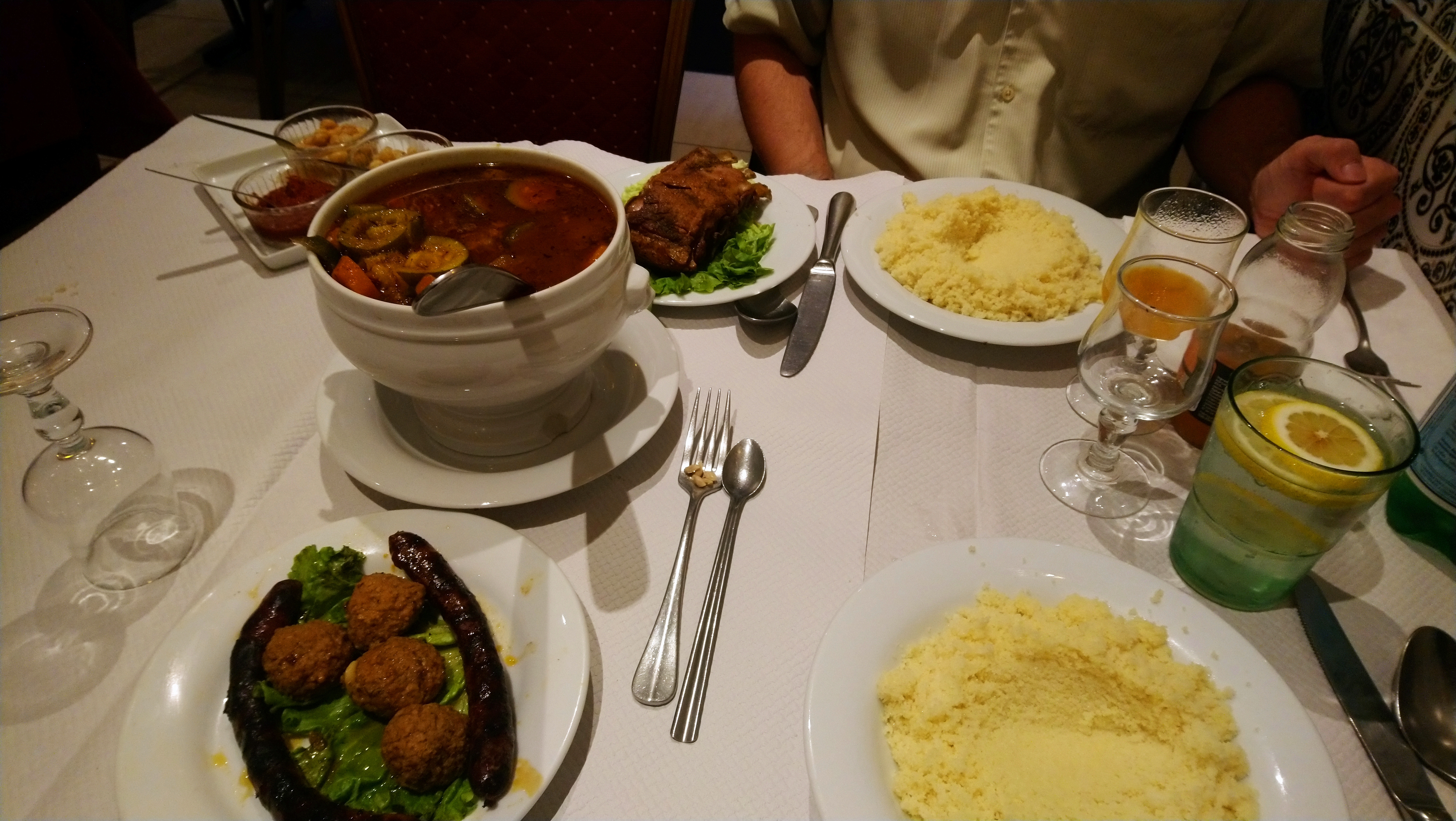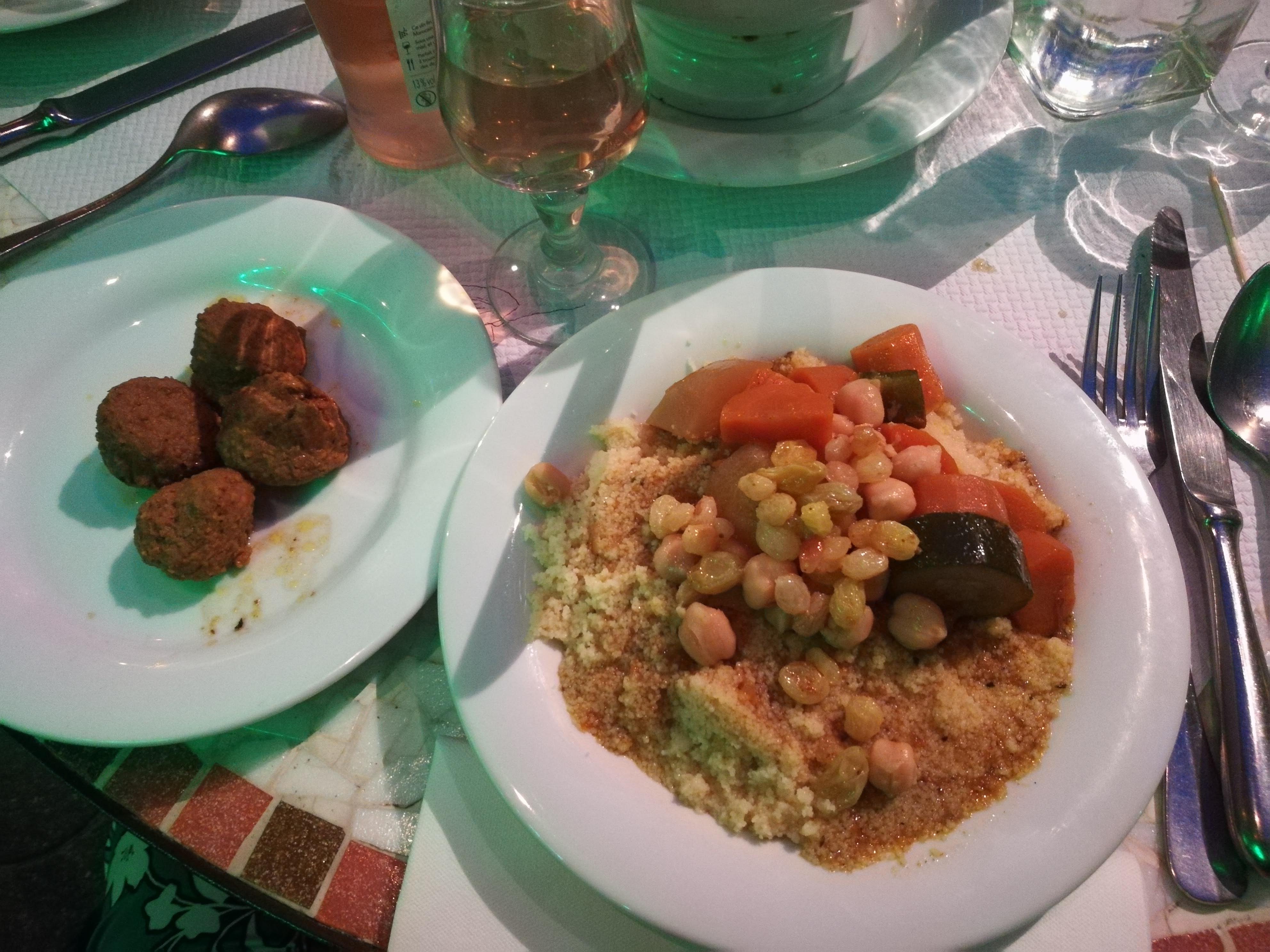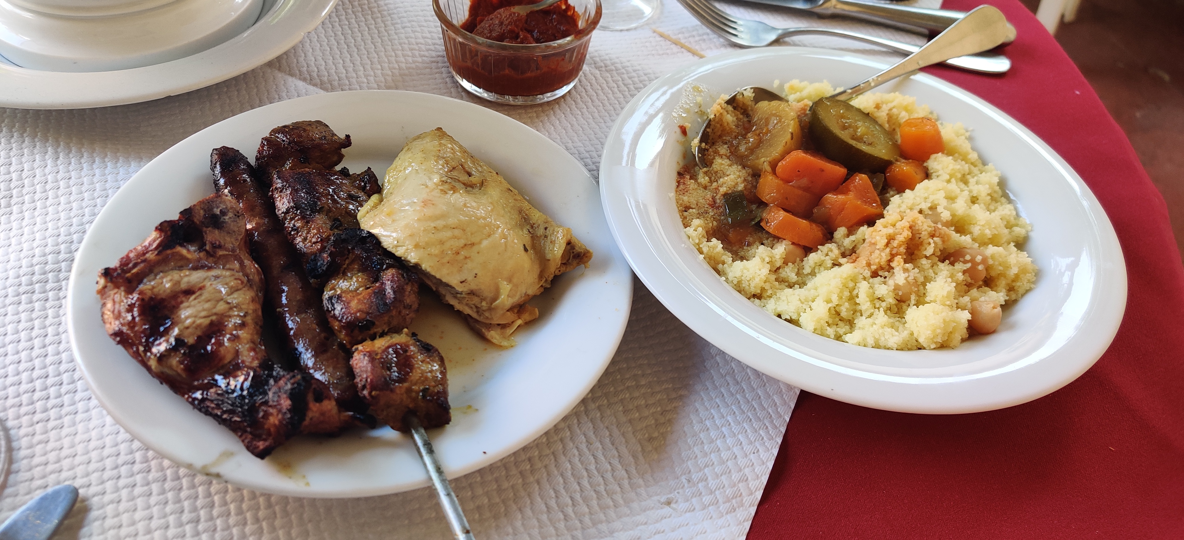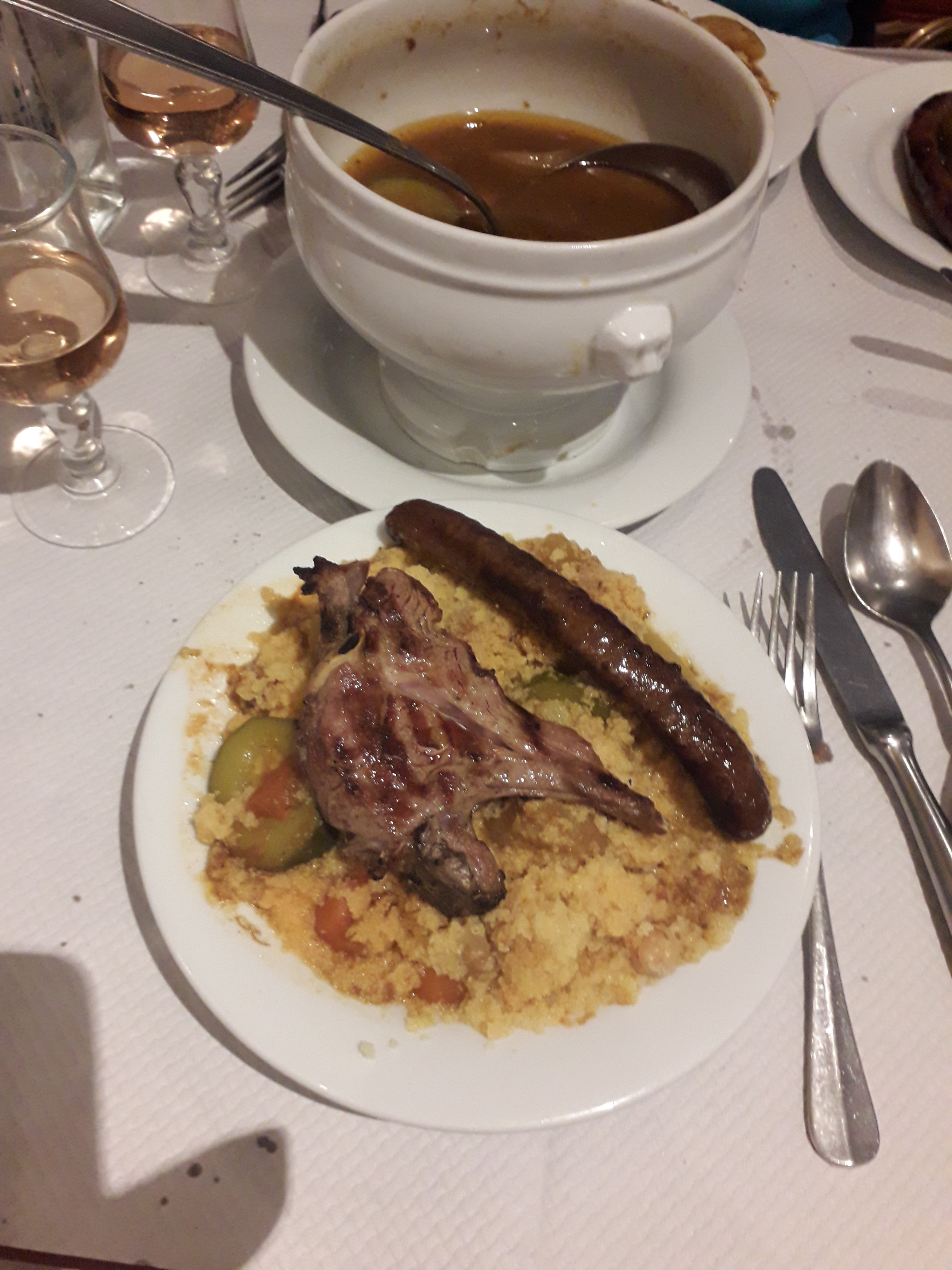 Couscous à emporter… 3 parts prêtes et chaudes à notre arrivée : semoule/légumes parfaits, brochettes des mouton très bonnes, merguez pas assez cuites, boulettes moins que passables… 57€ pour 3 pars a emporter, c’est trop cher => mauvais rapport qualité /prix