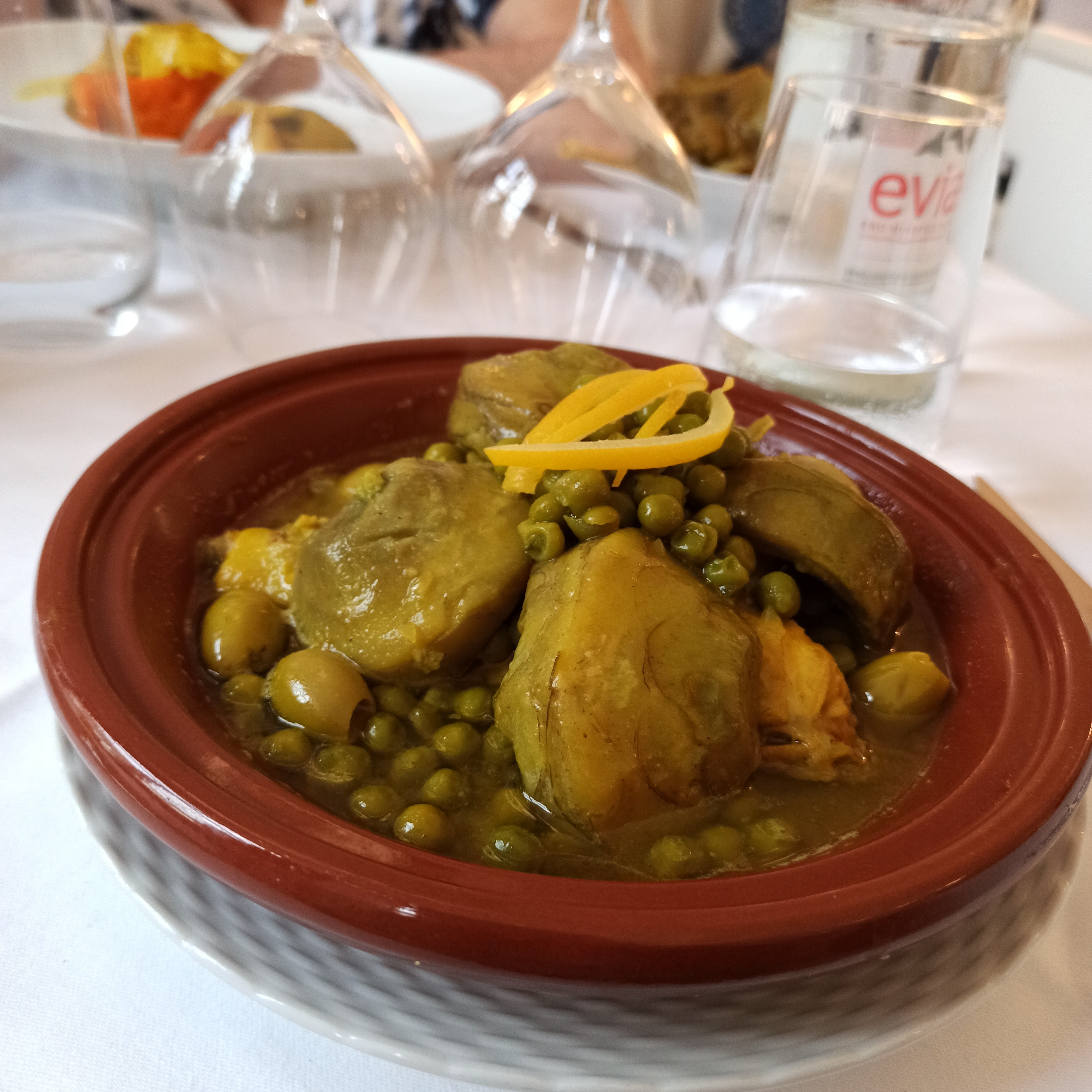 Tajine citron confit c'est une cuisse de poulet avec 10olives et un quart de citron et zéro légume. Le tout hyper salé Heureusement j'ai pû demander de la semoule à 3 euros 50 l équivalent de 3cuilleres à soupe,avec deux jets de poudre d'épices dessus !!! Pas un raisin sec....pas coriandre bref si vous avez faim et que vous avez l'expérience des coucous et tajines vous allez être surpris de cette formule minimaliste avec rapport qualité prix outrageant. La cuisse et un verre de vin gris et hop 25euros. Tajine sans légumes c'est un affront aux traditions orientales! Je préfère aller à Briare chez Marie Claire grillade. Là au moins on mange tajines et coucous réels dans la convivialité et un décor traditionnel et travaillé. Si vous avez faim, passez votre chemin