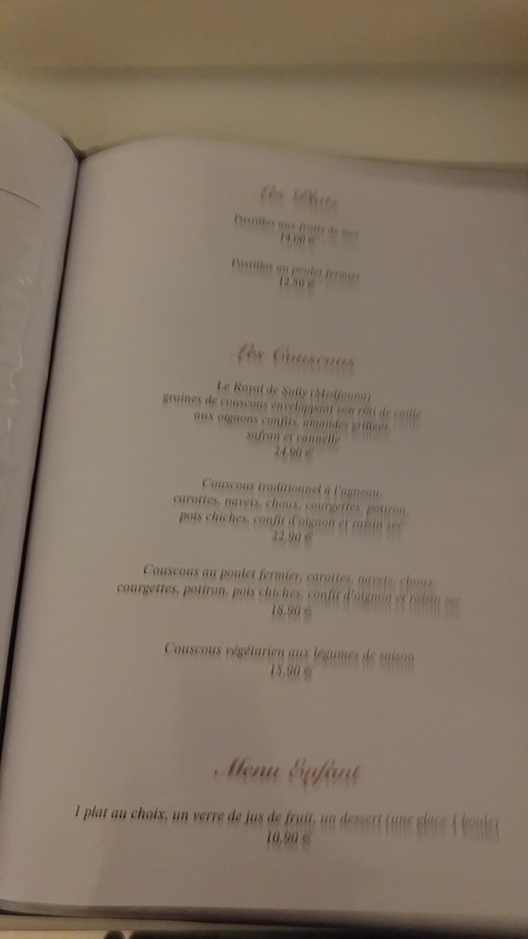Le rapport qualité/prix n'y est pas. Nous avons commandé 2 coucous (plat direct) qui ne sont arrivés à notre table qu'une heure après notre commande. Nous l'avons mangé en 20 minutes, tant il était petit (semoule en fond d'acciette creuse, avec dessus, 4 petits morceaux de légumes : carotte, pomme de terre, chou et courgette). Le tout pour 25 € l'assiette. En dessert : pas de pâtisseries orientales. Ce n'est plus le restaurant qu'il était. Payer ce tarif là (100€ pour 2), ce n'est pas un problème si la qualité et la quantité sont au rendez-vous. Le sourire et le pétillant de la serveuse ne font pas tout.