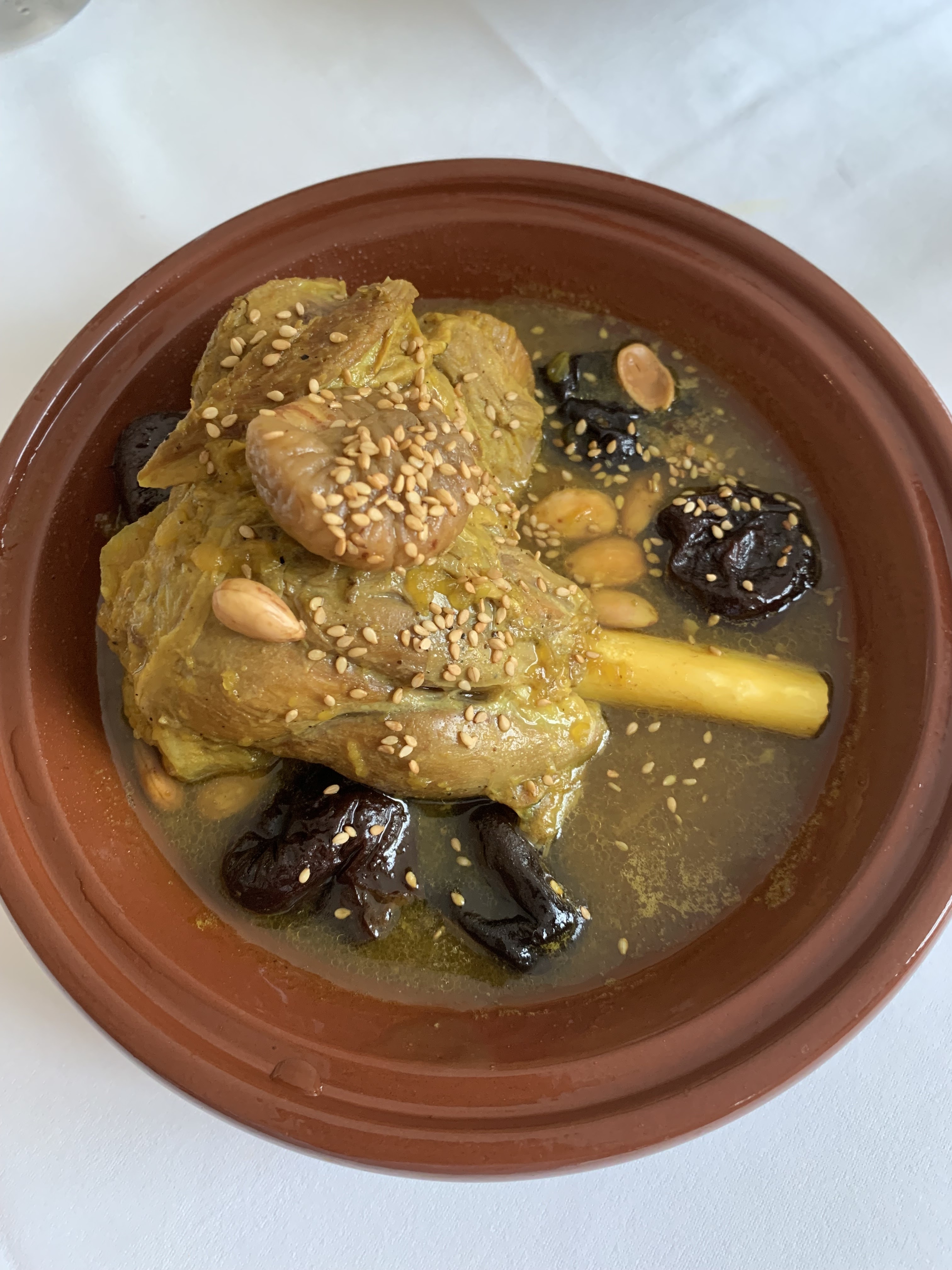 Très déçus. Les tajines aux pruneaux , figues et amandes n ' avaient aucune saveur , ni aucune figue.Plat Très fade. L' agneau était cependant fondant mais sans goût Le thé à la menthe était plus que banal, des feuilles de menthe ds les verres auraient été appréciés. Absence de pâtisseries orientales un samedi soir à 20h, c ' est un comble pour un restaurant oriental. Nous ne recommandons pas du tout ce restaurant pour sa cuisine. Le cadre est cependant très joli et soigné. La serveuse est agréable mais ne cherche pas à proposer un autre dessert pour combler l absence de pâtisseries.