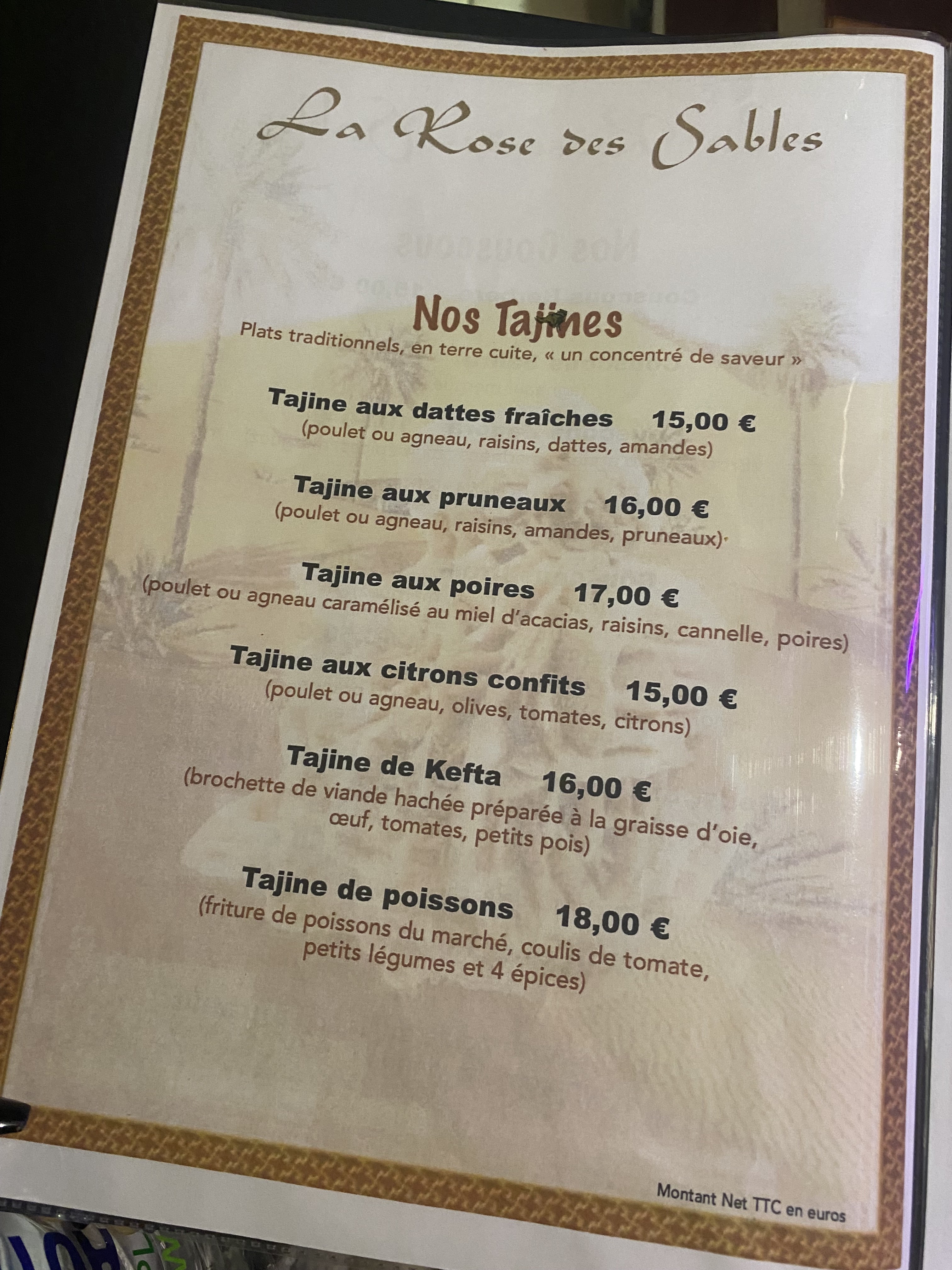 Neauphle le soir c’est pas folichon - c’est dommage parce qu’à l’image de Montfort l’Amaury on a bien une jolie place centrale, une église, de quoi se garer et pourtant c’est assez désert. Juste avant d’arriver sur cette place il y a la rose du désert. On aurait tort de prendre à emporter, la déco est sympa et l’accueil aussi. La carte est assez vaste, le choix comprend tous les classiques et il faut être difficile pour ne pas trouver qqch de bon à manger. On ne connaissait pas l’endroit mais il me semble que le resto existe de longue date. La aussi ça mériterait plus de fréquentation. Ça vaut le coup. Mon seul bémol si je puis dire c’est un relent de cigarette qui doit venir de la cour ou de l’arrière boutique et ça c’est un peu pénible pour un non fumeur. Pour le reste c’était bien et on y retournera. Très bon couscous El Fassi (sucré salé) et la viande d’agneau est super tendre. Madame a apprécié l’harissa maison à priori très bonne selon elle.