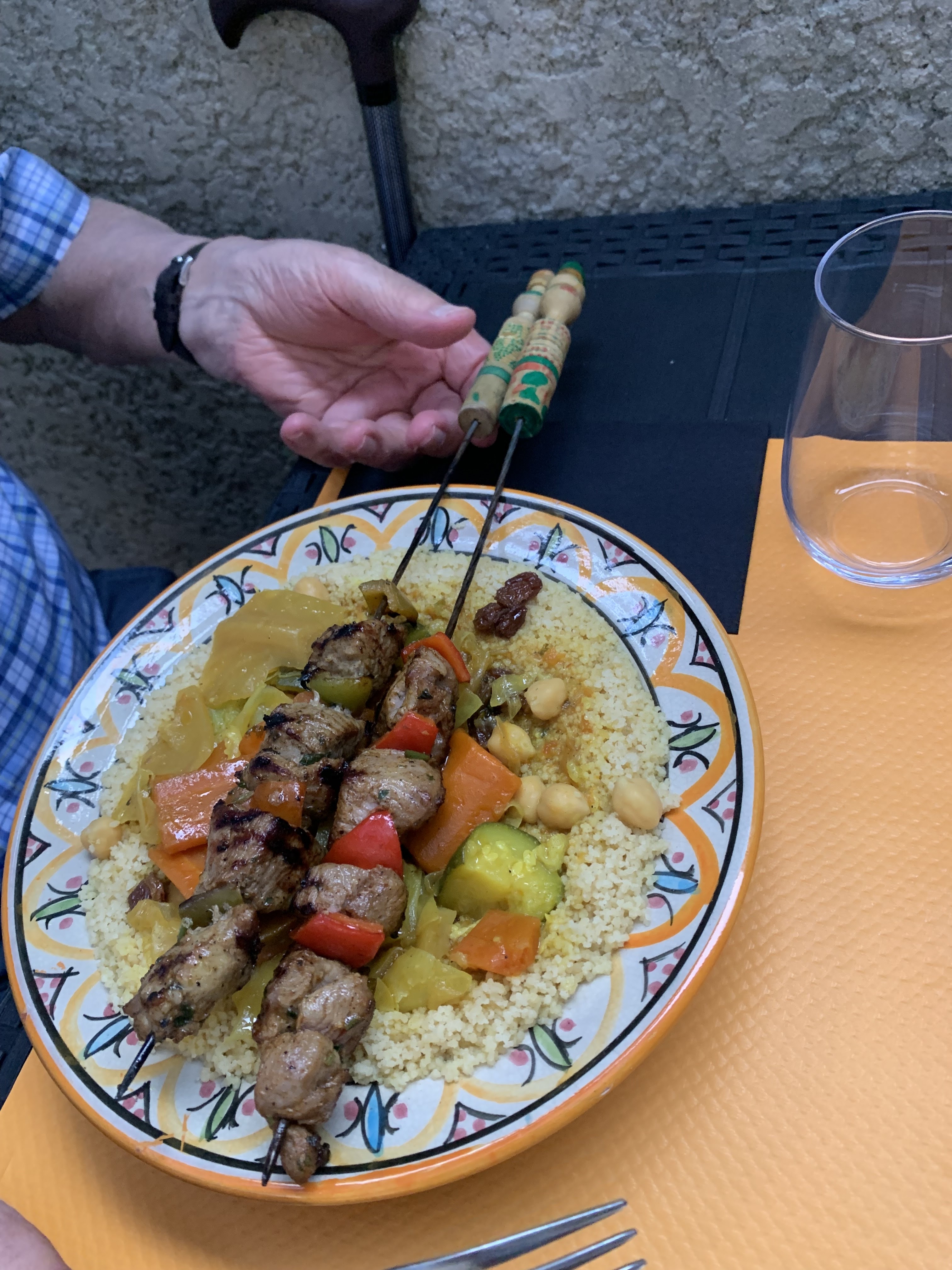Je n'ai s jamais mangé un coucous aussi fade, les légumes étaient très durs, mal cuit, 2 brochettes, 5 ou 6 pois chiches, 4 ou 5 raisin sec. J'ai été très déçue.☹️
