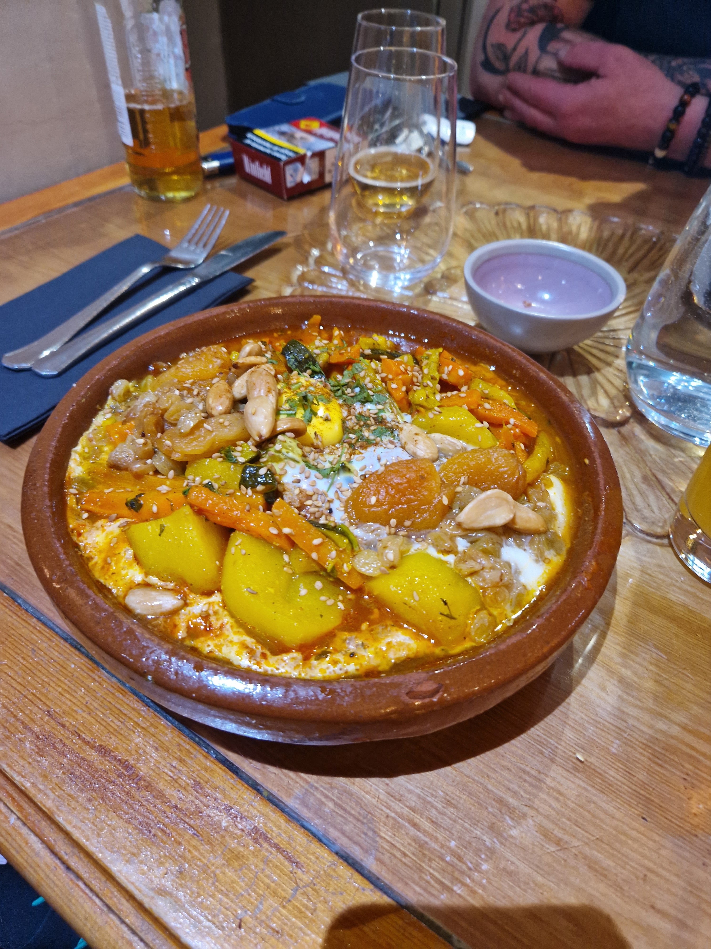 Très bon tajine végétarien, j'ai beaucoup apprécié le fait qu'il y ait du pain matlouh pour saucer le tajine ! Belle présentation et service très rapide, tout le monde était satisfait et les assiettes sont repartis en cuisine très propres