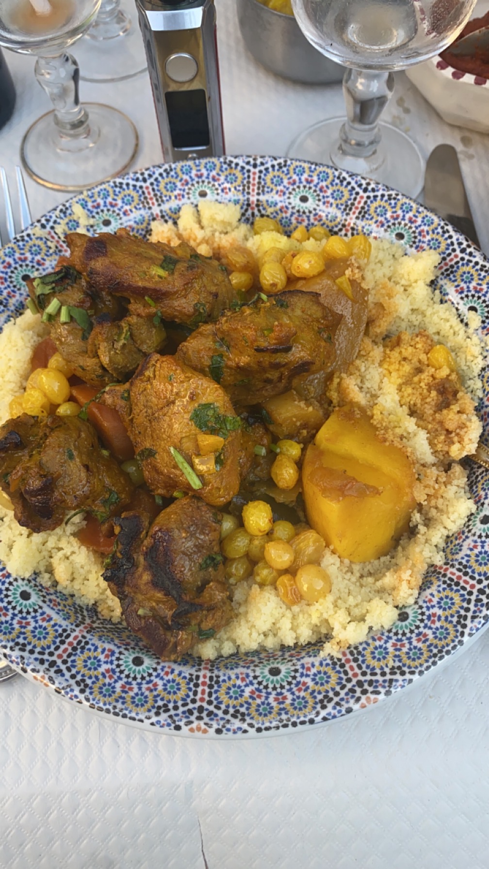 Repas typiquement arabique. Spécialité : le couscous. Très belle décoration et présentation !