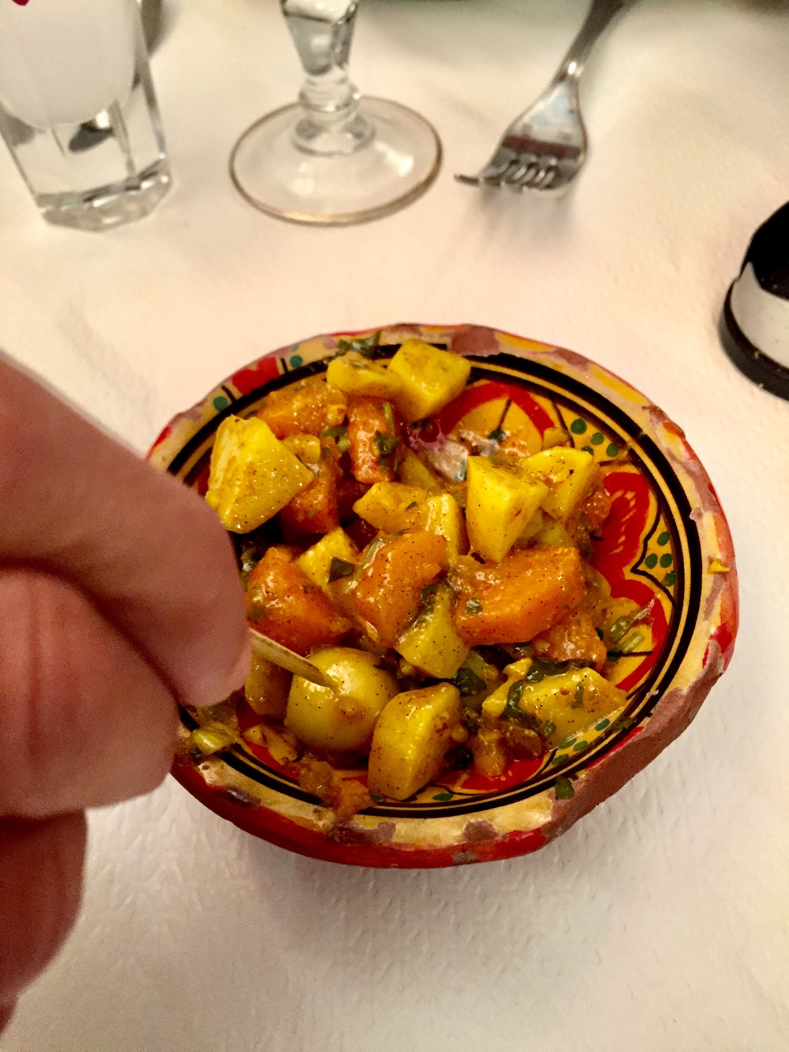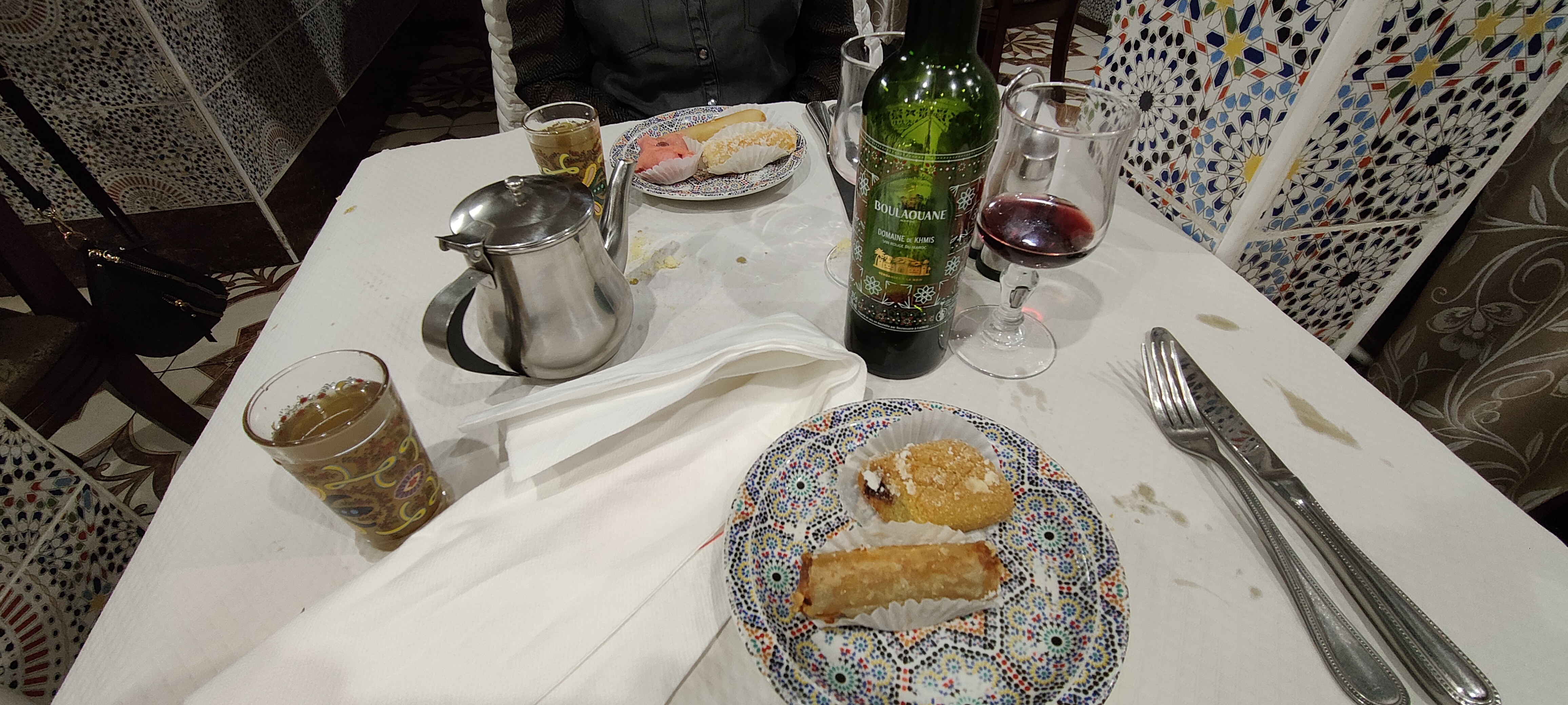 Un sans faute pour ce restaurant (ne pas s’arrêter à la devanture ni à la localisation). Nous avons tous les 4 étaient ravis. L’accueil est chaleureux, la déco simple mais jolie et dépaysante, la vaisselle est jolie, les plats sont servis dans des plats individuels et non à l’assiette, les vins proposés sont tous marocains, et enfin c’est excellent. Nous avons mangé une entrée que nous avons partagée pendant l’apéritif, un plat principal, un dessert et avons pris une bouteille de vin. C’est un bon rapport qualité-prix.
