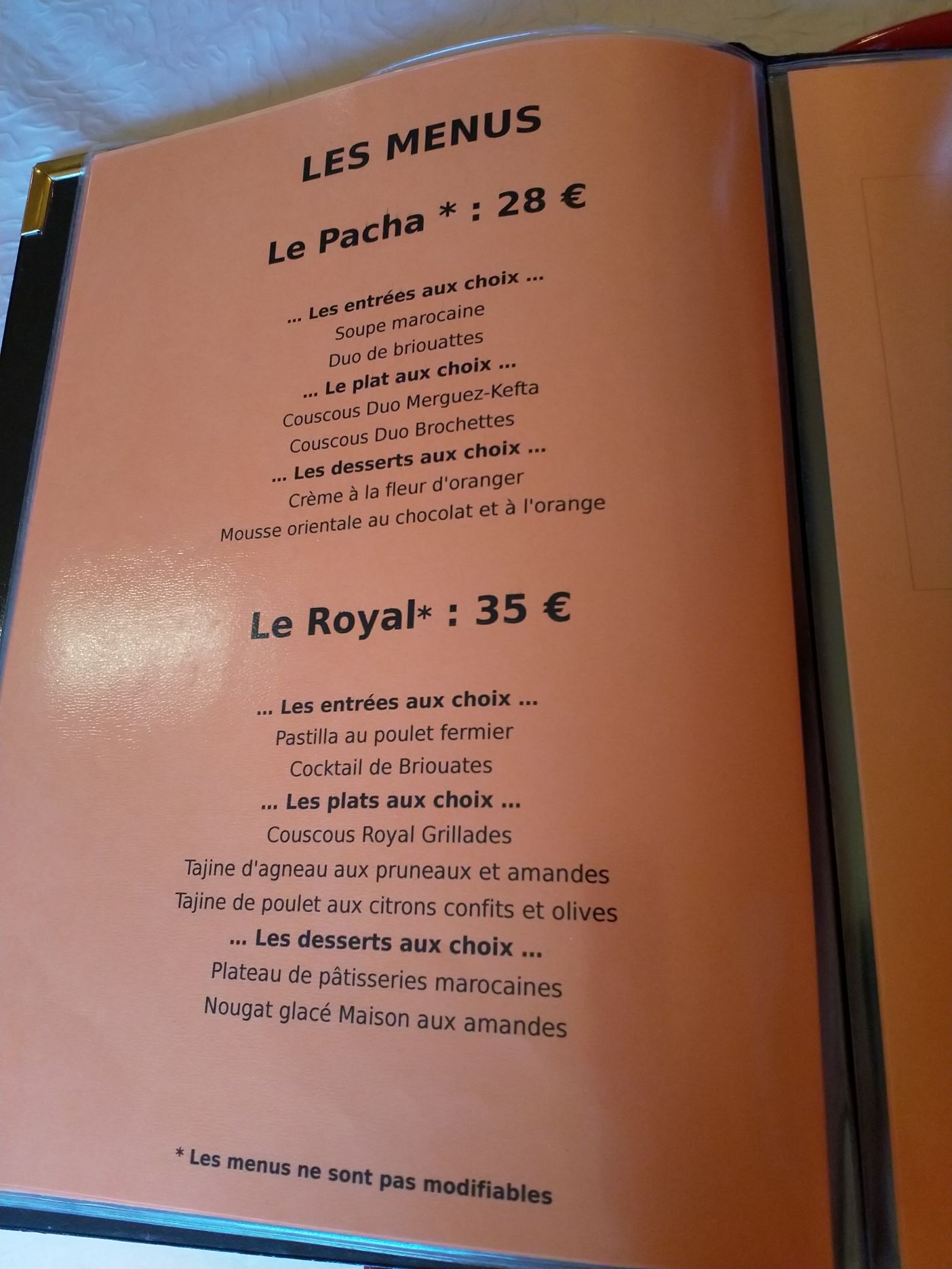Je vois que vous êtes de Portrush en Royaume-Uni et vous avez fait un copier coller de texte sur google et sur tripadviser !! vous avez le droit de ne pas aimer notre couscous. Je vous confirme que le bouillon de notre couscous est 100% végétarien donc il ne peut pas y avoir de viandes dans le bouillon. Les viandes sont cuitent séparément c'est pour garder le goût de chaque aliment. Et pour avoir un bouillon facile à digérer Cuire les viandes dans le bouillon, à pour conséquence d'avoir un bouillon plein de graisses, c'est une méthode de cuisson du siècle dernier. Les clients maintenant font attention à leur santé. Quand au prix, vous savez que la cuisine maison avec des produits frais demande du temps et de la mains-d'œuvre . C'est vrai il y a des restaurants qui font du couscous à volonté à 7,90 euros, nous on peut pas pratiquer ces prix à la table du Maroc.