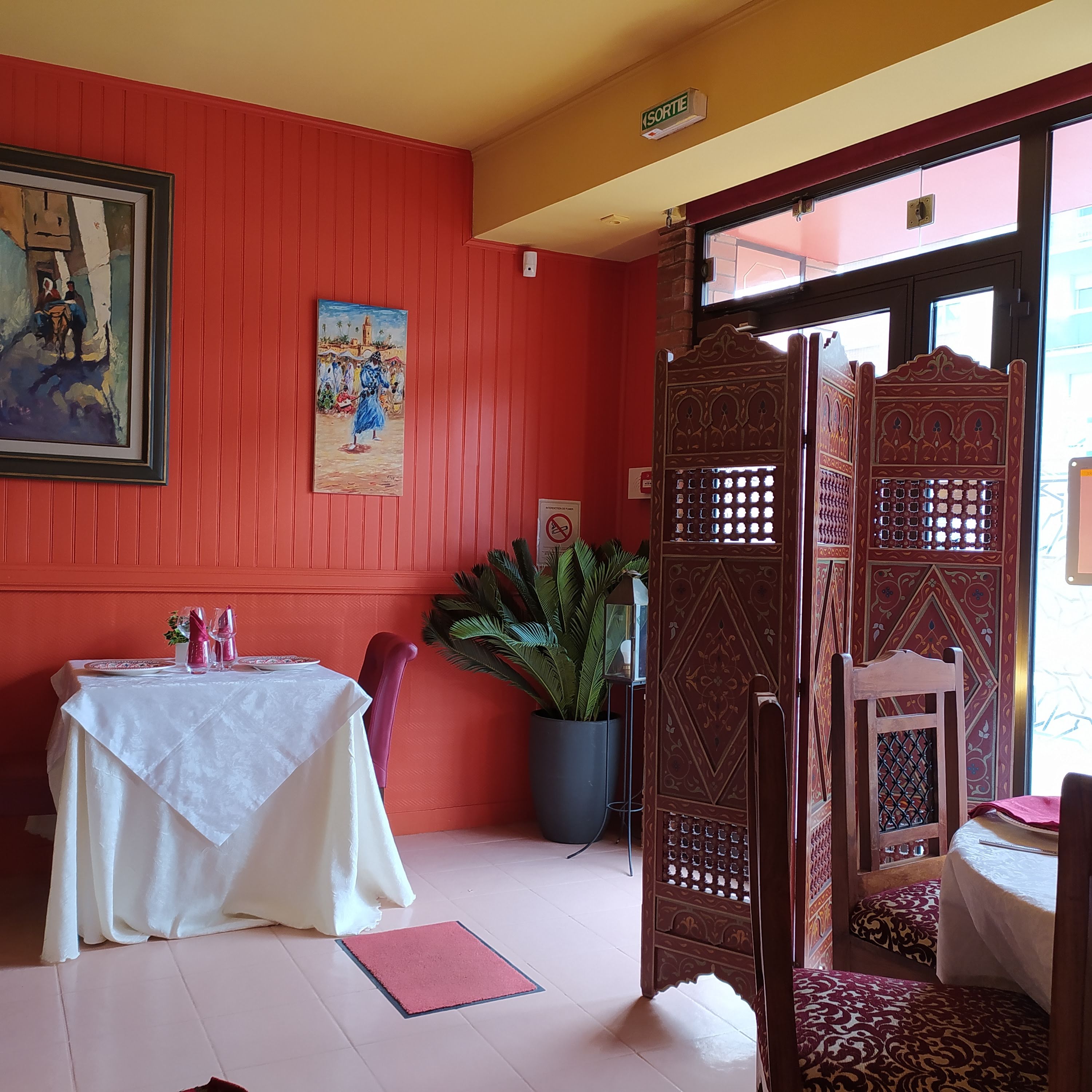 Salle de restaurant sympa et bon accueil. Le couscous est tres tres moyen, le bouillon est insipide manque d' epices et d'assaisonement et n'a pas le gout de viande. De gros morceaux de courgettes bouilli on ete ajoute a la derniere minute sans gout, pois chiches servi separement et comme les assiettes sont froides, le couscous refroidi rapidement. La seule chose assaisonne est l'addition, plutot cher !