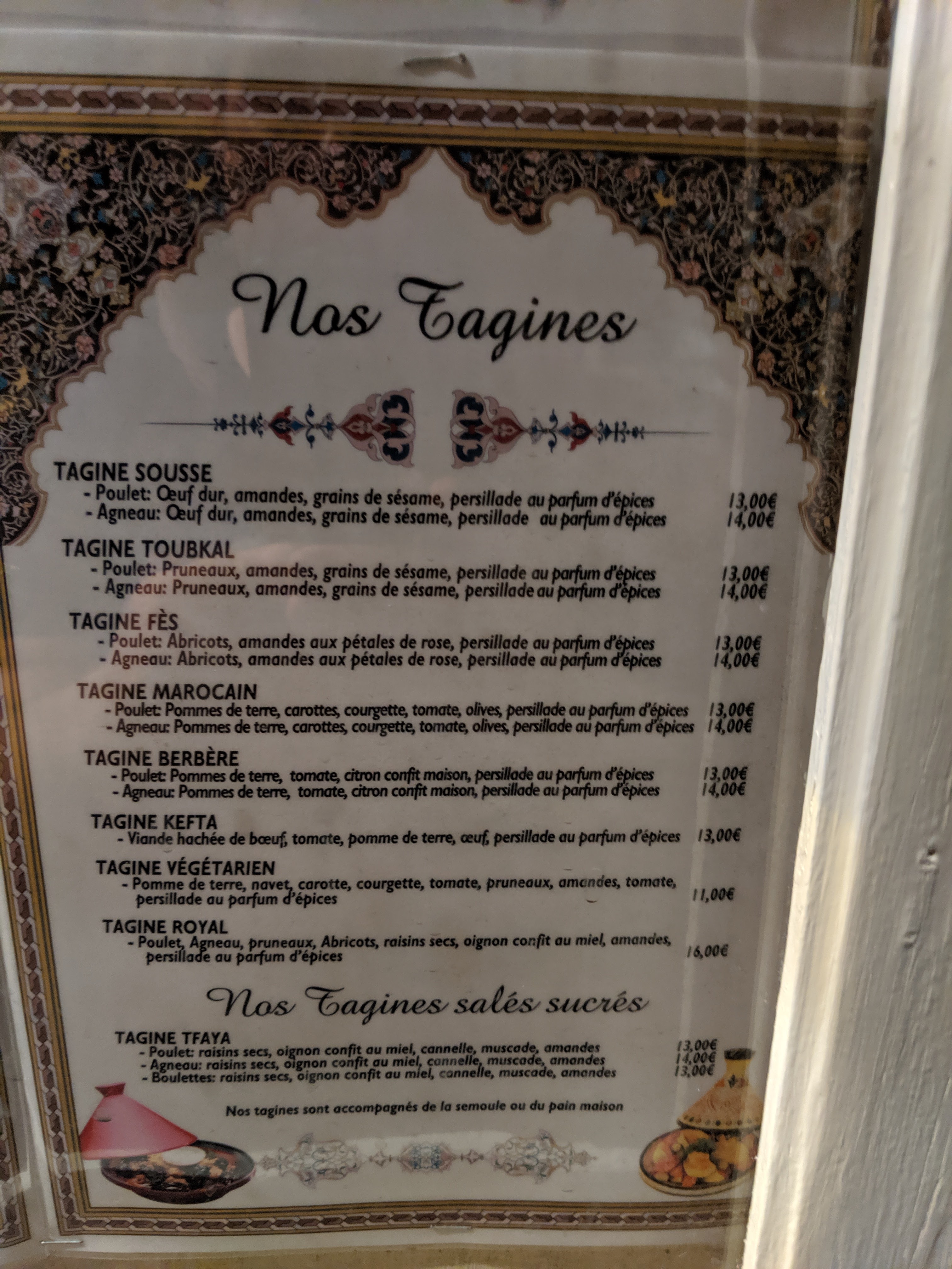 Lieu très joli J'ai pris un tajine Fès à l'agneau et c'était très bon et ce n'est pas très cher mais copieux Les propriétaires sont très gentils en plus
