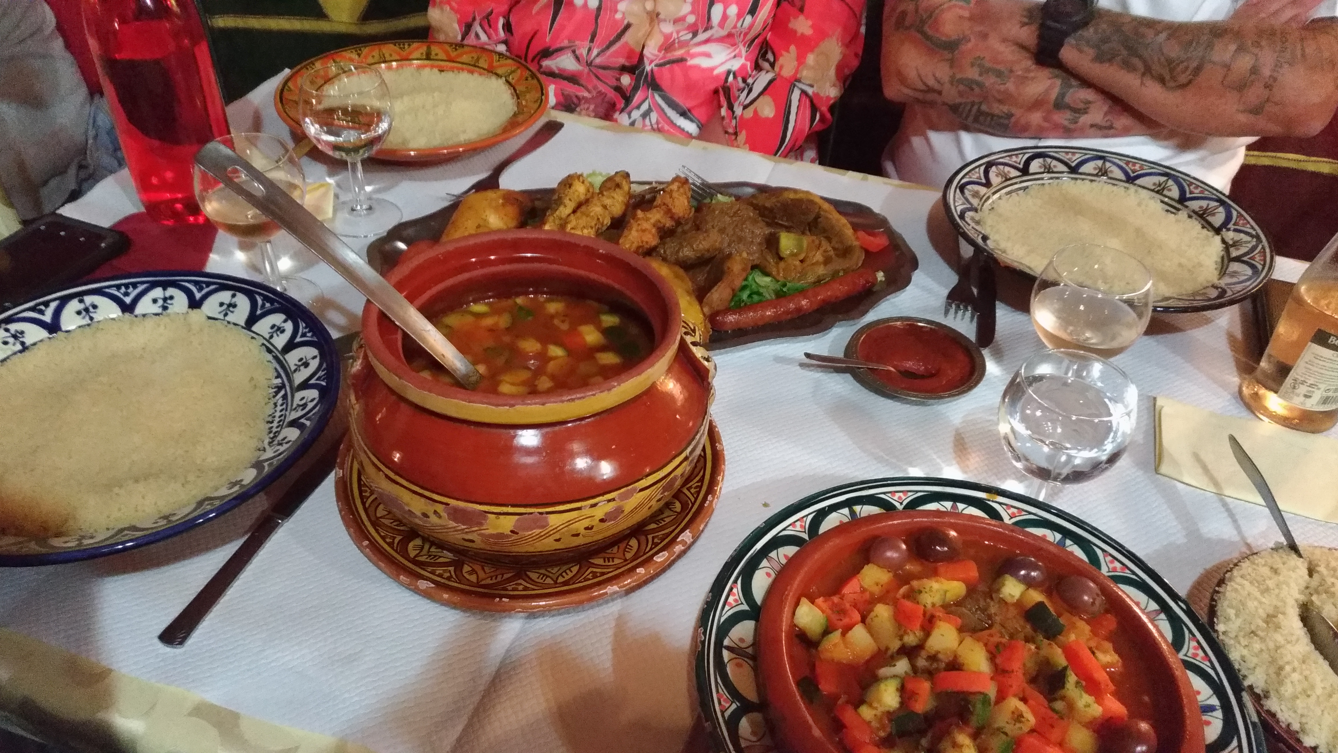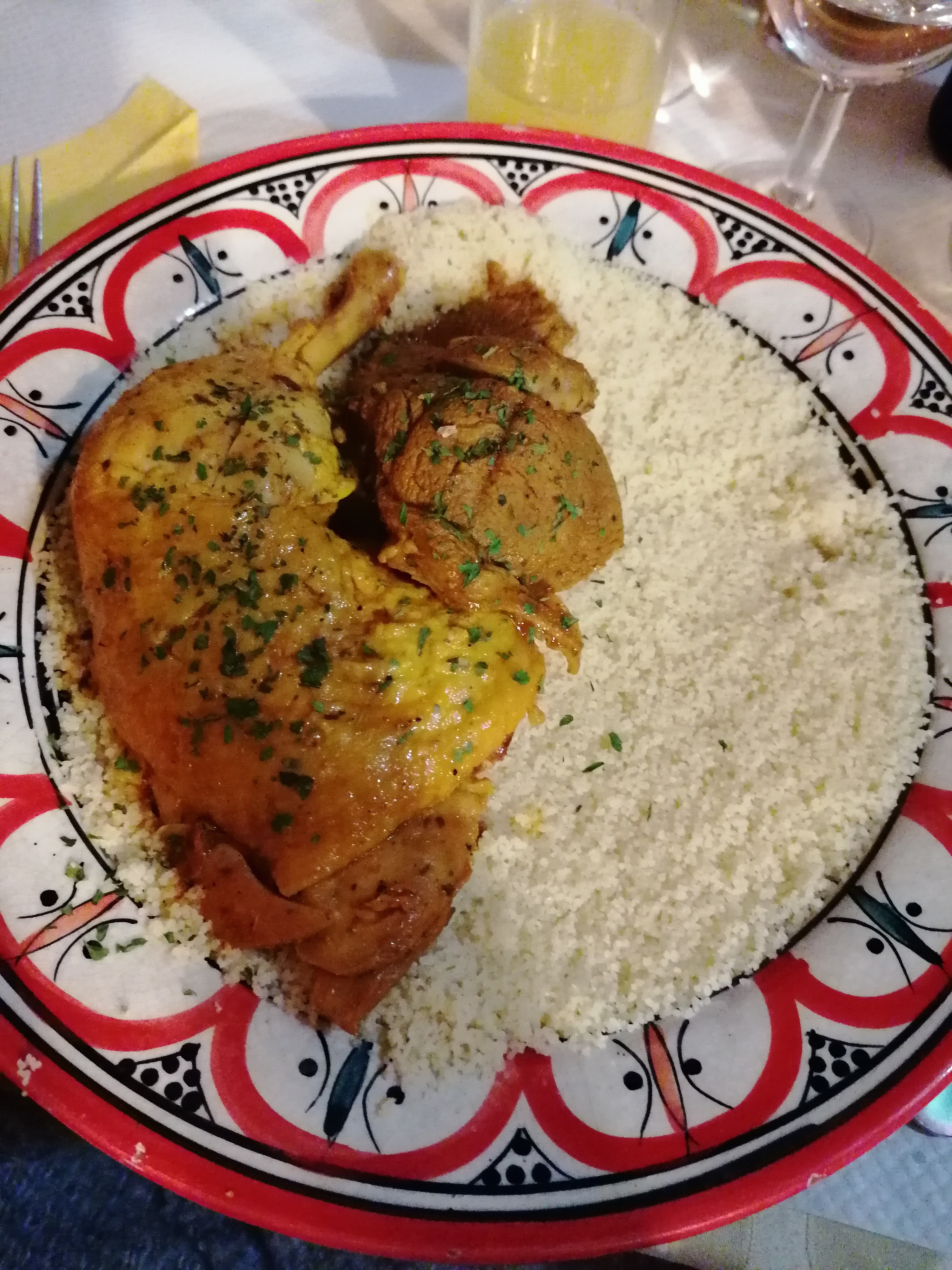 Repas délicieux, personnel très gentil, courtois et très serviable. J ai pris un couscous royal et ma femme un tajine. Nous nous sommes régalés. Au dessert nous avons pris une orange givrée et un citron givré. Pour finir nous avons bu un thé à la menthe qui était très bon. Nous avons pris une bouteille de rosé qui était très bon.