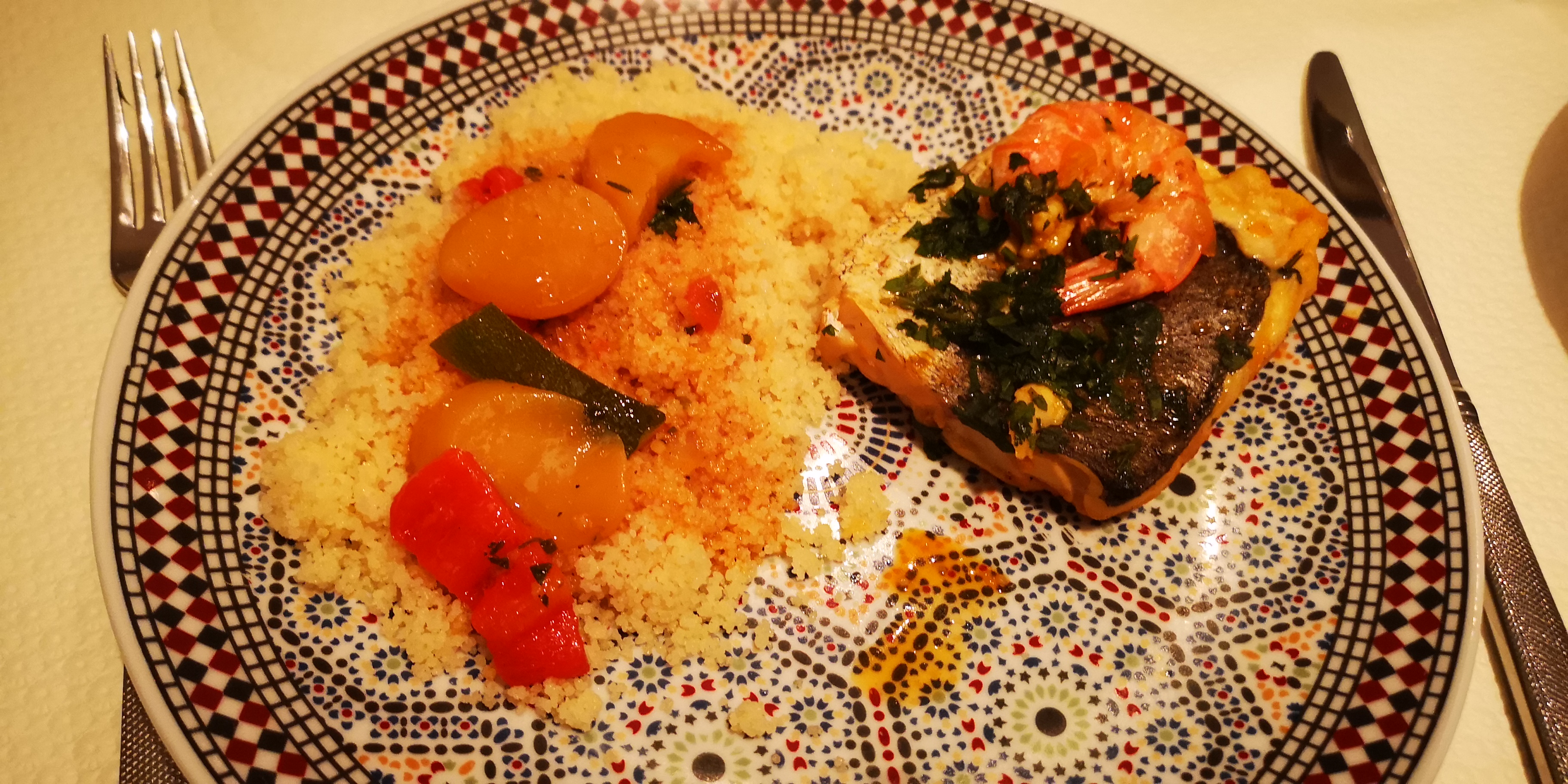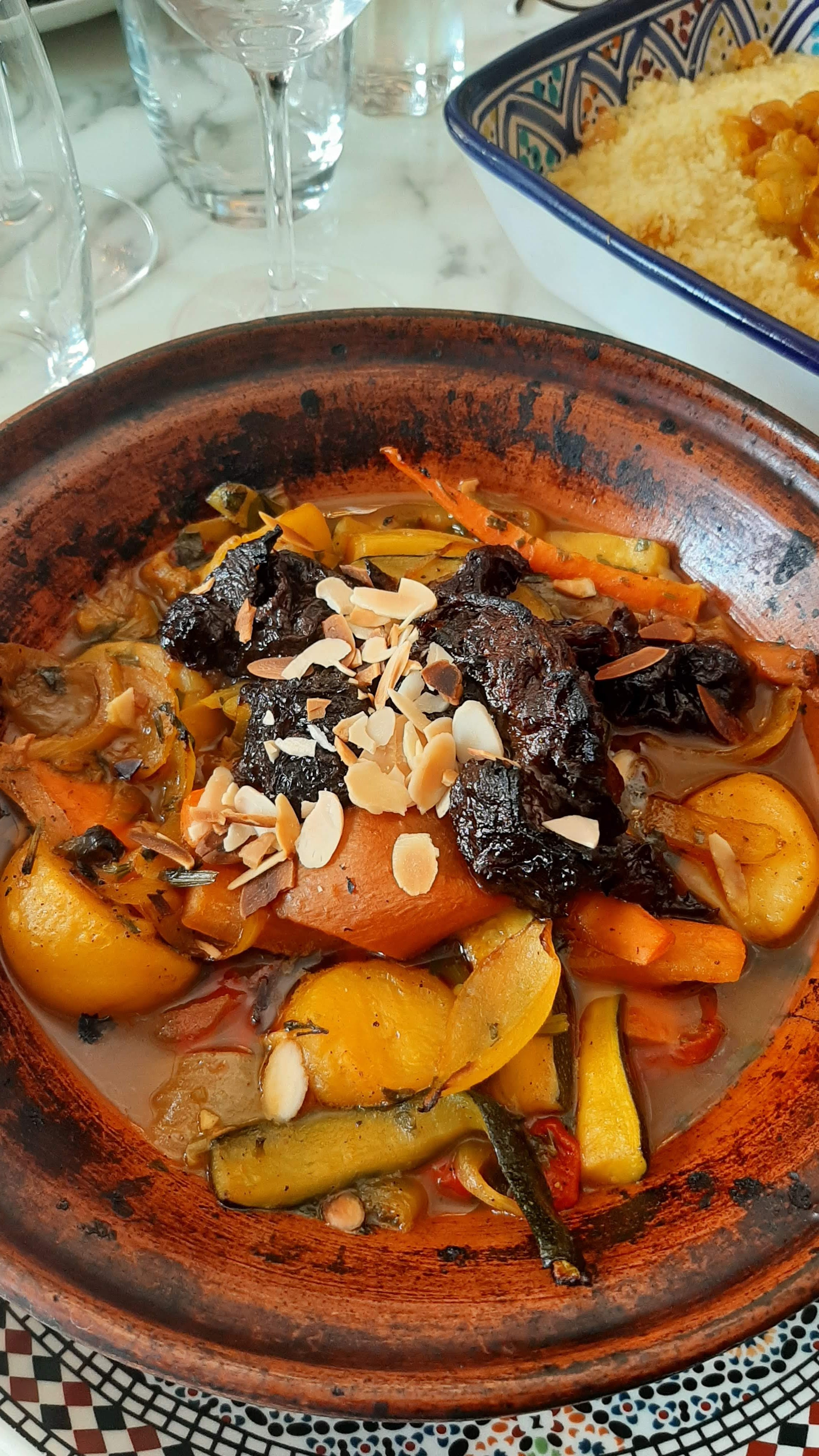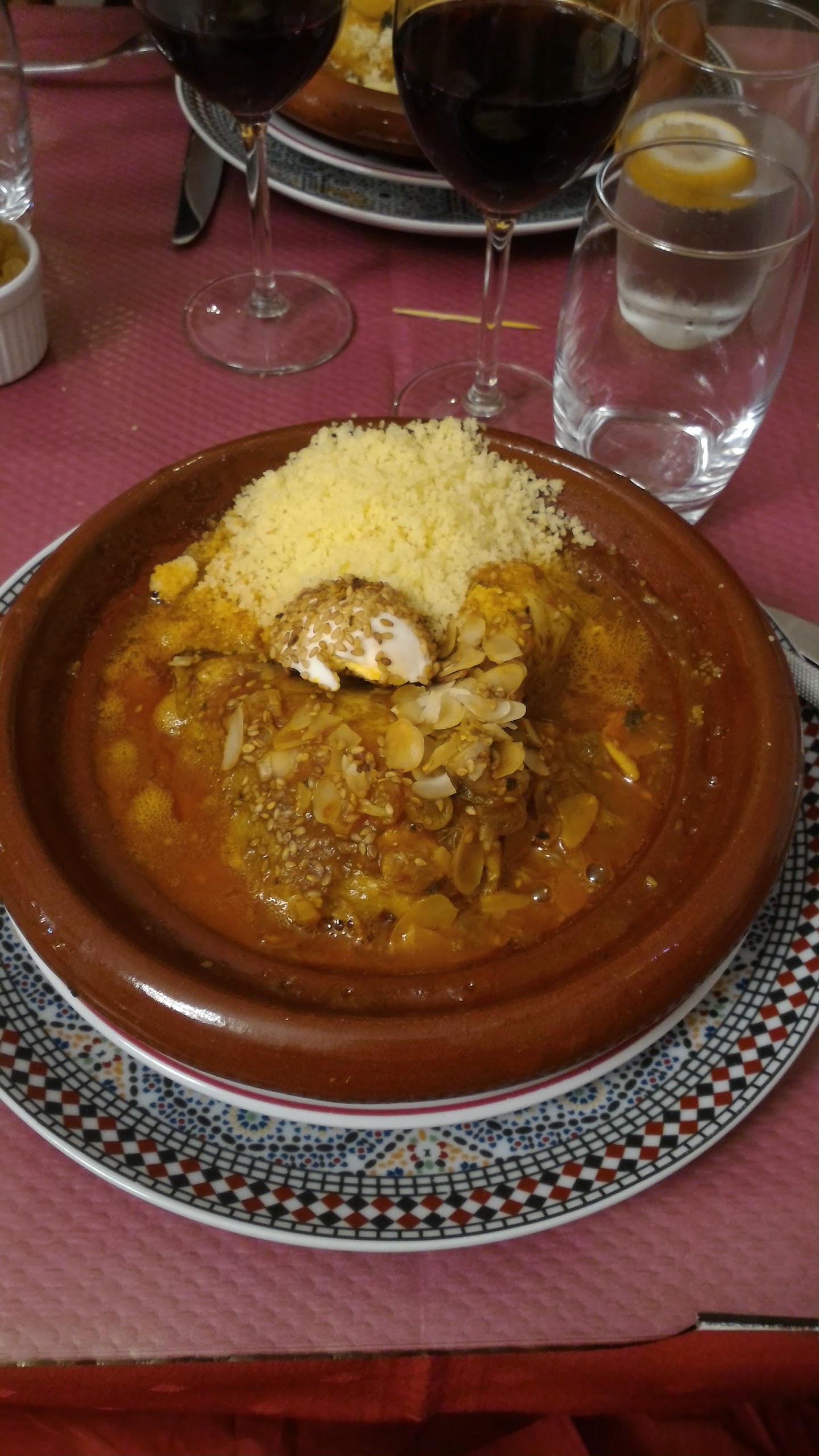 Très beau décor. Cela m'ennuie mais malgré l'accueil chaleureux j'ai été déçue. Tout d'abord le serveur avait un masque jamais sur le nez voir pas du tout sur le visage. Couscous royal. Légumes, sauce et semoule excellents. Par contre, merguez cuites à part cela se sentait. Poulet à peine cuit et agneau pas cuit du jour. Le vin bon. Bref consignes d'hygiène en payant à revoir gravement. Dommage.