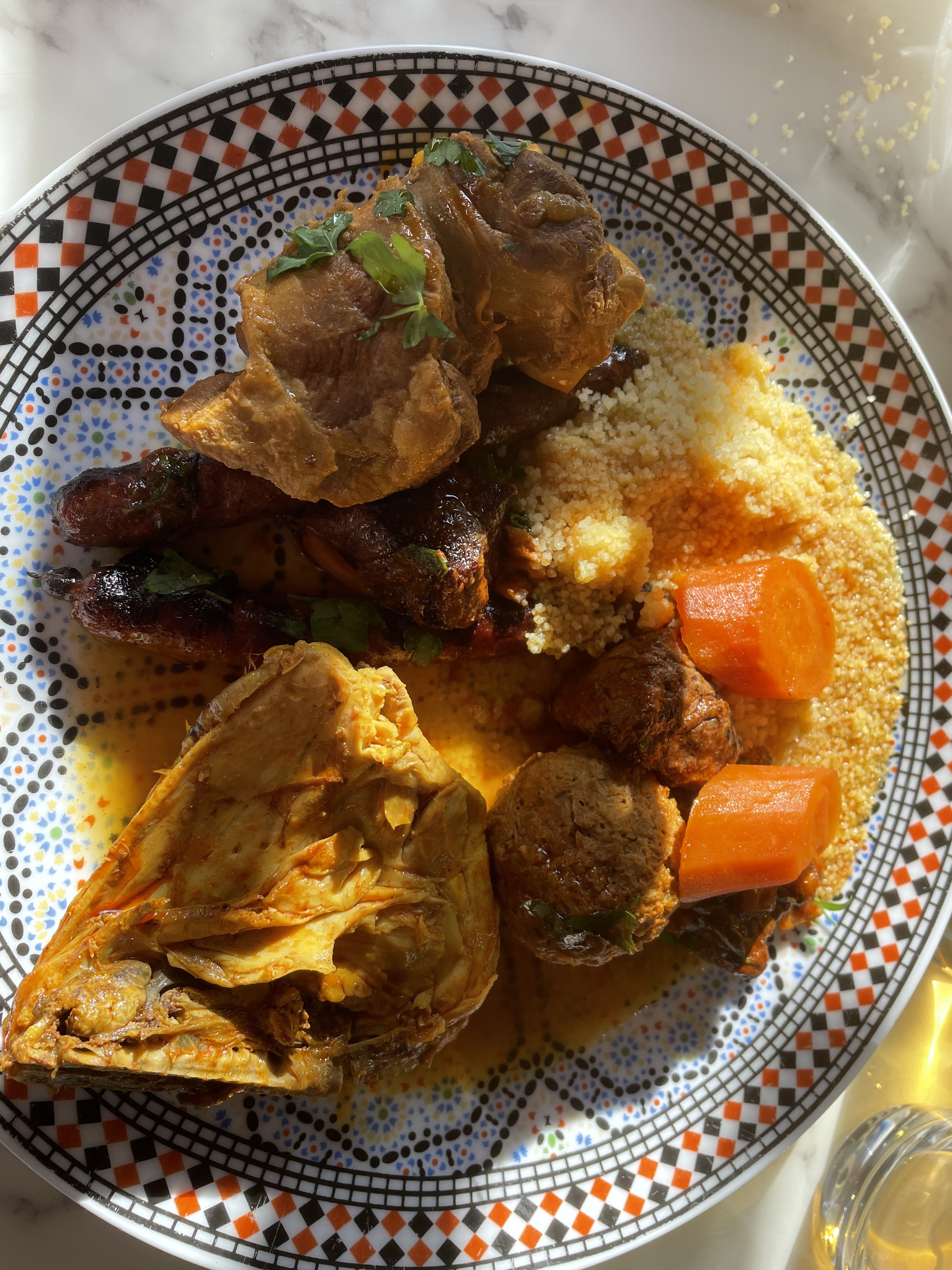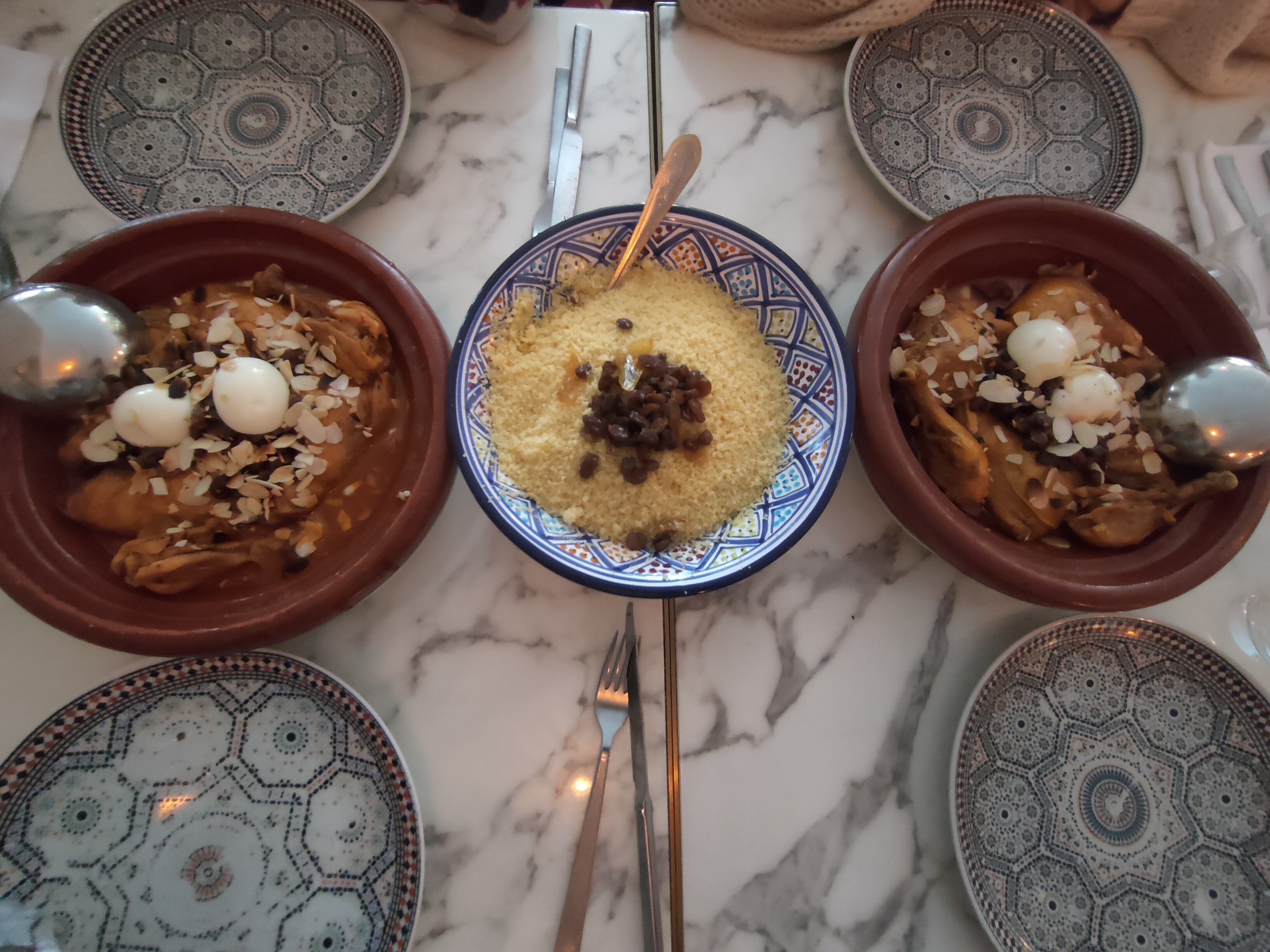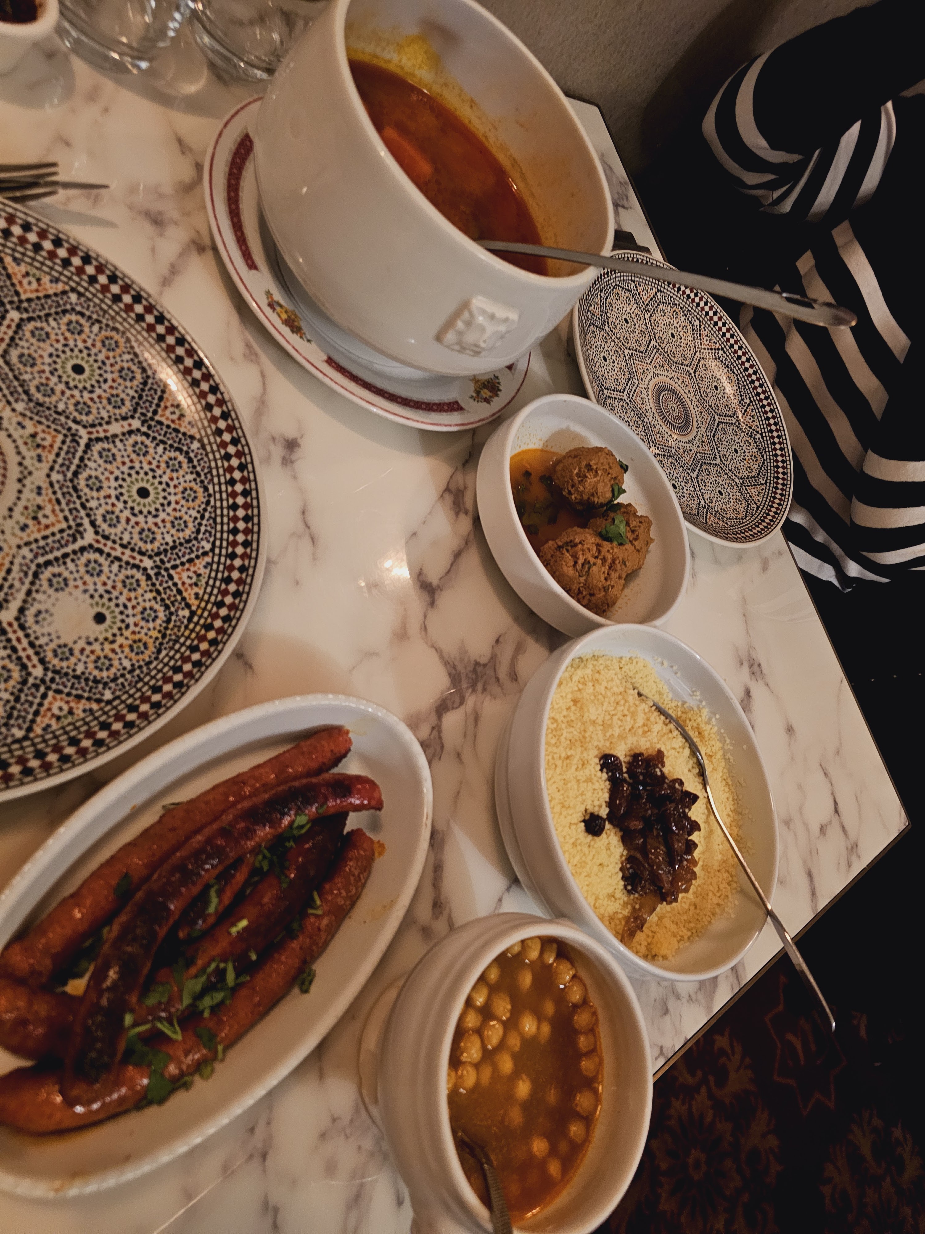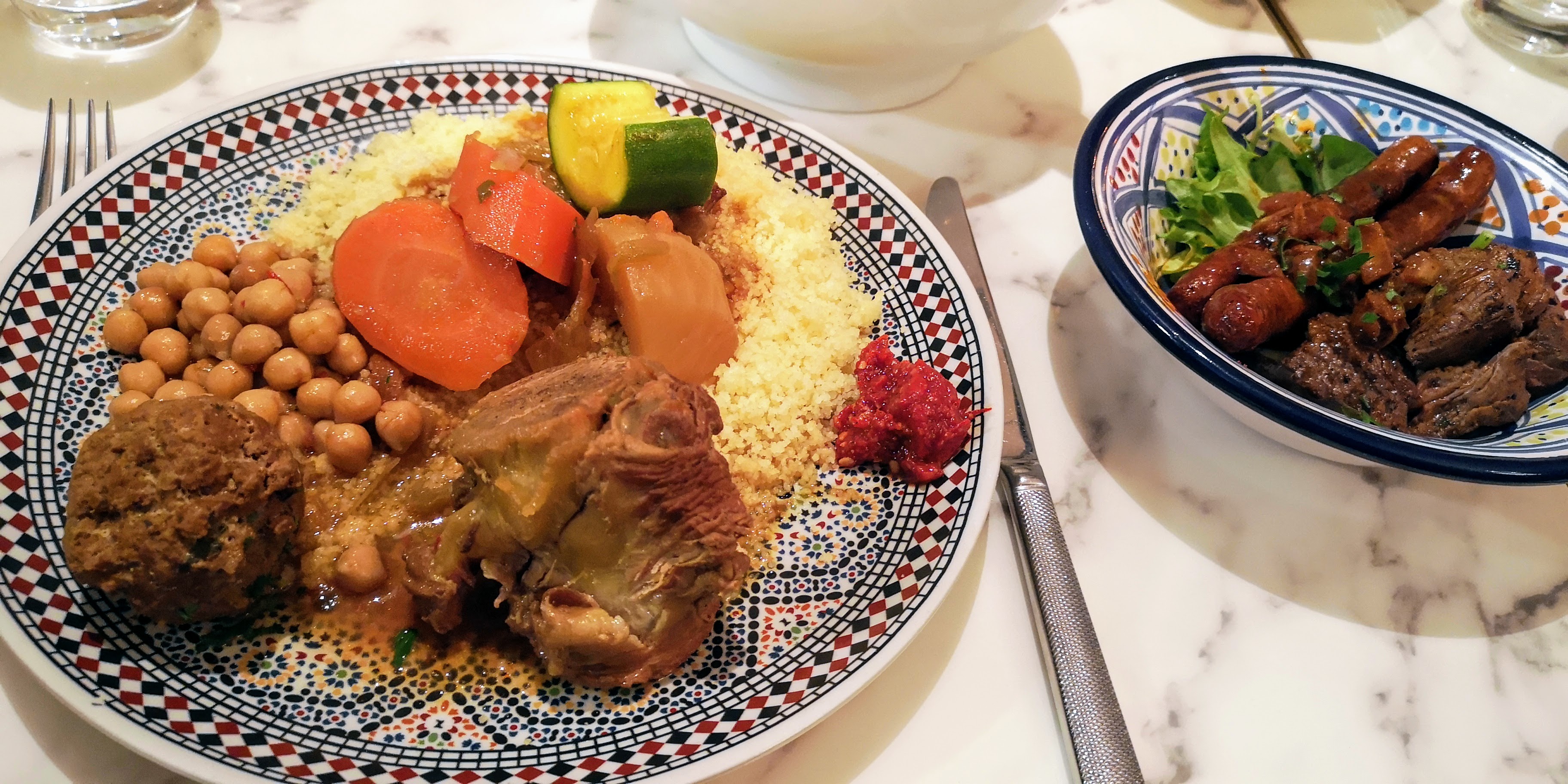 La déco est vraiment superbe, faite avec goût et sobriété, on s'y sent tout de suite bien. Jusqu'à ce que le serveur avec son sourire faux et ses blagues à deux balles vienne prendre la commande. Le couscous royal est impressionnant avec tous ces petits plats. Par contre la viande est dure et les merguez pas bonnes. Ça sent la viande achetée au rabais !