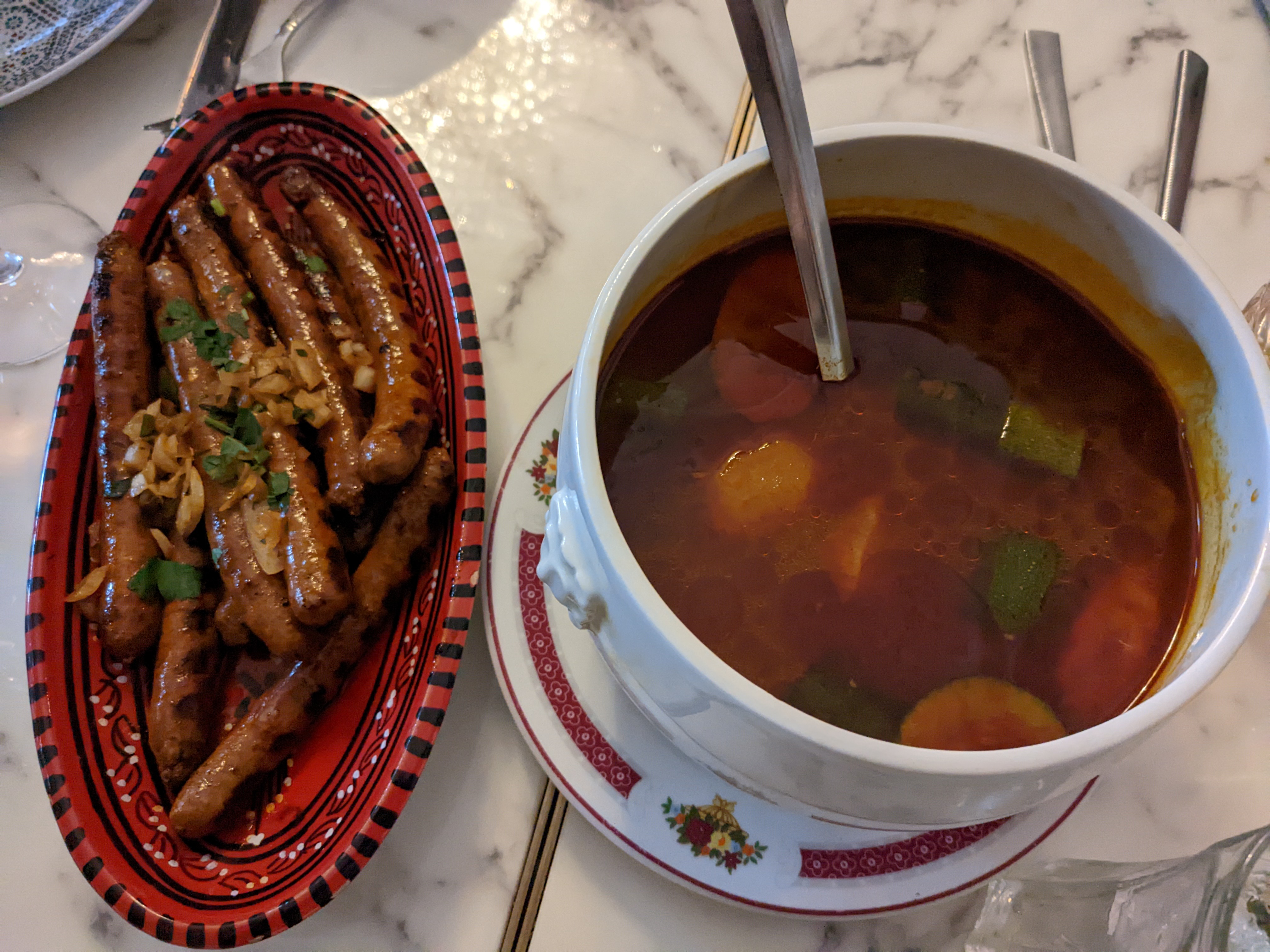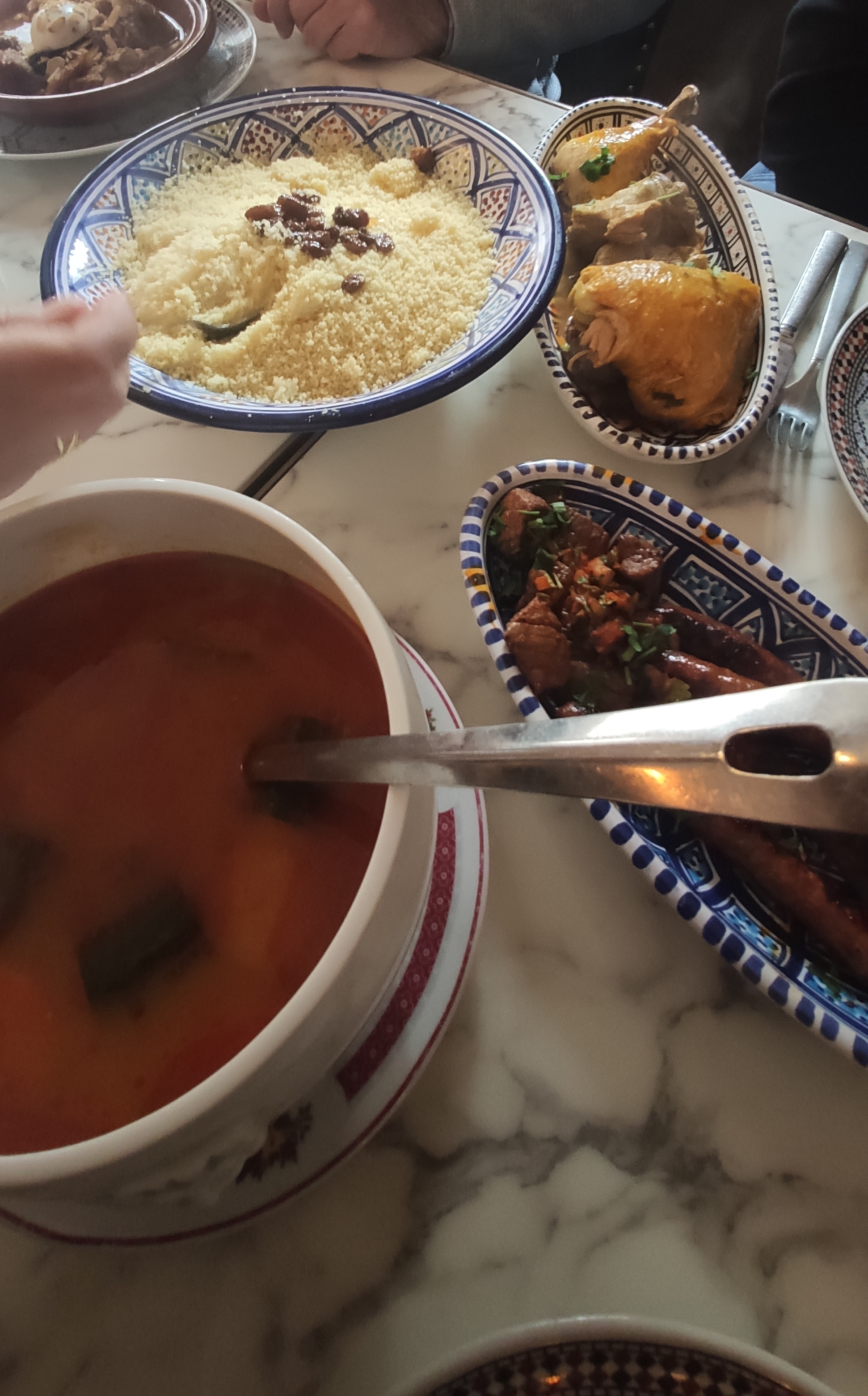 Nous y étions pour le déjeuner un dimanche. Commande prise rapidement, entrée servie rapidement Nous n'avons pas eu le temps de finir la moitié de l'entrée que notre couscous (très bon) a été servi. En une heure, on avait fini de manger. Tous les serveurs étaient pressés que les clients finissent.