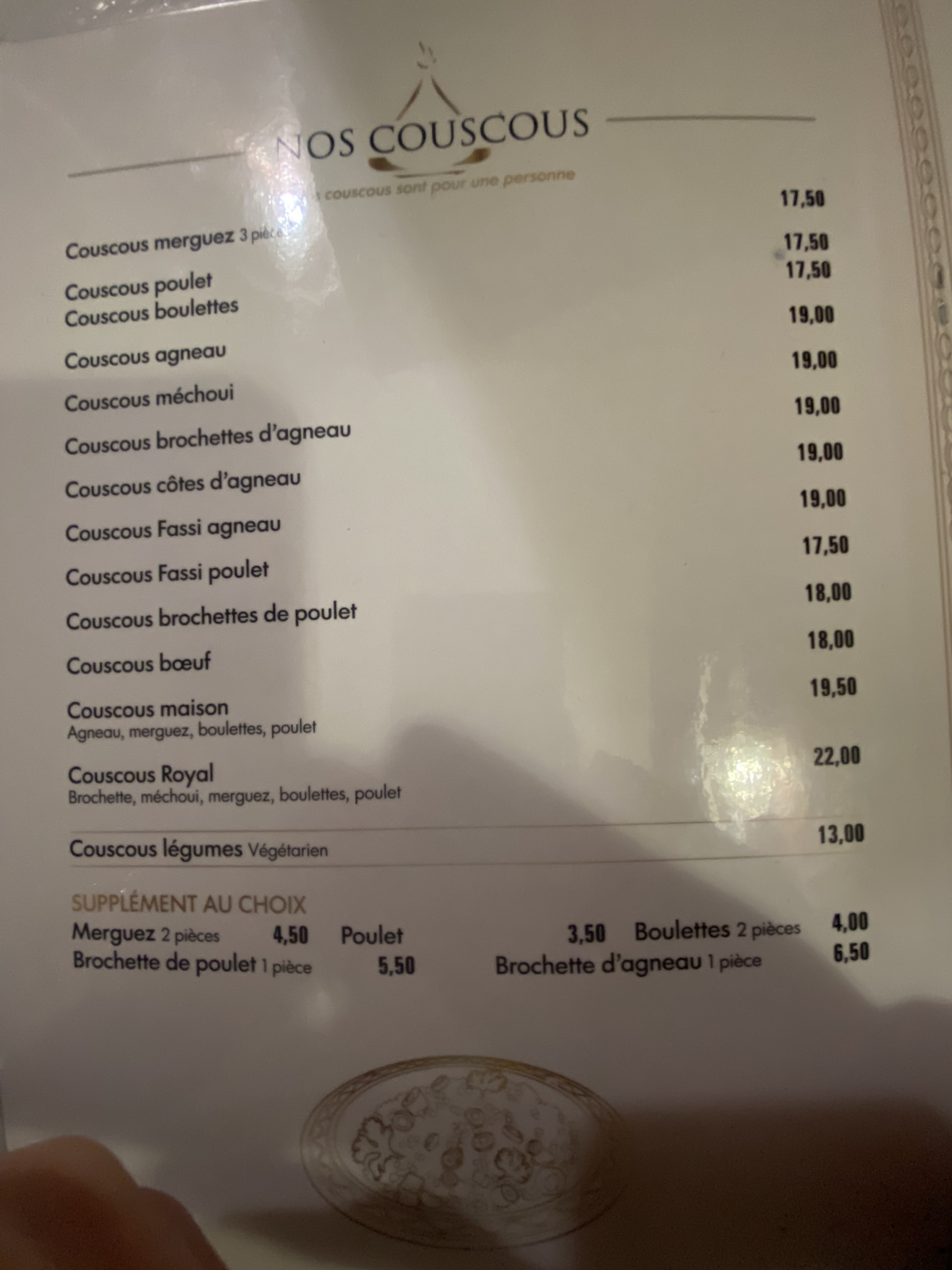 Ma tante m'a fait découvrir ce restaurant, cela faisait longtemps que je n'avais pas mangé de couscous. J'ai été ravie et j'étais remplie. Dommage que je n'ai pu prendre de dessert tellement c'était délicieux l'entré et le plat.