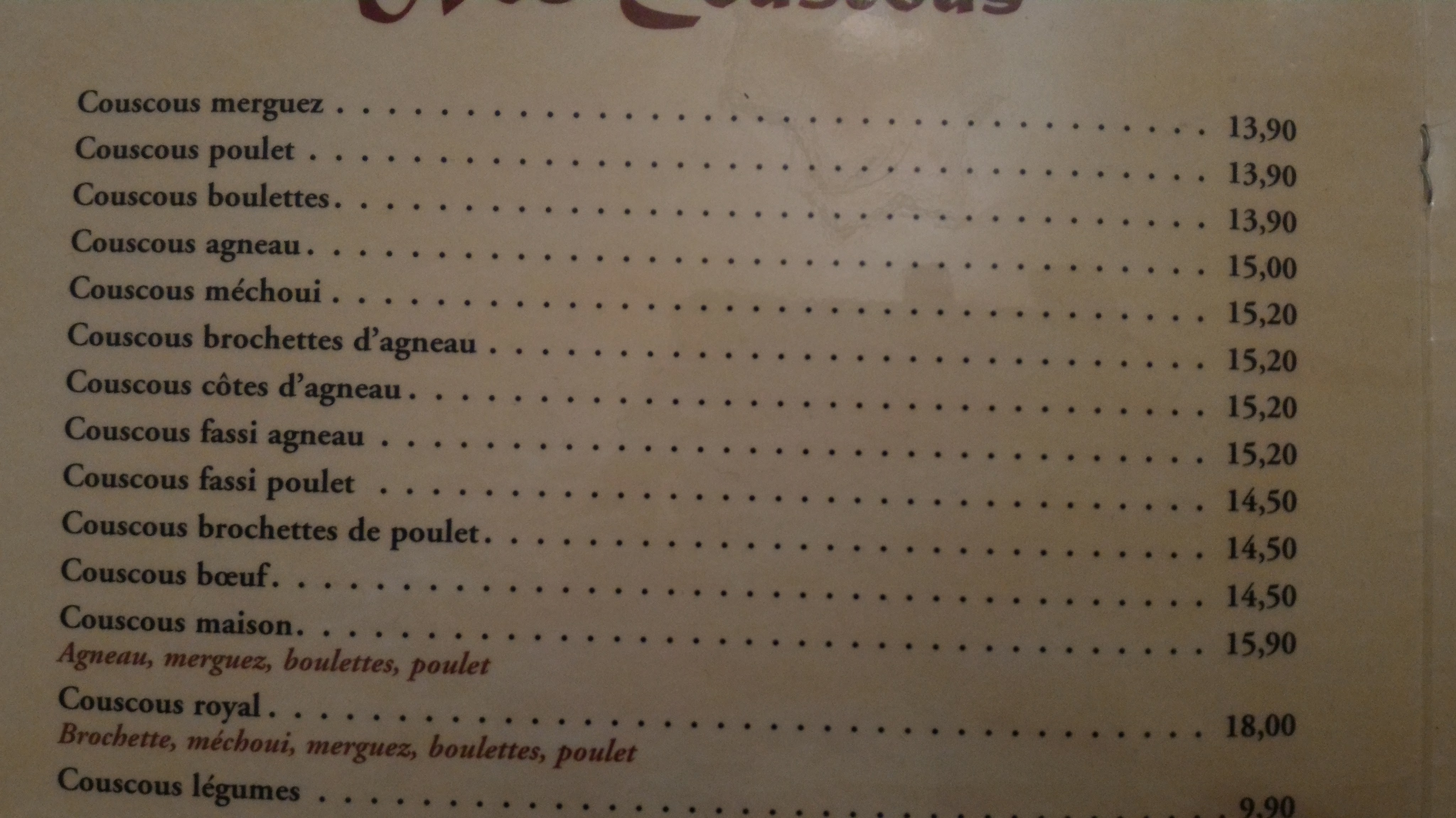 J'ai atterri la bas par hasard et je crois que je n'ai jamais mangé un couscous aussi bon. J'ai pris celui avec 4 viandes, j'étais rassasié pour toute la journée. Les portions sont très généreuses, pleines de saveur. Allez y les yeux fermés et le ventre vide ;)