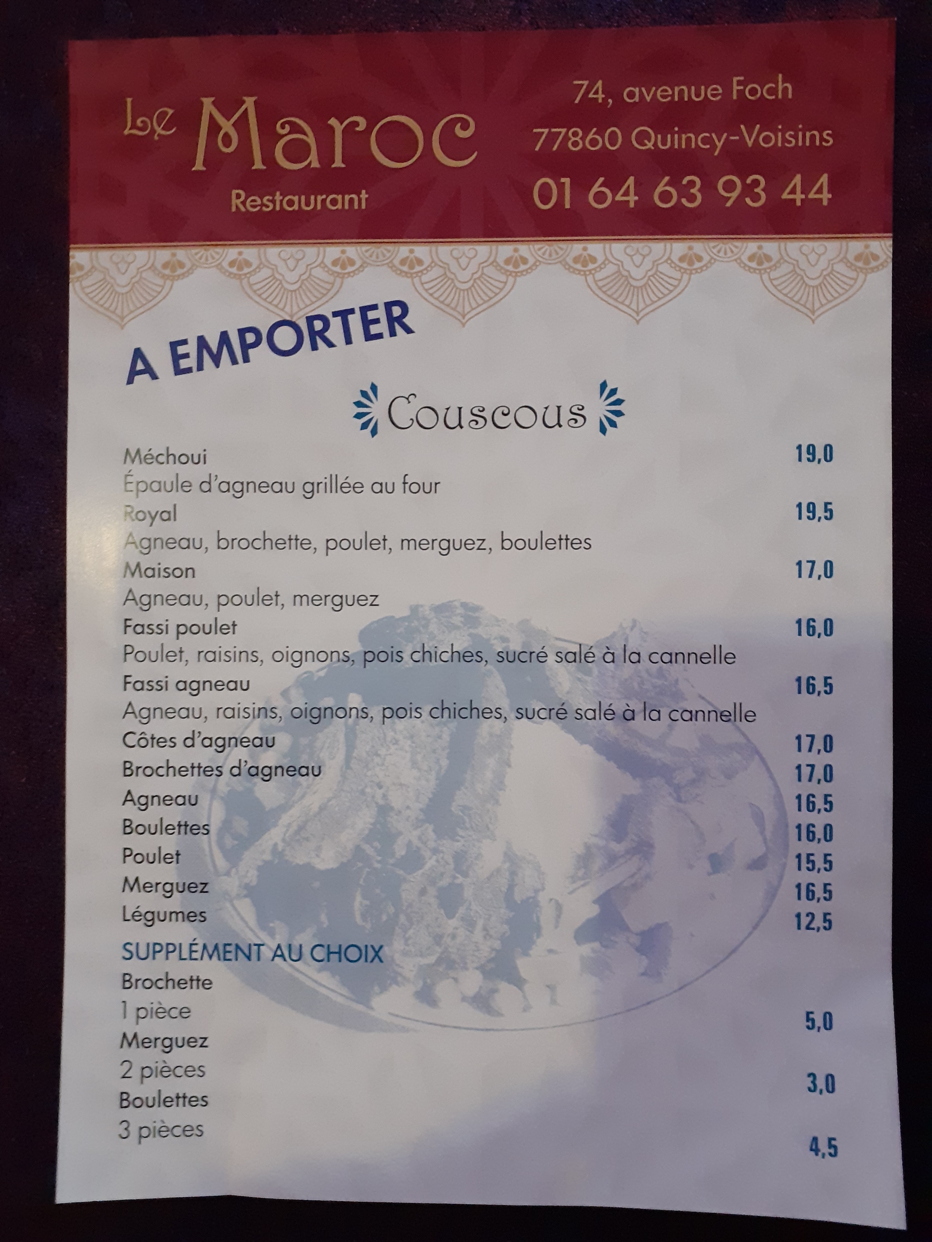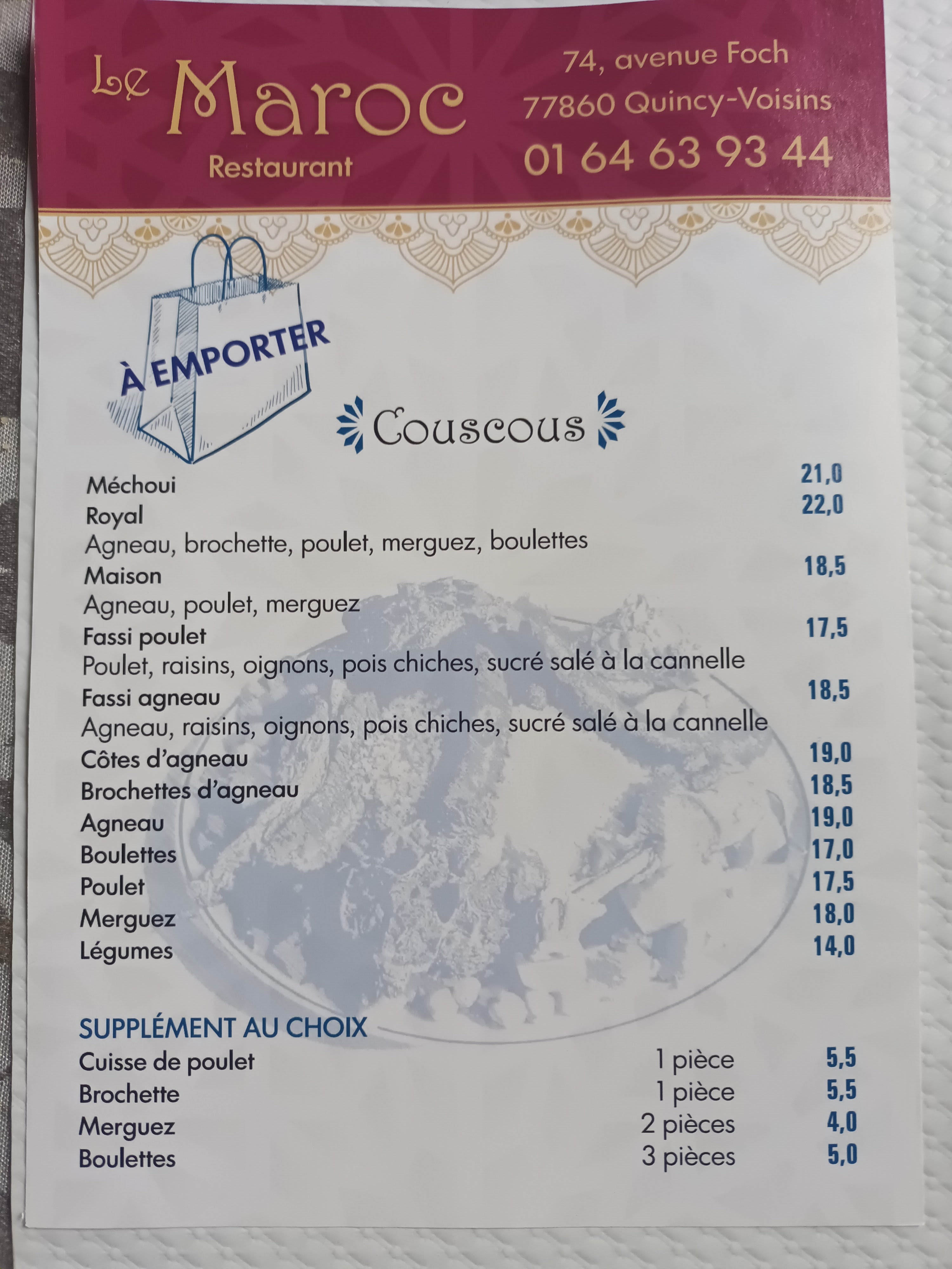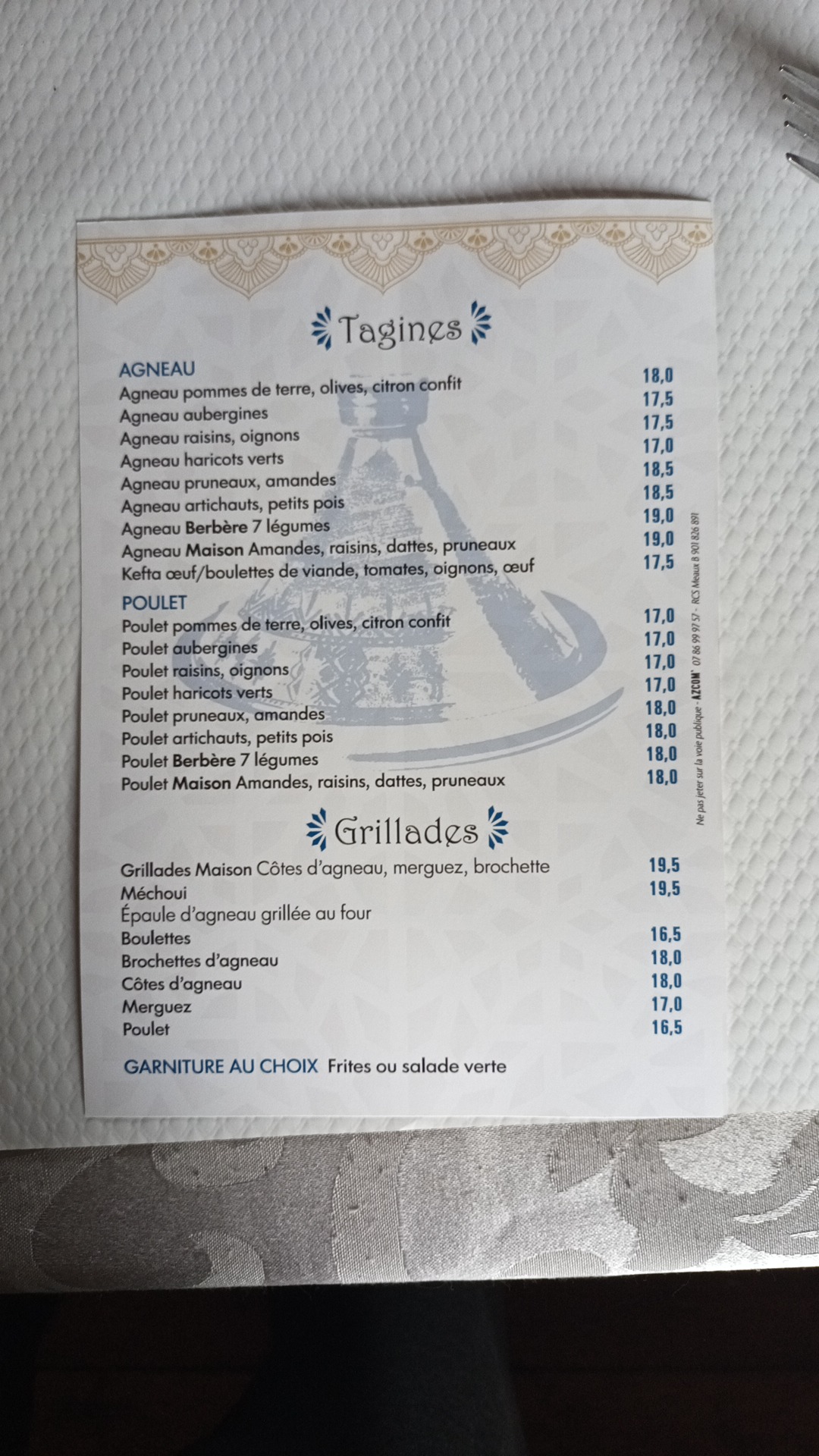 Quelle découverte !!! Le décor vous met de suite dans l ambiance La cuisine est delicieuse et copieuse tellement que l on ne vous refuse pas un doggy bag Le couscous maison : un régal Tajines : pareil Un petit plaisir si vous avez encore un peu de place : les succulentes pâtisseries orientales Le patron et les serveurs sont tous agréables et souriants au petits soins mêmes Bref vous l'aurez compris n hésitez pas et laissez vous séduire vous ne le regretterez pas ! Ils sont situés à quincy voisins non loin du stade à la place de l ancienne crêperie près du rond-point.