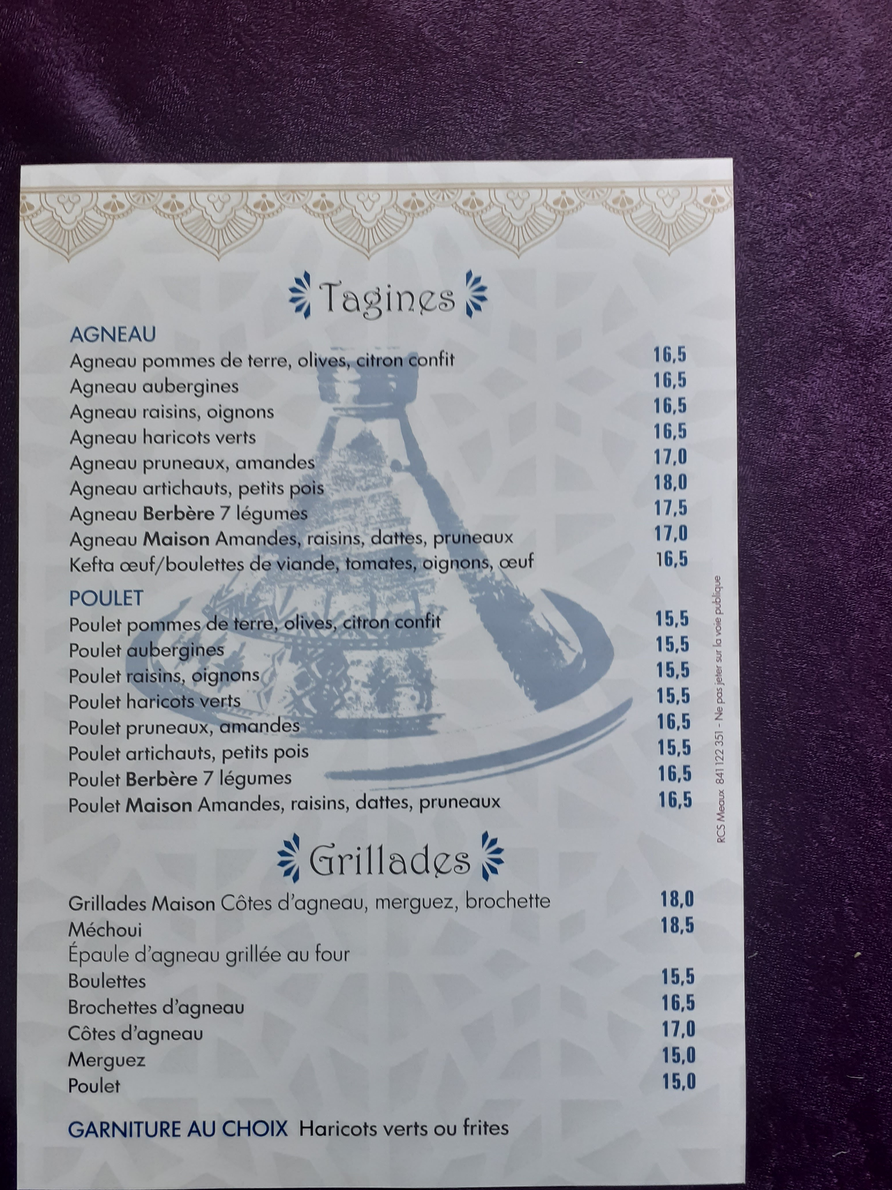 Excellent, parfumé, Tajine maison . En sortant on veut y revenir. Service, rapide et efficace. Ne cherchez pas de serveuse !?! Réservation obligatoire vendredi 20h restaurant plein. Prix bien vu que les plats sont excellents.