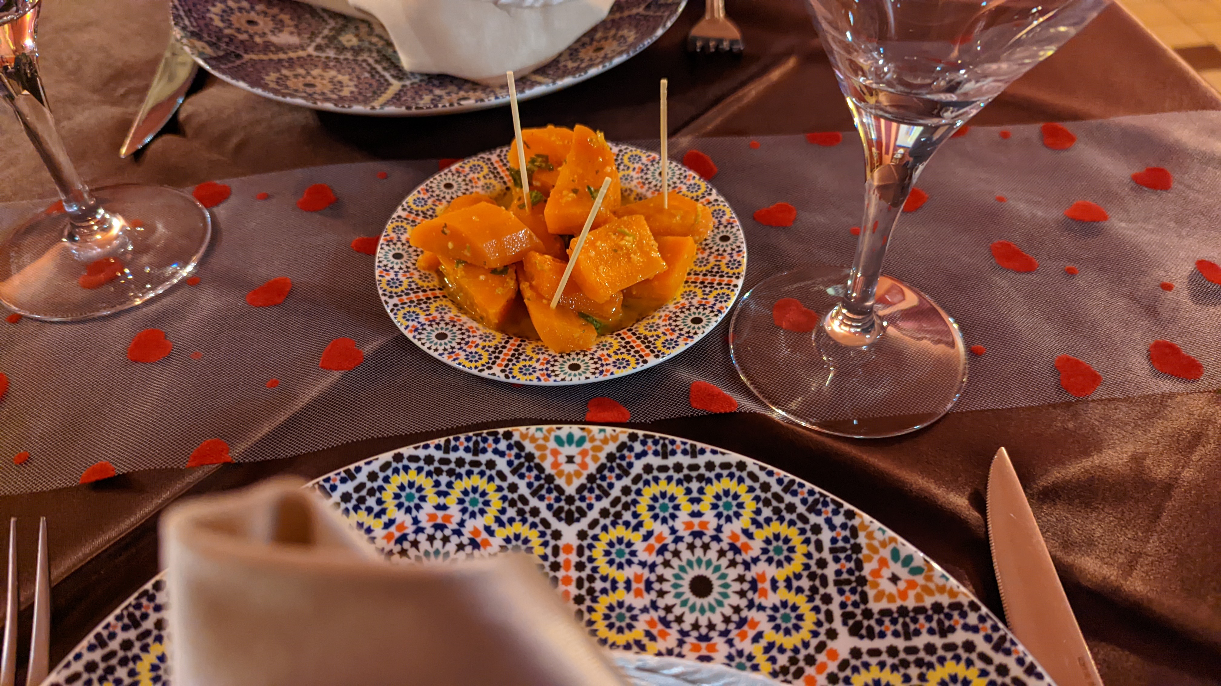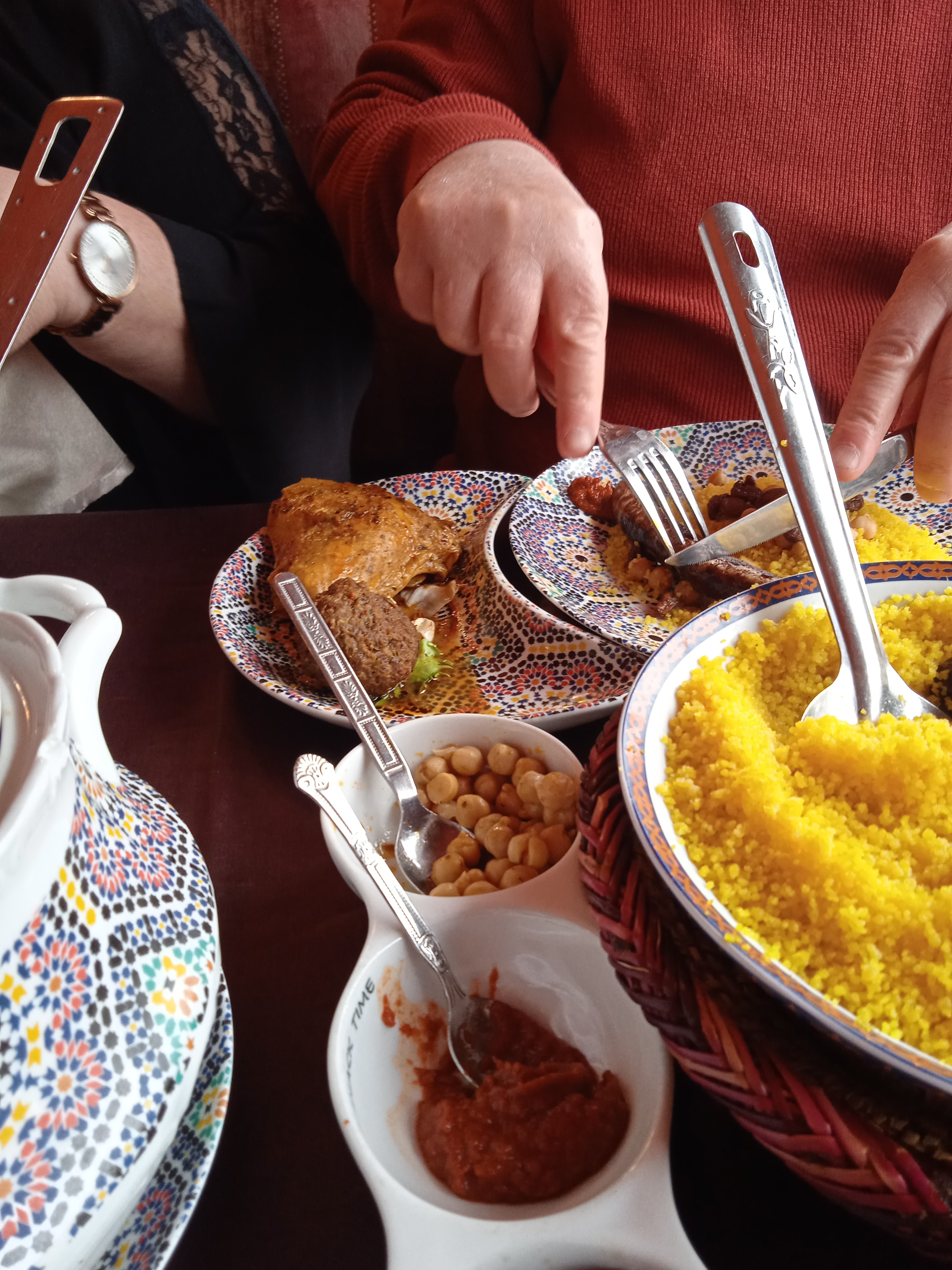 Nous avons teste les couscous maison et brochettes mixtes qui étaient corrects mais sans plus au niveau gustatifs. Néanmoins, très bien servi, copieux et belle présentation dans de très belles assiettes tres colorées!!! Le service parfait, les serveuses souriantes et agréables. Le petit plus, le lieu car vous partez pour un agréable voyage à Marrakech. On termine le menu par le thé menthe traditionnel excellent.